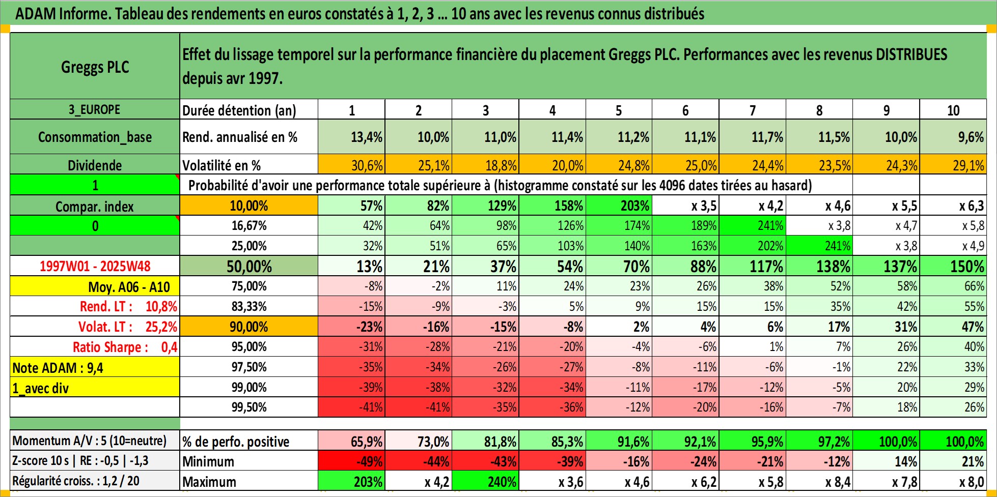 Site dédié aux investisseursPage dédiée sur site financeAnalyse des valorisations hebdomadaires de l'action Greggs PLC. Cet actif est cote en GBX. Les valorisations sont en contrevaleur EURO et couvrent les semaines 1997W01 a 2025W48. Les revenus de cet actif financier sont pris en compte depuis la semaine 1997W16. La note ESG de cet actif n'est pas connue.