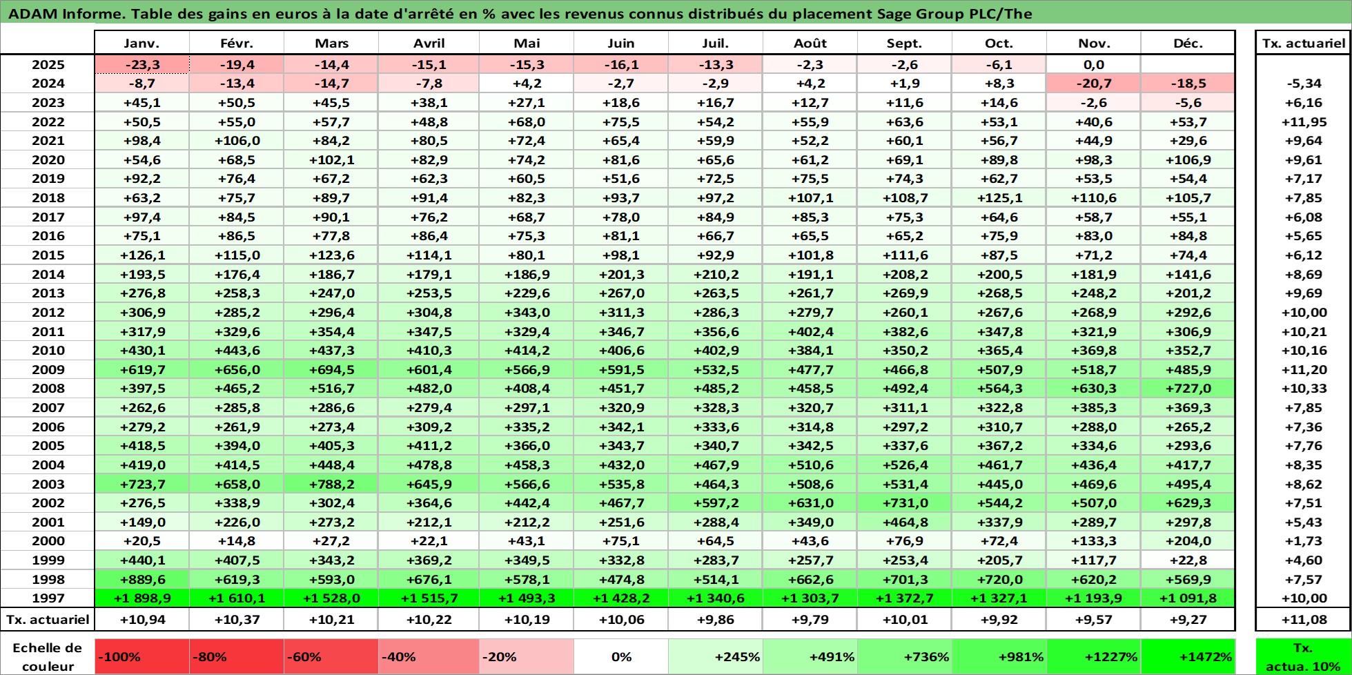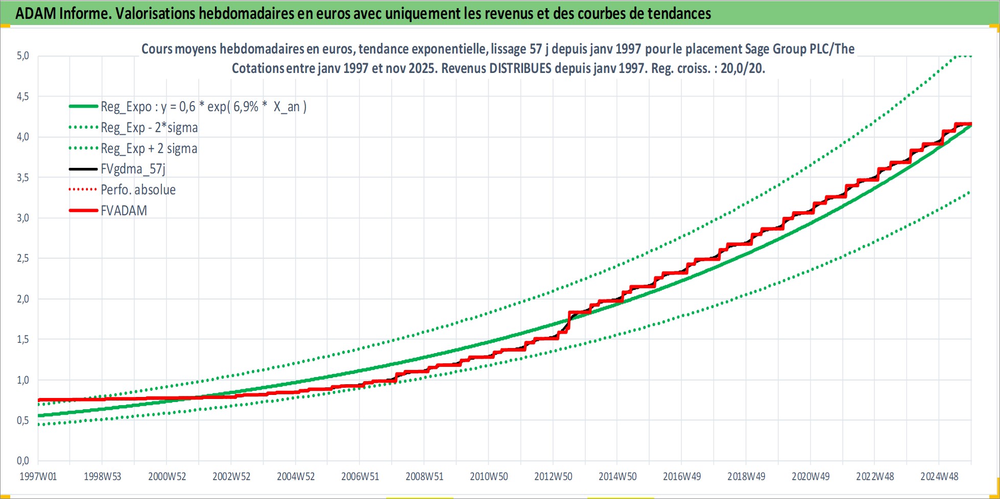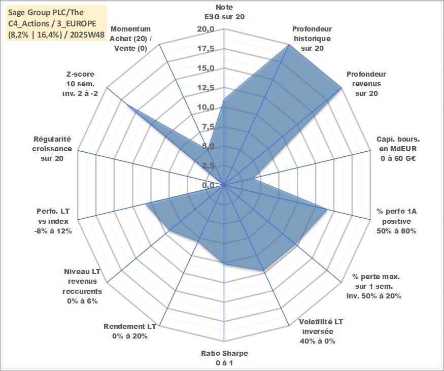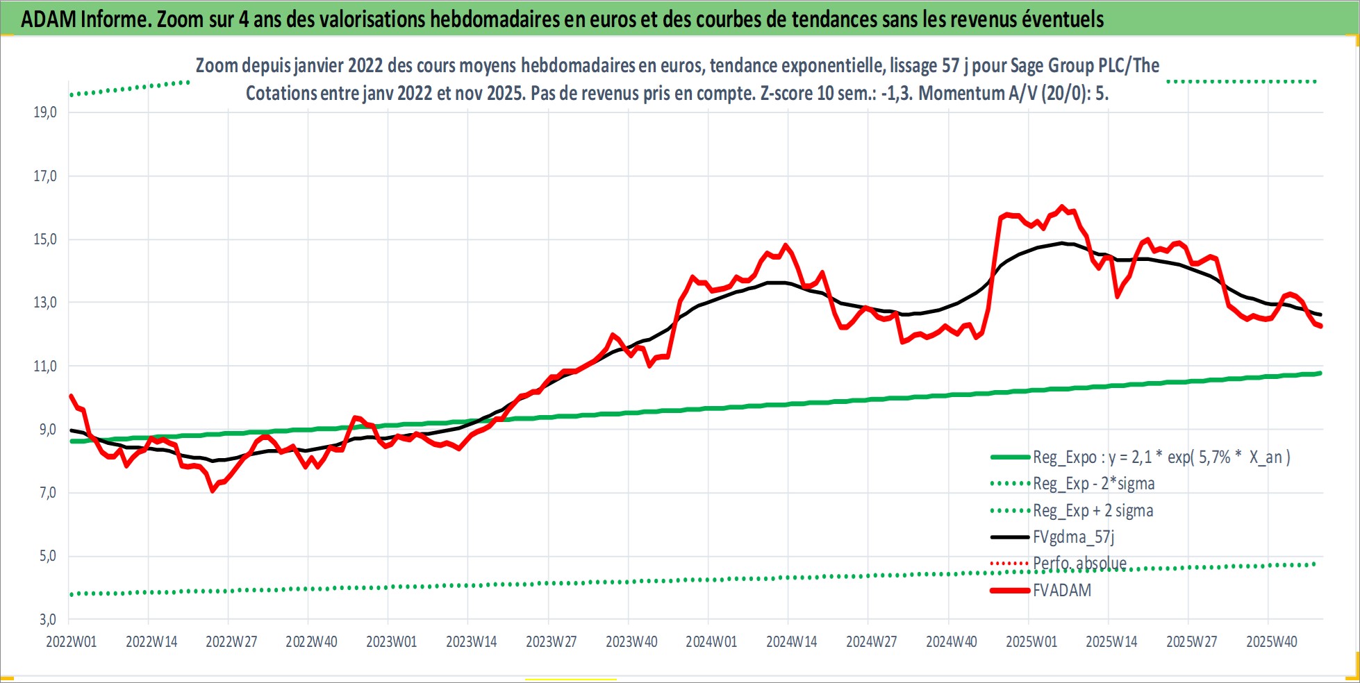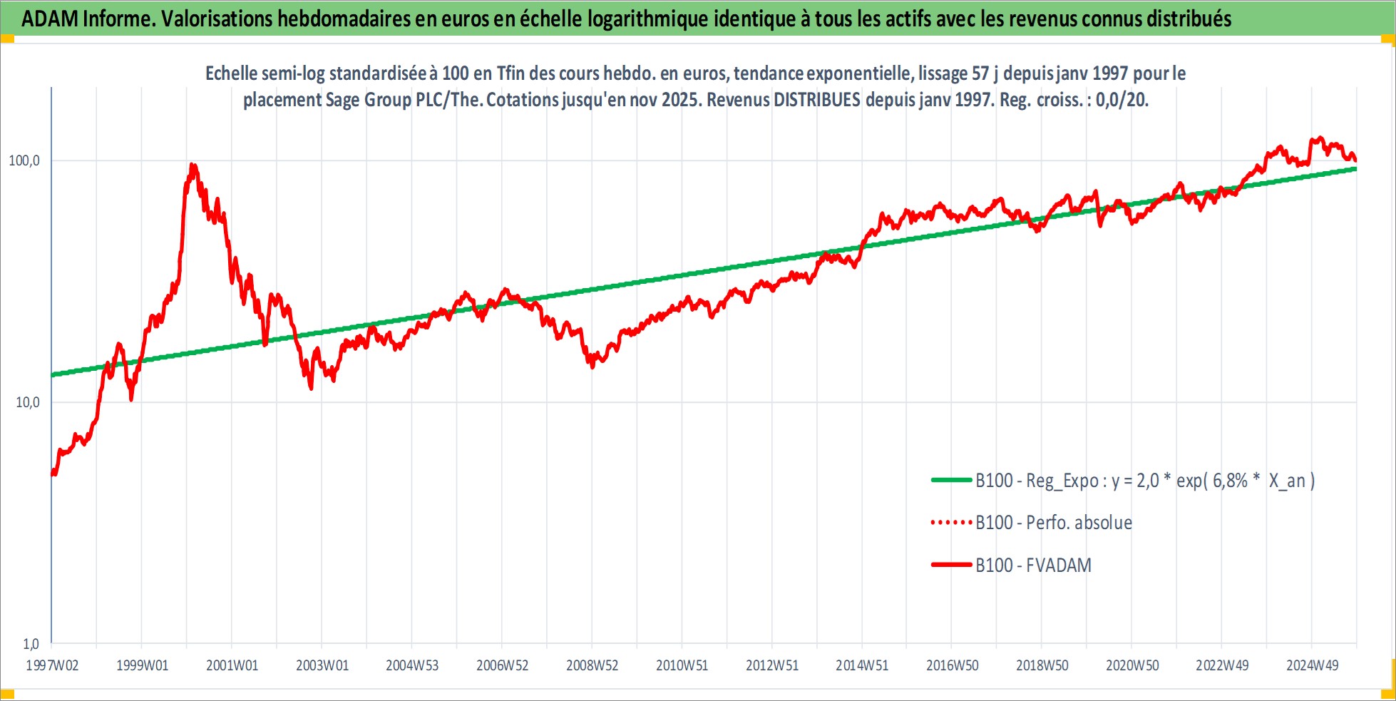 Site dédié aux investisseursPage dédiée sur site financeAnalyse des valorisations hebdomadaires de l'action Sage Group PLC/The. Cet actif est cote en GBX. Les valorisations sont en contrevaleur EURO et couvrent les semaines 1997W01 a 2025W48. Les revenus de cet actif financier sont pris en compte depuis la semaine 1997W04. La note globale ESG de cet actif est estimee a 11.0 (apres rebasage entre 0 et 20).