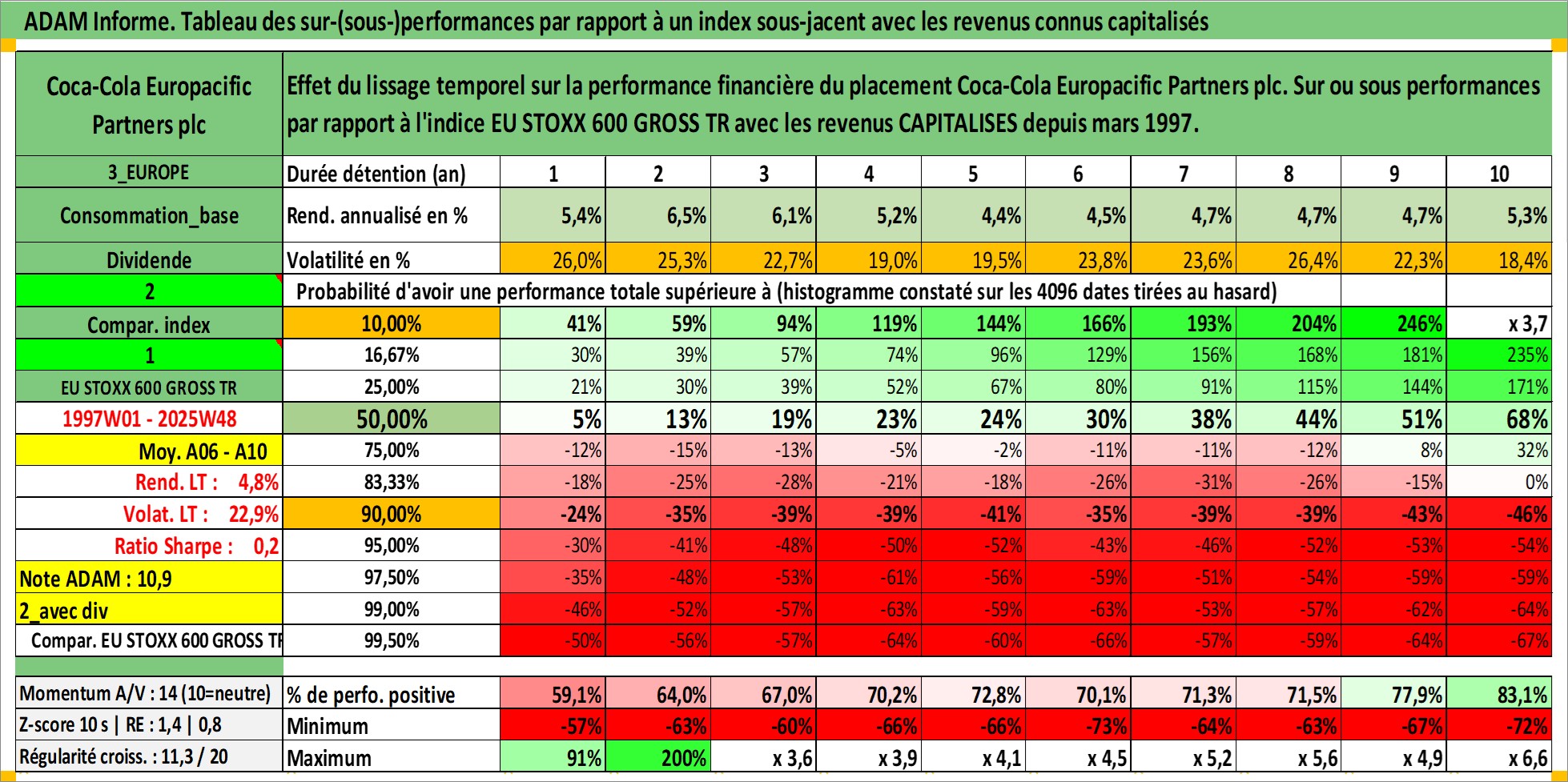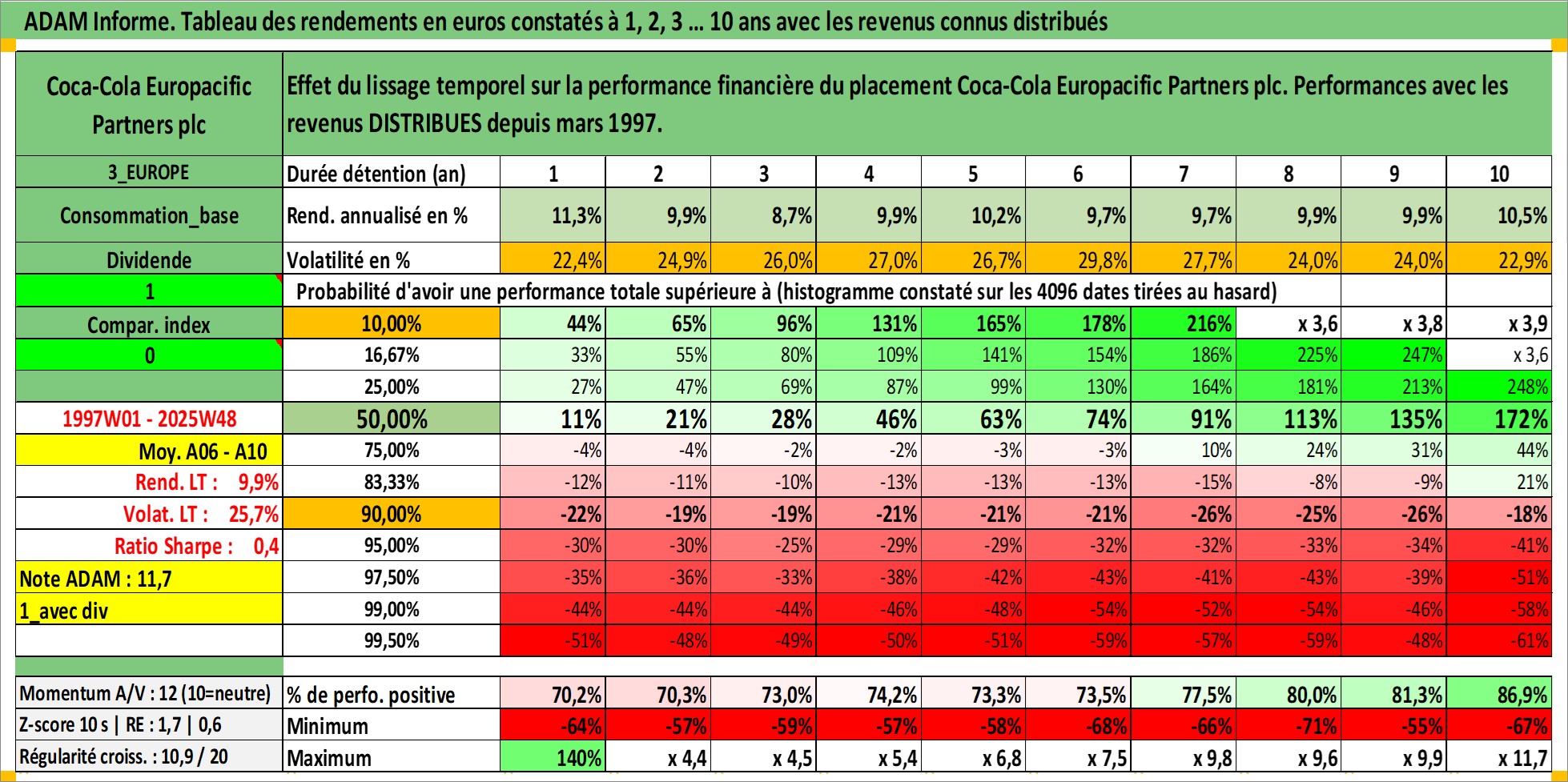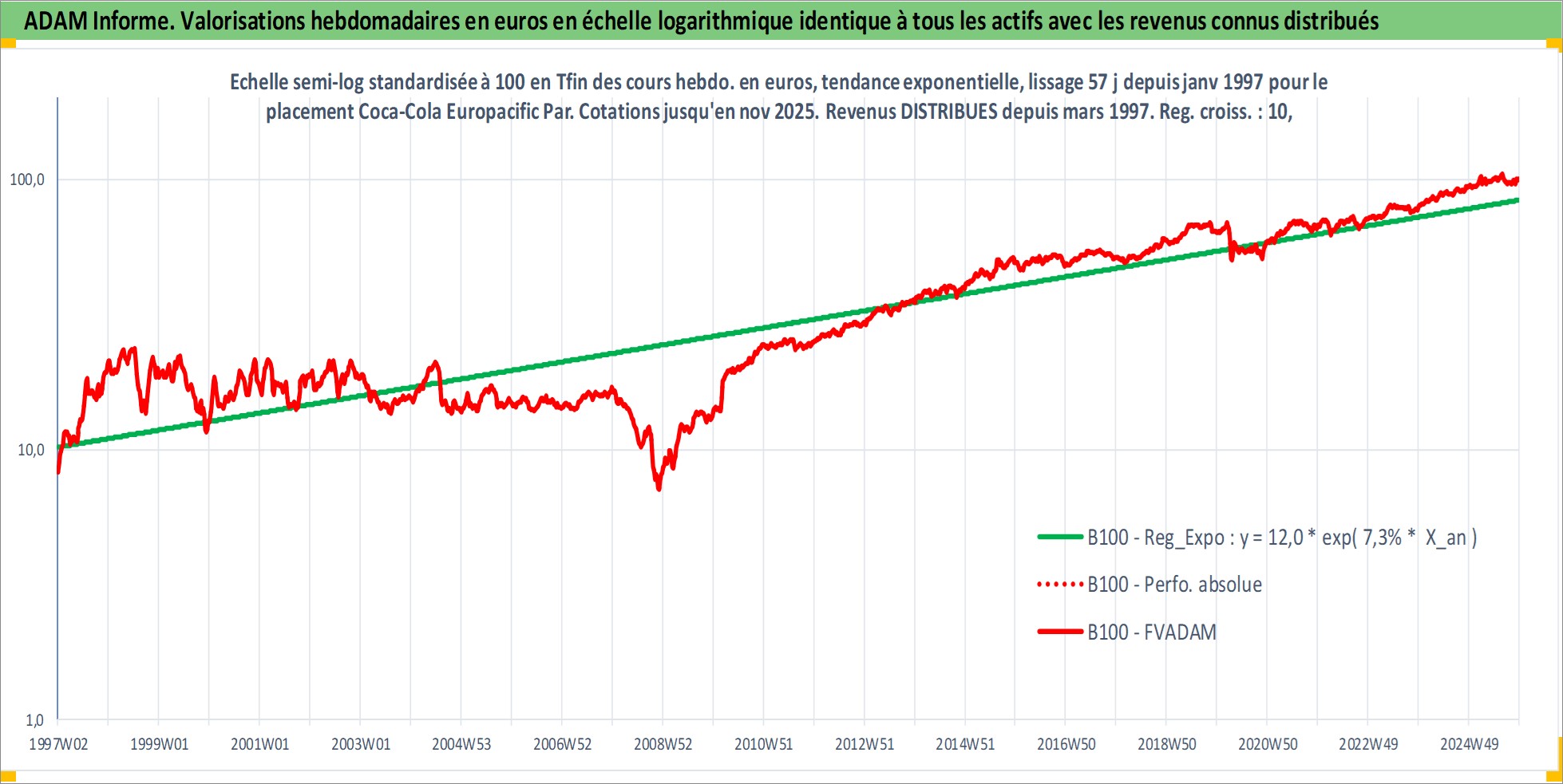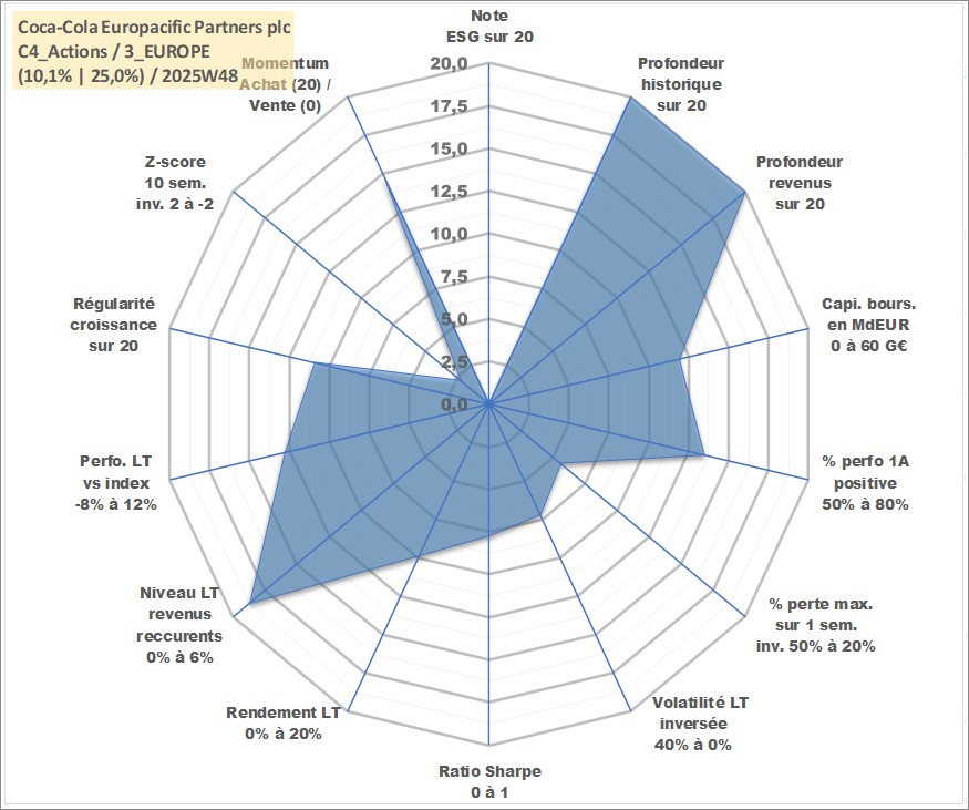 Site dédié aux investisseursPage dédiée sur site financeAnalyse des valorisations hebdomadaires de l'action Coca-Cola Europacific Partners plc. Cet actif est cote en USD. Les valorisations sont en contrevaleur EURO et couvrent les semaines 1997W01 a 2025W48. Les revenus de cet actif financier sont pris en compte depuis la semaine 1997W12. La note ESG de cet actif n'est pas connue.
