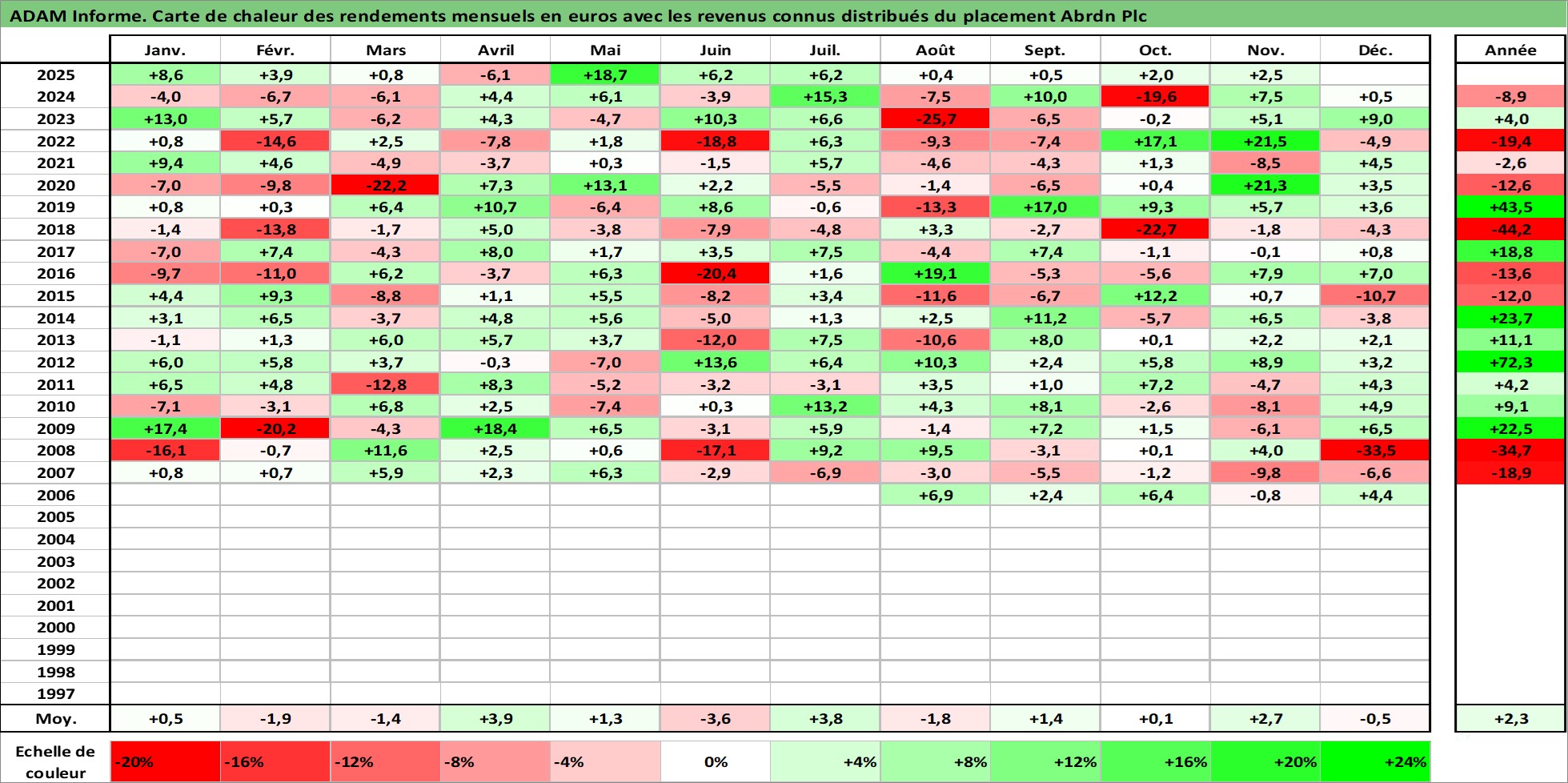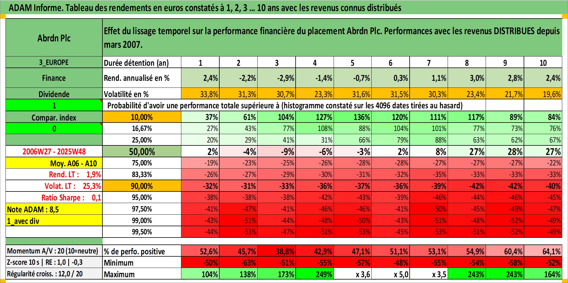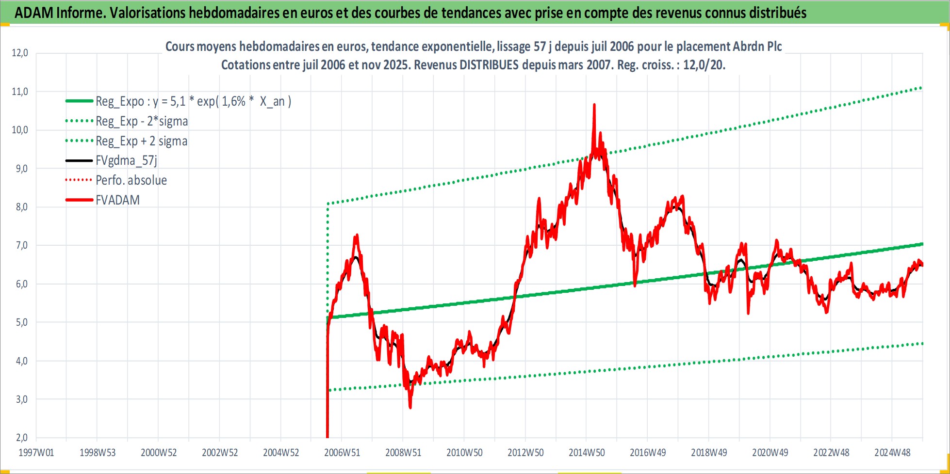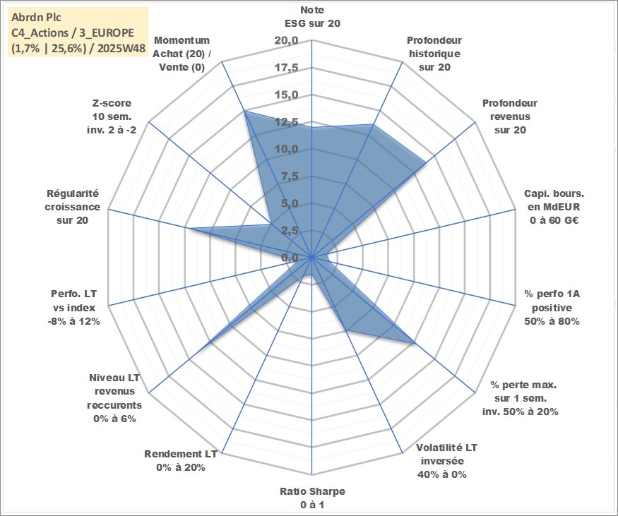Site dédié aux investisseursPage dédiée sur site financeAnalyse des valorisations hebdomadaires de l'action Abrdn Plc. Cet actif est cote en GBX. Les valorisations sont en contrevaleur EURO et couvrent les semaines 2006W27 a 2025W48. Les revenus de cet actif financier sont pris en compte depuis la semaine 2007W13. La note globale ESG de cet actif est estimee a 12.0 (apres rebasage entre 0 et 20).