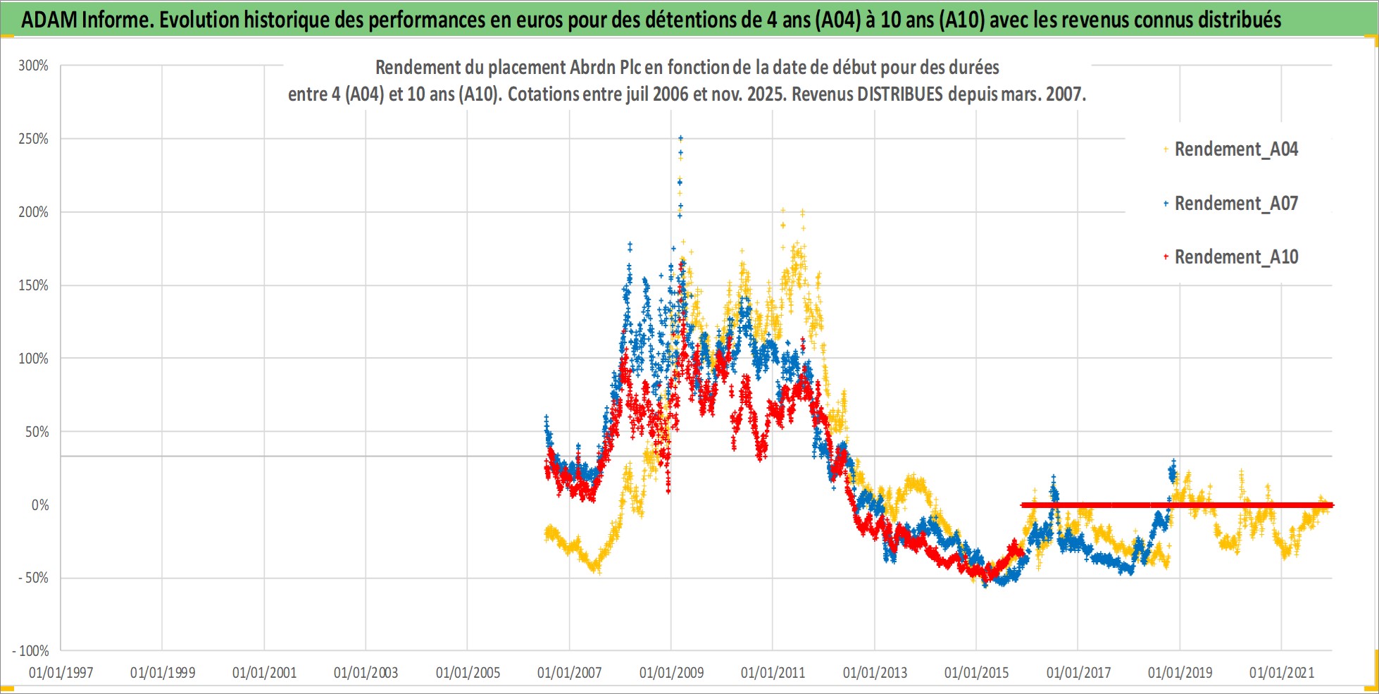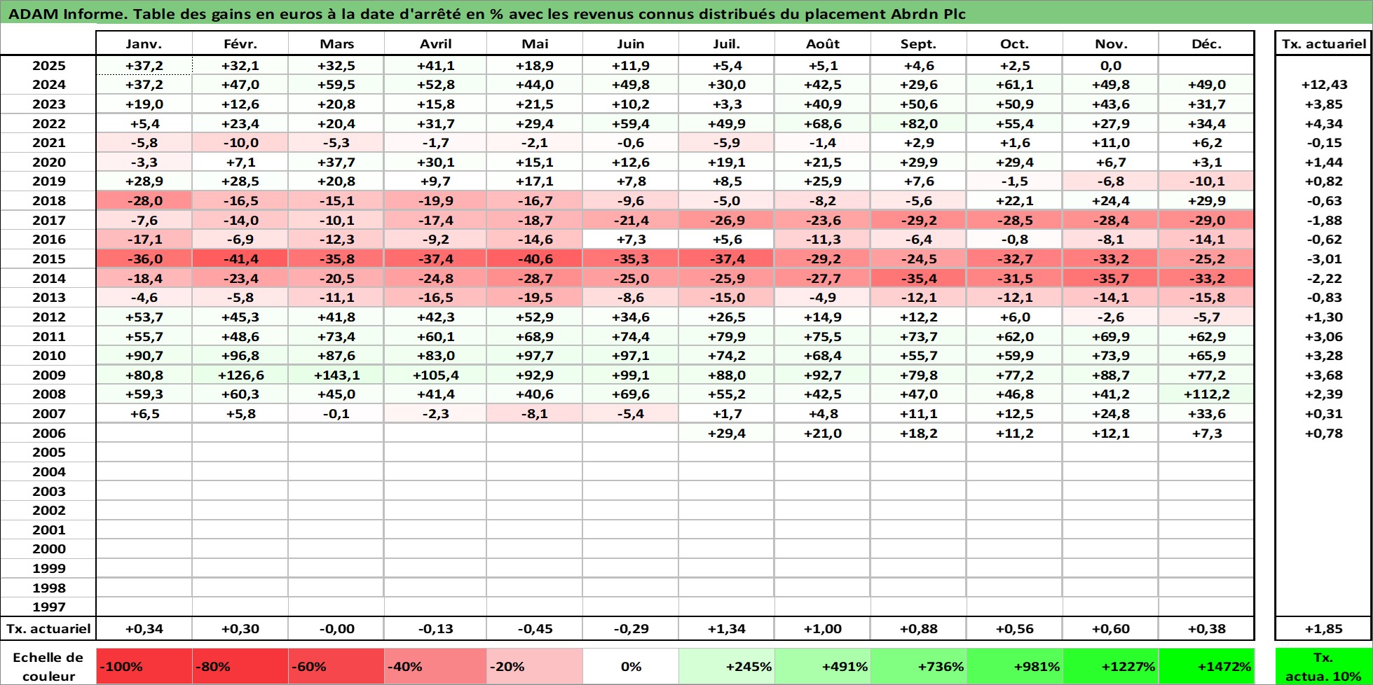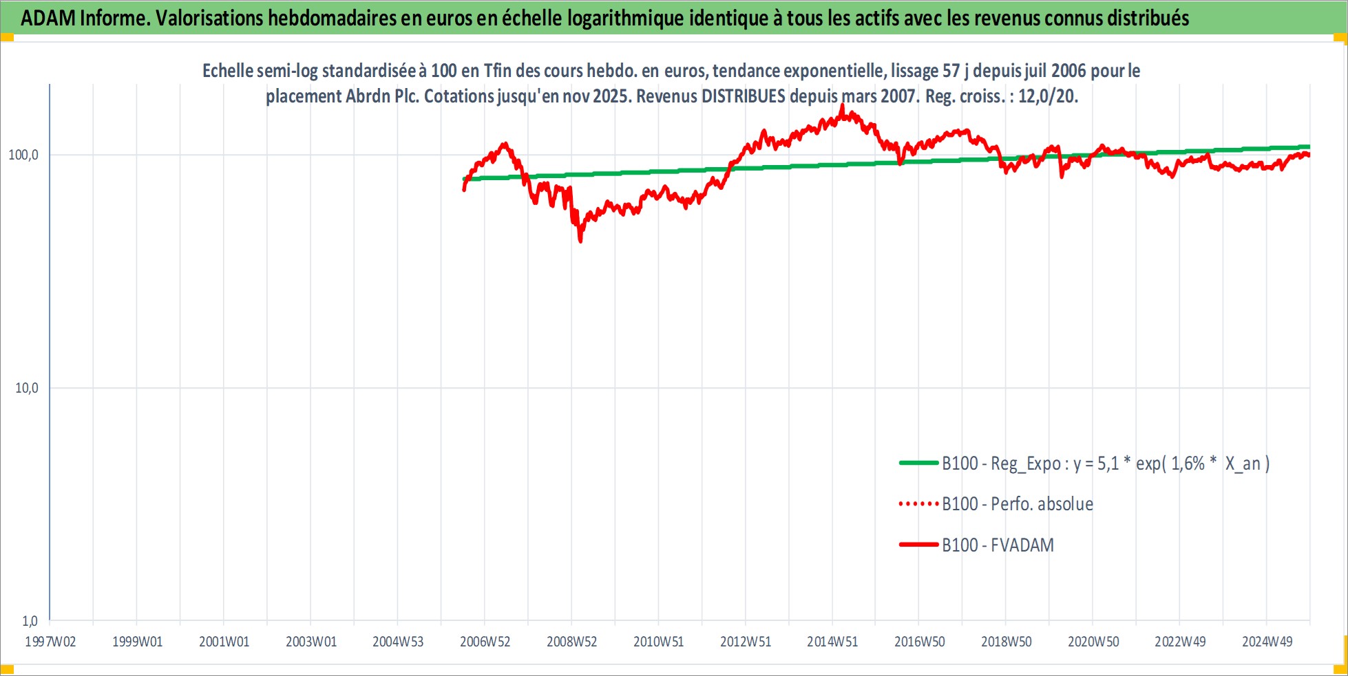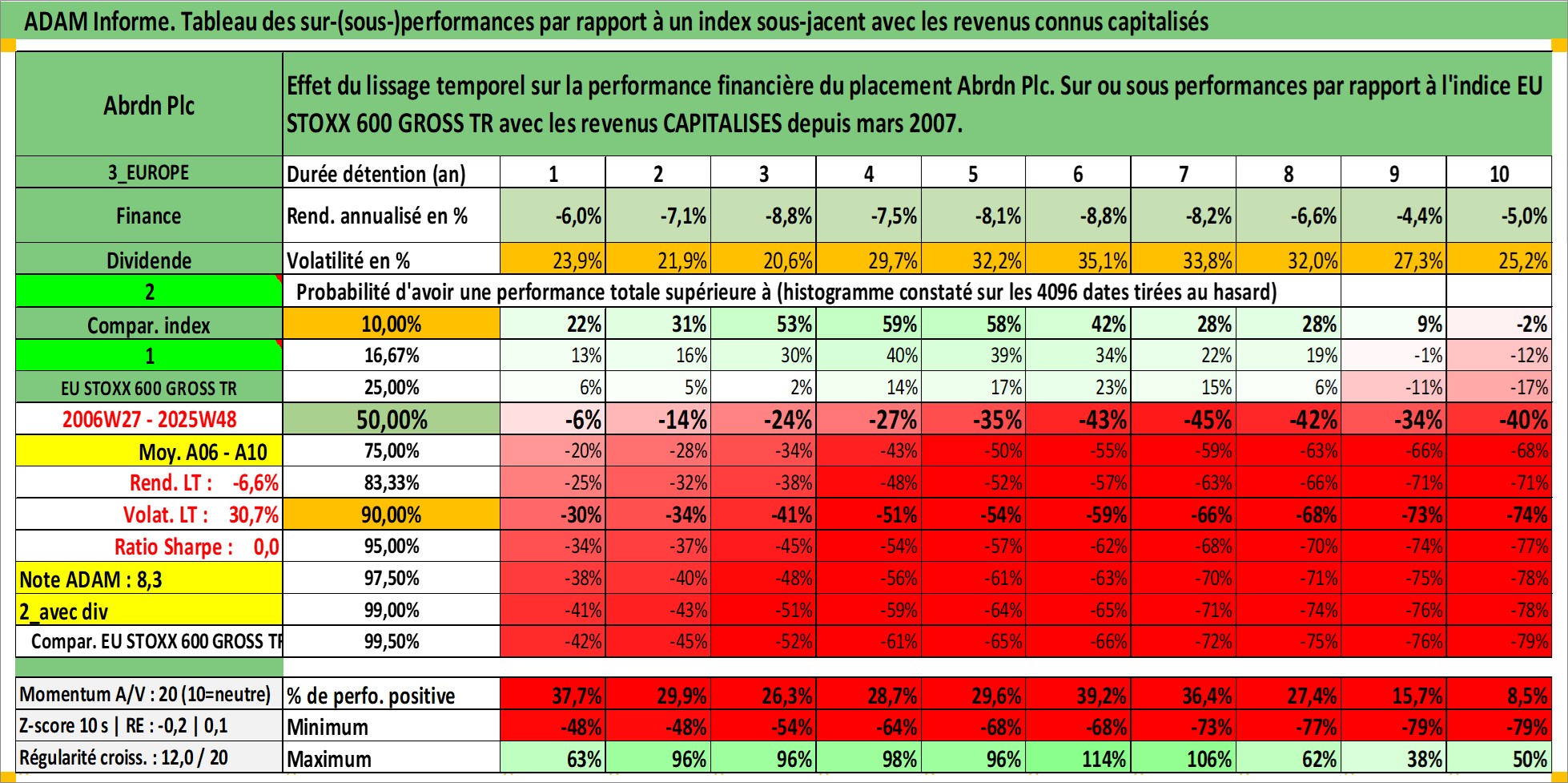 Site dédié aux investisseursPage dédiée sur site financeAnalyse des valorisations hebdomadaires de l'action Abrdn Plc. Cet actif est cote en GBX. Les valorisations sont en contrevaleur EURO et couvrent les semaines 2006W27 a 2025W48. Les revenus de cet actif financier sont pris en compte depuis la semaine 2007W13. La note globale ESG de cet actif est estimee a 12.0 (apres rebasage entre 0 et 20).