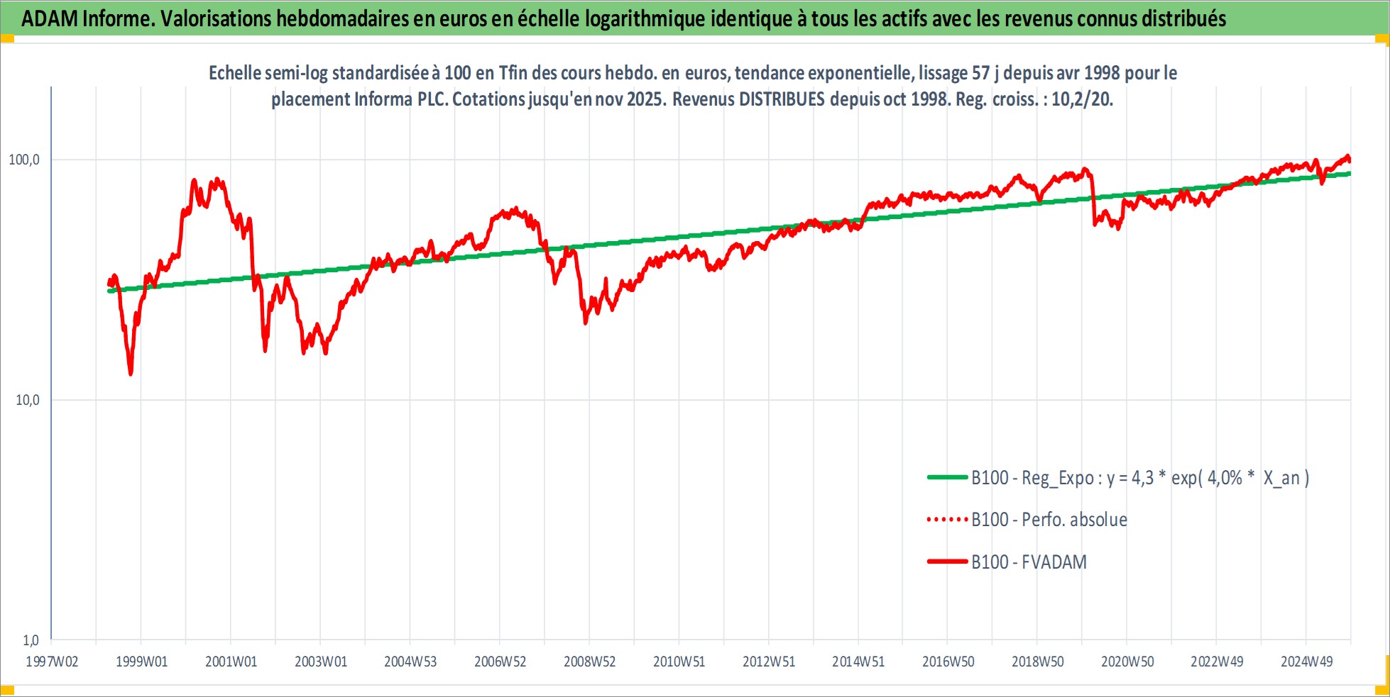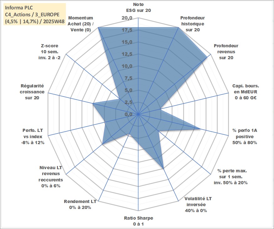 Site dédié aux investisseursPage dédiée sur site financeAnalyse des valorisations hebdomadaires de l'action Informa PLC. Cet actif est cote en GBX. Les valorisations sont en contrevaleur EURO et couvrent les semaines 1998W16 a 2025W48. Les revenus de cet actif financier sont pris en compte depuis la semaine 1998W44. La note globale ESG de cet actif est estimee a 18.0 (apres rebasage entre 0 et 20).