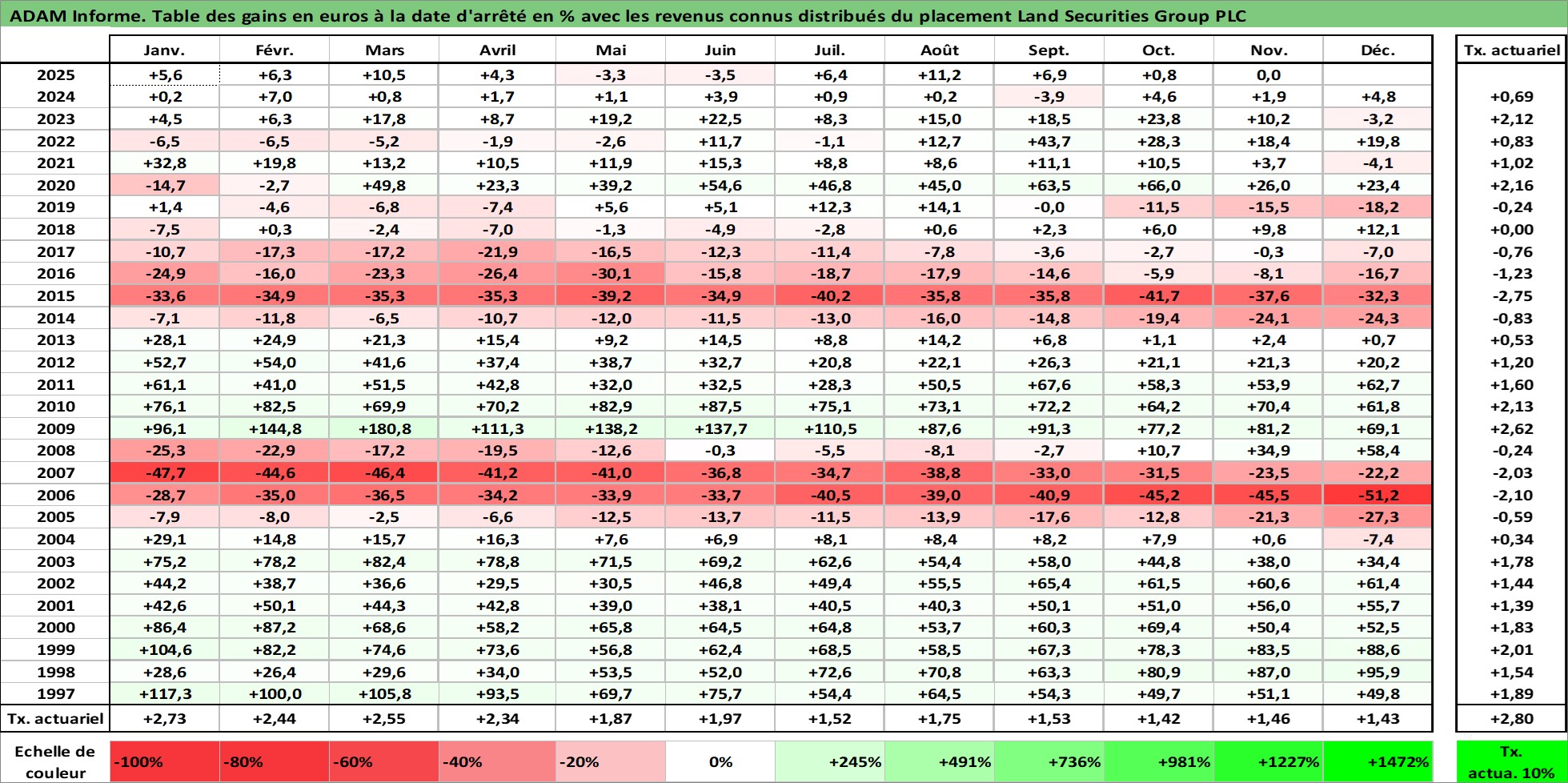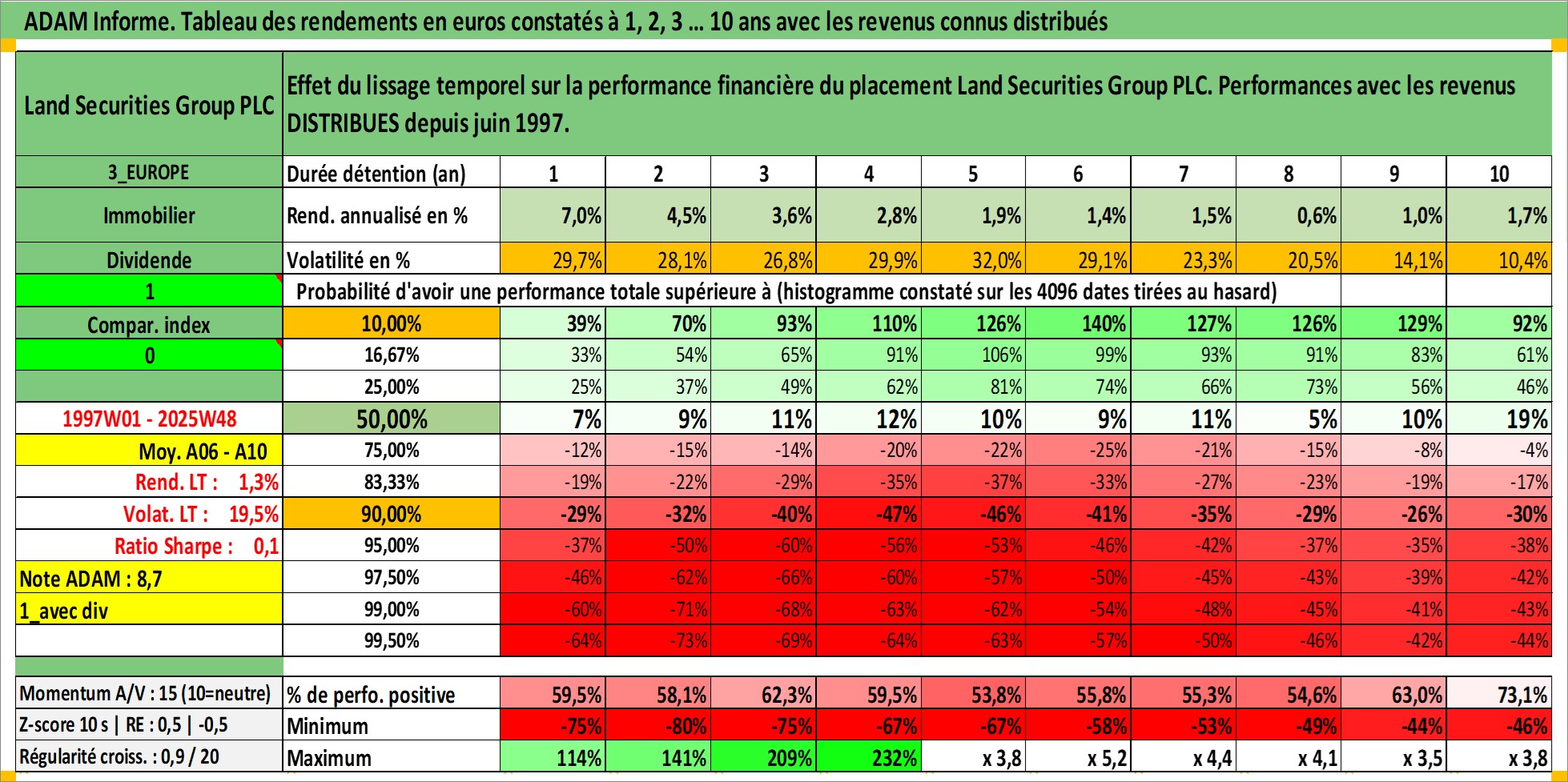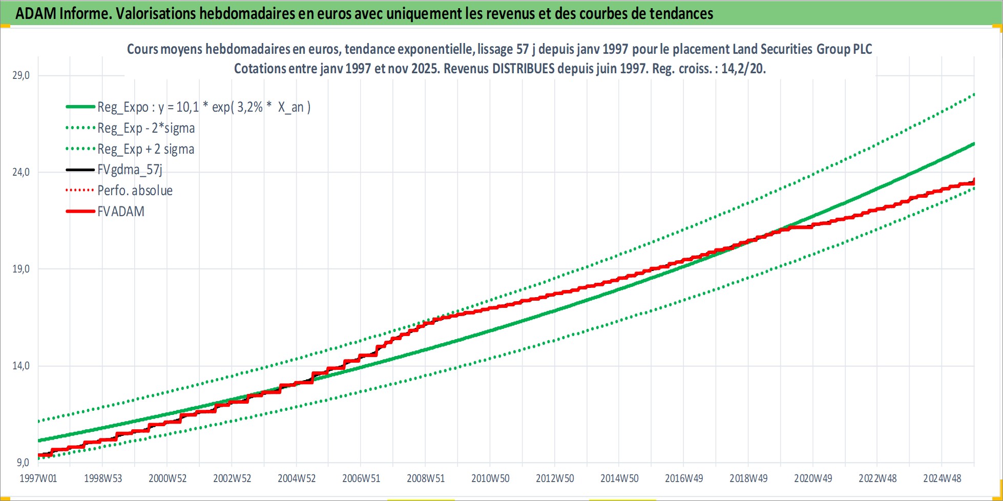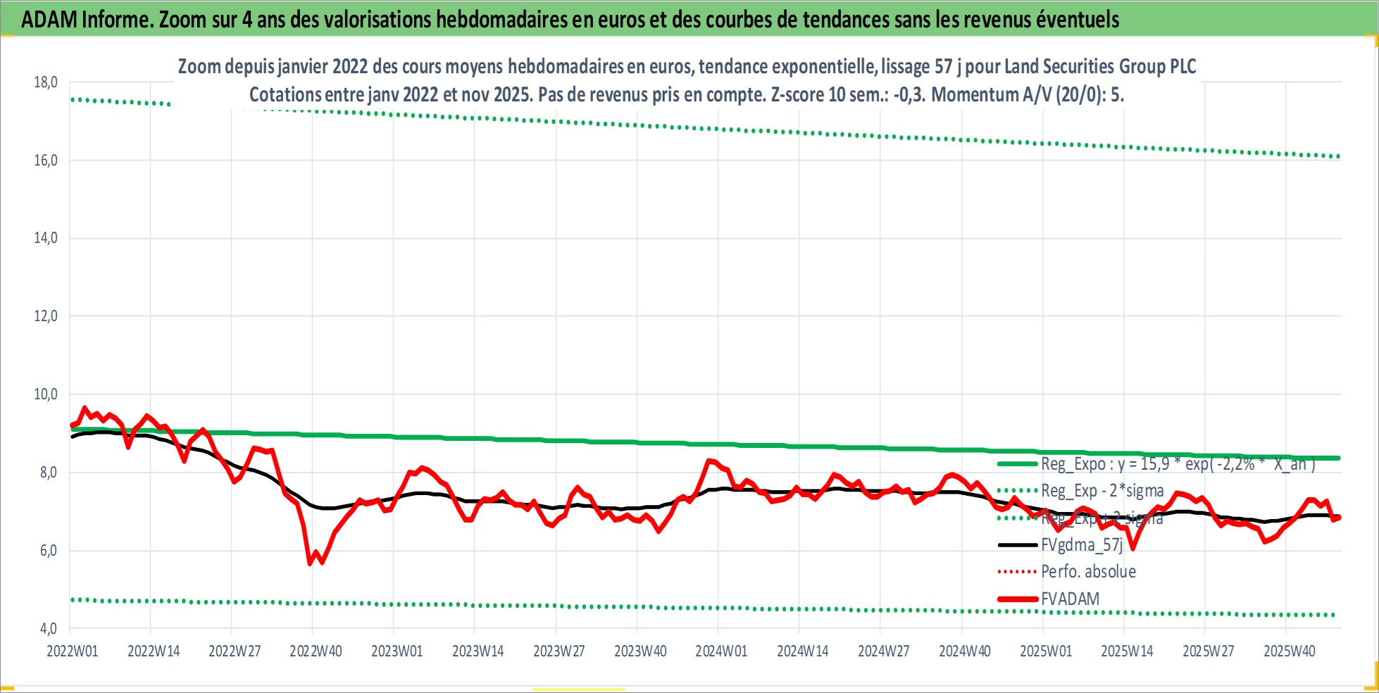 Site dédié aux investisseursPage dédiée sur site financeAnalyse des valorisations hebdomadaires de l'action Land Securities Group PLC. Cet actif est cote en GBX. Les valorisations sont en contrevaleur EURO et couvrent les semaines 1997W01 a 2025W48. Les revenus de cet actif financier sont pris en compte depuis la semaine 1997W23. La note globale ESG de cet actif est estimee a 18.0 (apres rebasage entre 0 et 20).