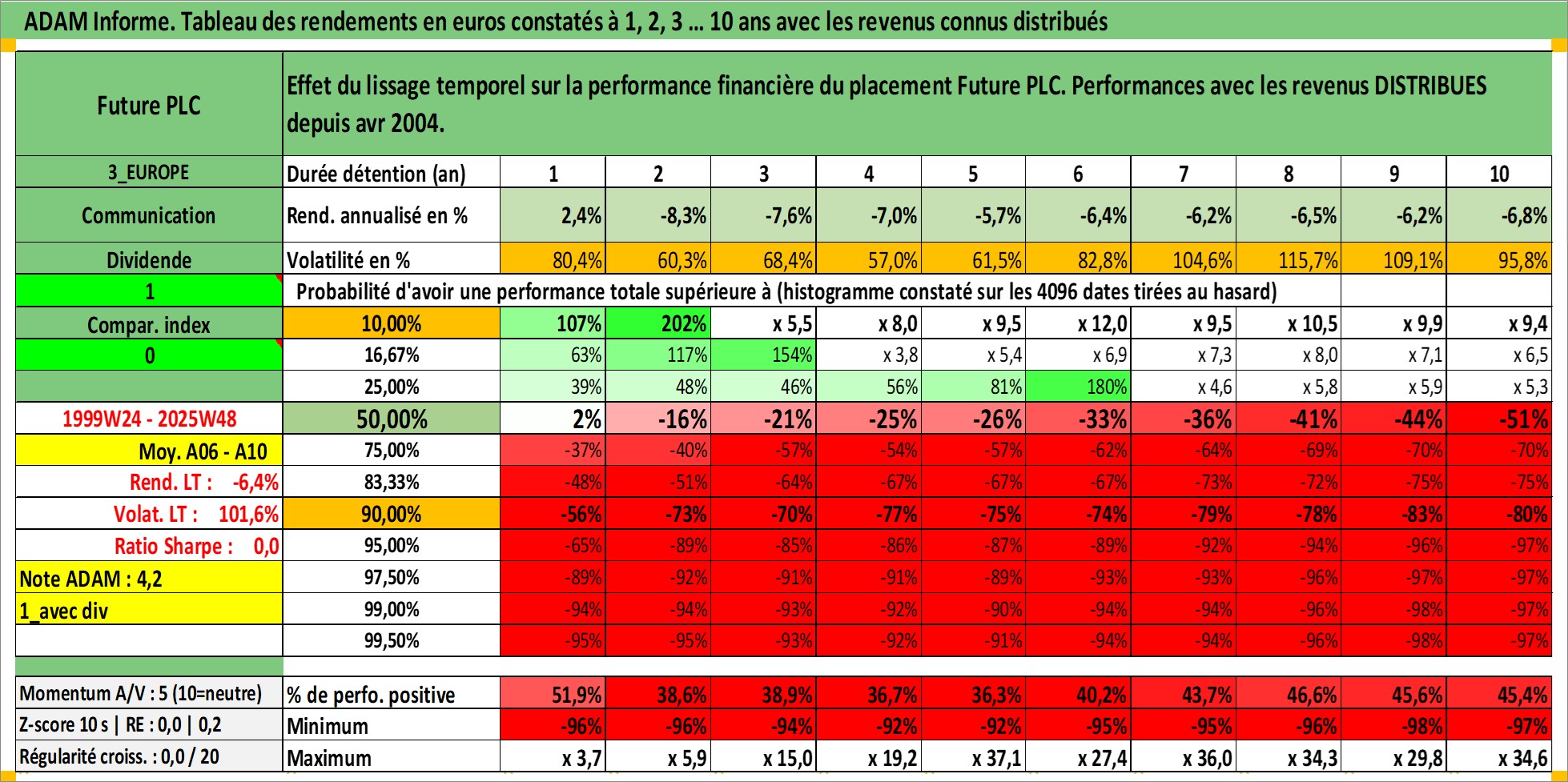 Site dédié aux investisseursPage dédiée sur site financeAnalyse des valorisations hebdomadaires de l'action Future PLC. Cet actif est cote en GBX. Les valorisations sont en contrevaleur EURO et couvrent les semaines 1999W24 a 2025W48. Les revenus de cet actif financier sont pris en compte depuis la semaine 2004W17. La note ESG de cet actif n'est pas connue.