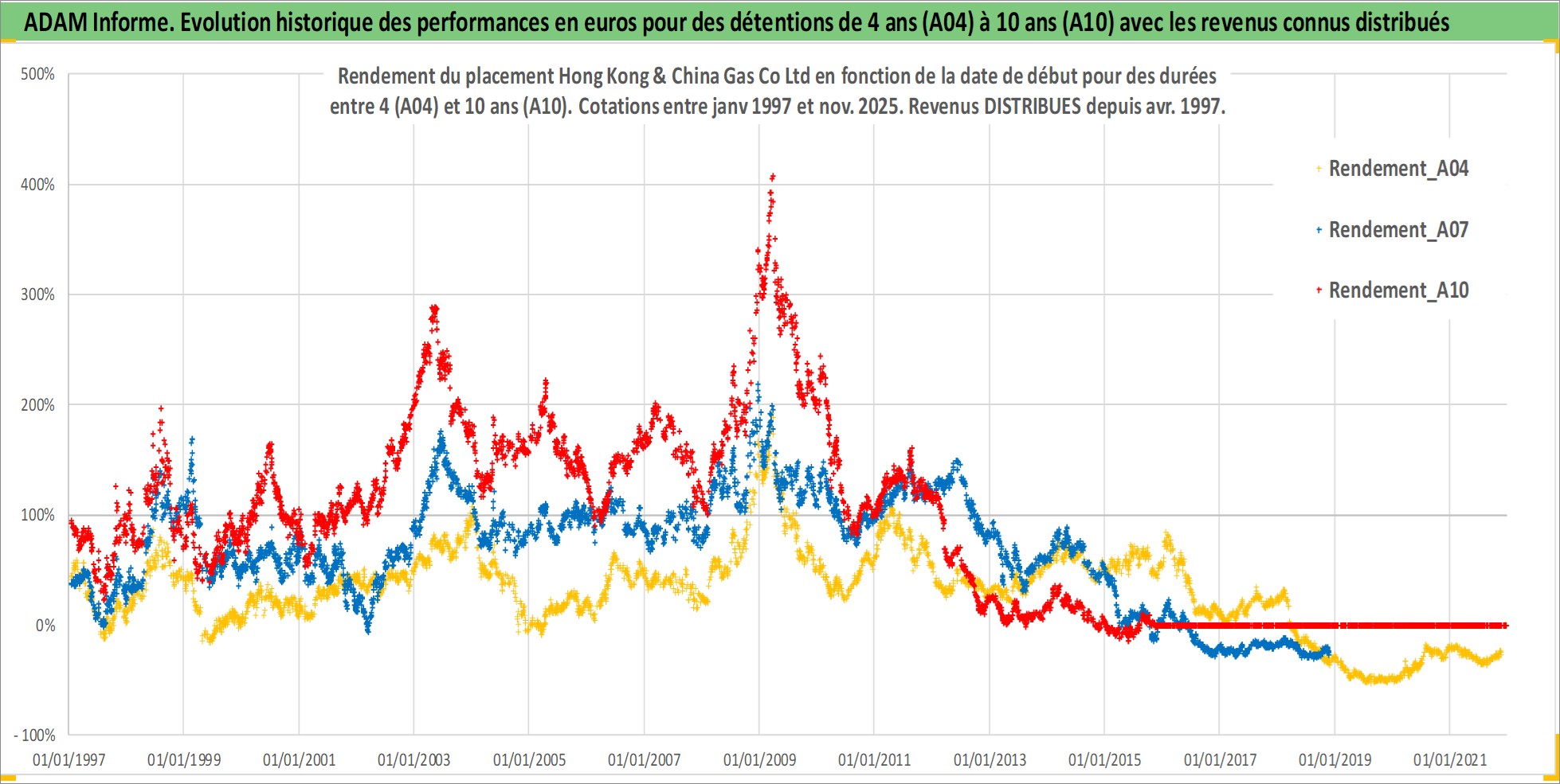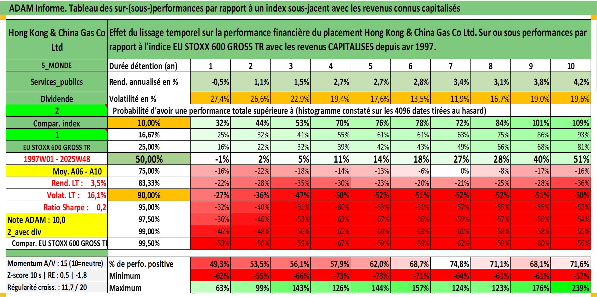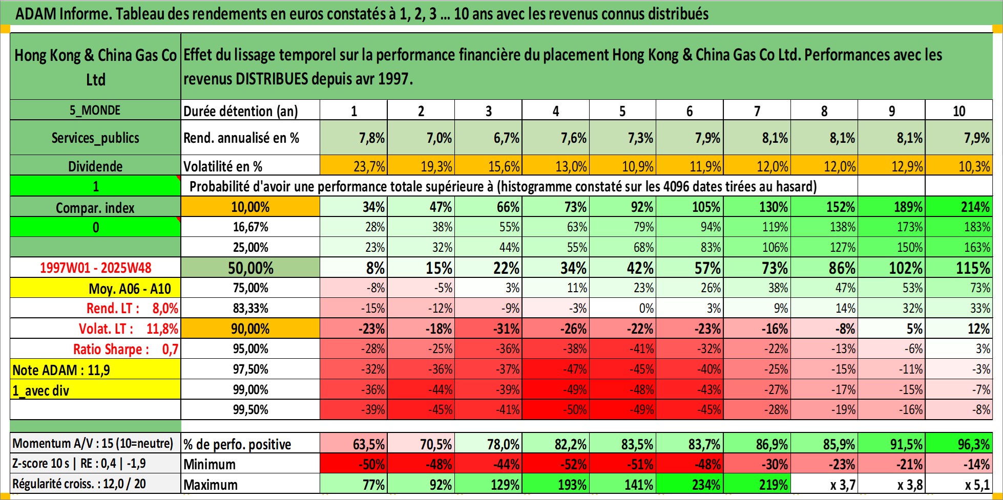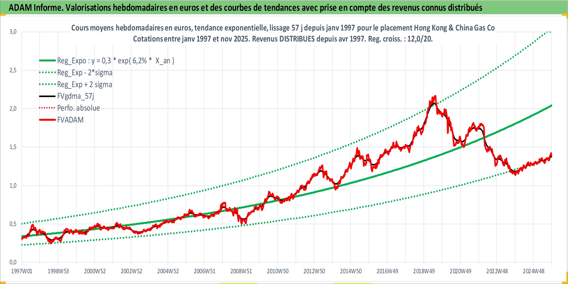 Site dédié aux investisseursPage dédiée sur site financeAnalyse des valorisations hebdomadaires de l'action Hong Kong & China Gas Co Ltd. Cet actif est cote en HKD. Les valorisations sont en contrevaleur EURO et couvrent les semaines 1997W01 a 2025W48. Les revenus de cet actif financier sont pris en compte depuis la semaine 1997W16. La note globale ESG de cet actif est estimee a 10.0 (apres rebasage entre 0 et 20).