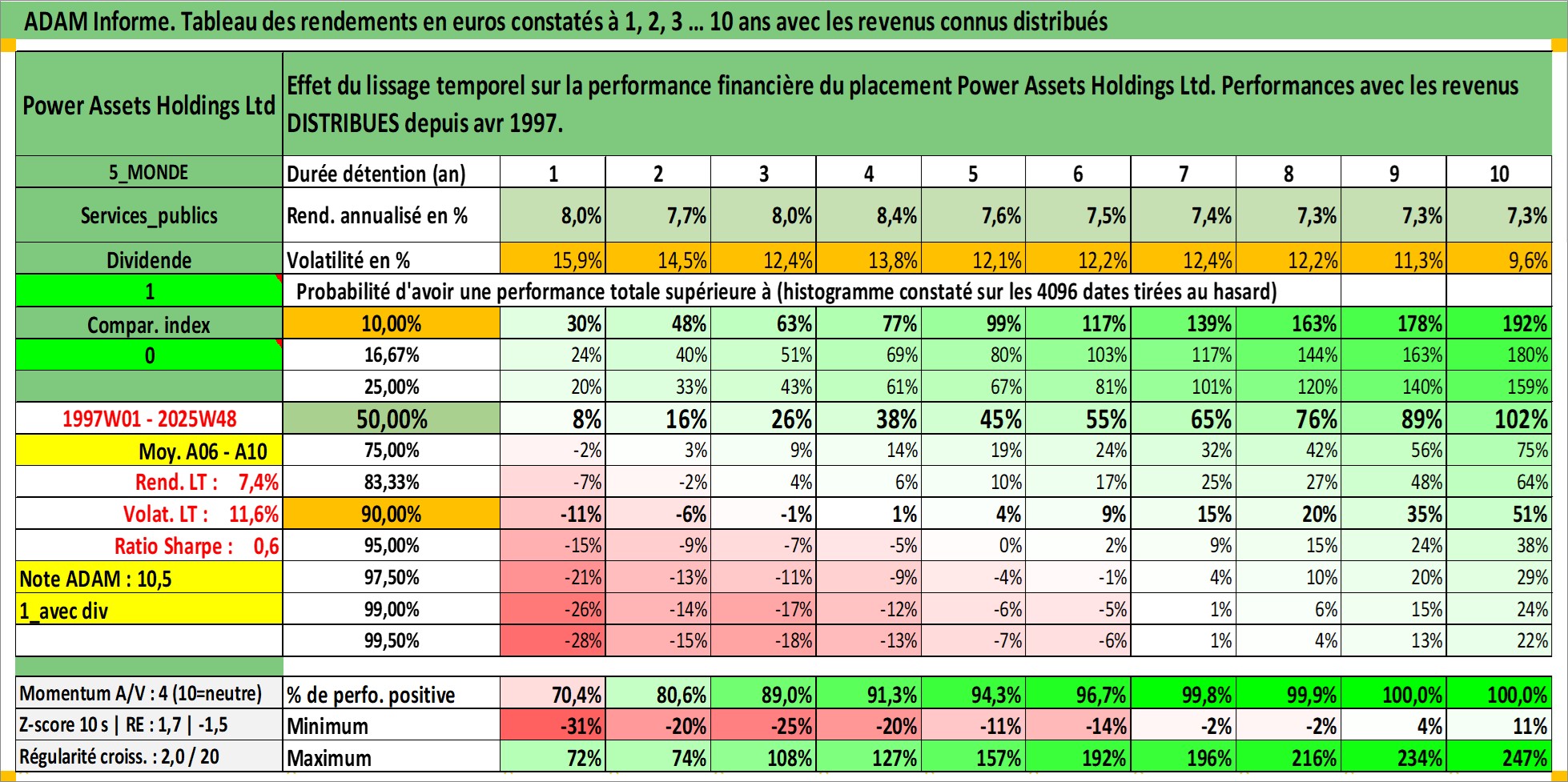 Site dédié aux investisseursPage dédiée sur site financeAnalyse des valorisations hebdomadaires de l'action Power Assets Holdings Ltd. Cet actif est cote en HKD. Les valorisations sont en contrevaleur EURO et couvrent les semaines 1997W01 a 2025W48. Les revenus de cet actif financier sont pris en compte depuis la semaine 1997W18. La note globale ESG de cet actif est estimee a 4.0 (apres rebasage entre 0 et 20).