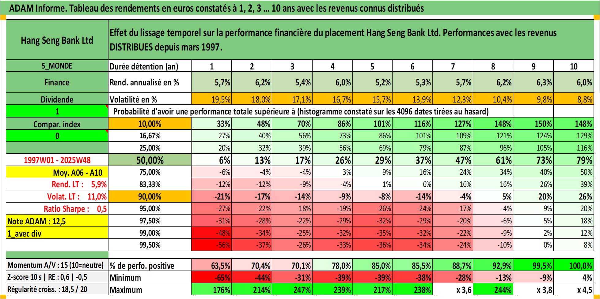 Site dédié aux investisseursPage dédiée sur site financeAnalyse des valorisations hebdomadaires de l'action Hang Seng Bank Ltd. Cet actif est cote en HKD. Les valorisations sont en contrevaleur EURO et couvrent les semaines 1997W01 a 2025W48. Les revenus de cet actif financier sont pris en compte depuis la semaine 1997W13. La note globale ESG de cet actif est estimee a 10.0 (apres rebasage entre 0 et 20).