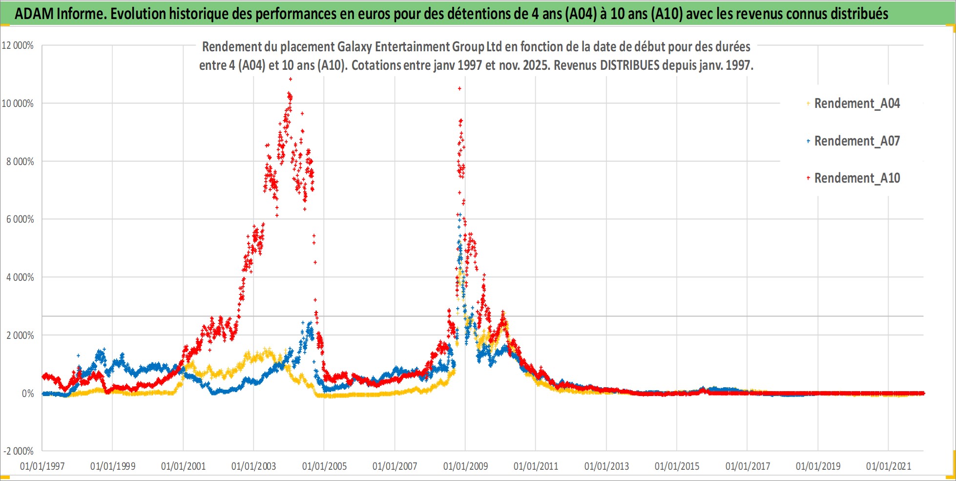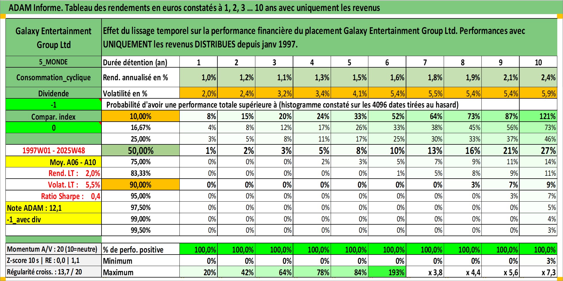 Site dédié aux investisseursPage dédiée sur site financeAnalyse des valorisations hebdomadaires de l'action Galaxy Entertainment Group Ltd. Cet actif est cote en HKD. Les valorisations sont en contrevaleur EURO et couvrent les semaines 1997W01 a 2025W48. Les revenus de cet actif financier sont pris en compte depuis la semaine 1997W01. La note globale ESG de cet actif est estimee a 6.0 (apres rebasage entre 0 et 20).