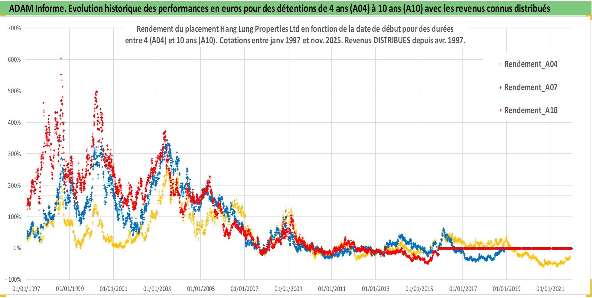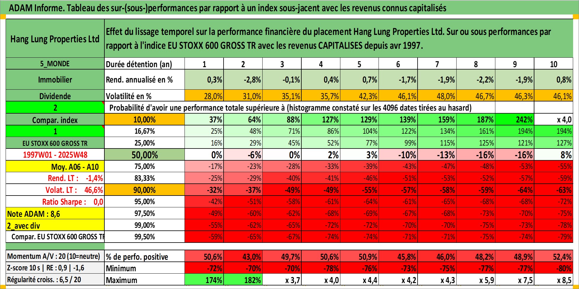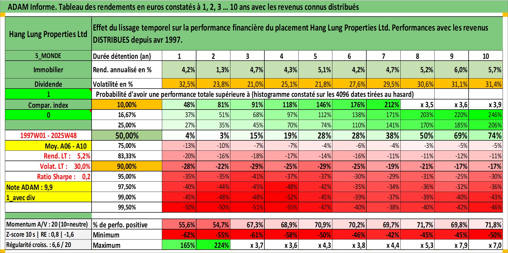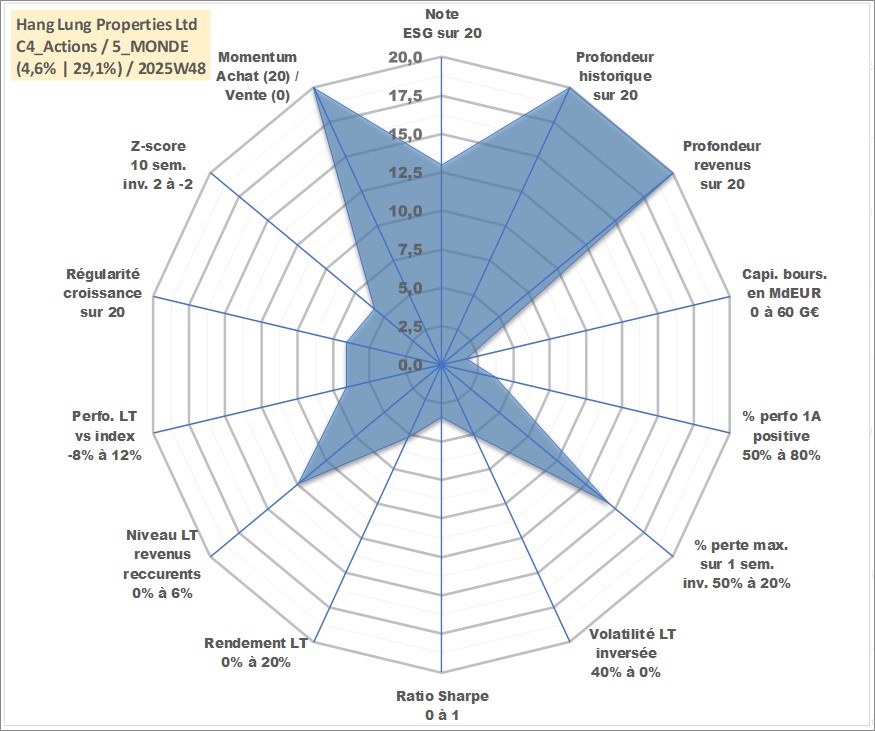 Site dédié aux investisseursPage dédiée sur site financeAnalyse des valorisations hebdomadaires de l'action Hang Lung Properties Ltd. Cet actif est cote en HKD. Les valorisations sont en contrevaleur EURO et couvrent les semaines 1997W01 a 2025W48. Les revenus de cet actif financier sont pris en compte depuis la semaine 1997W15. La note globale ESG de cet actif est estimee a 13.0 (apres rebasage entre 0 et 20).