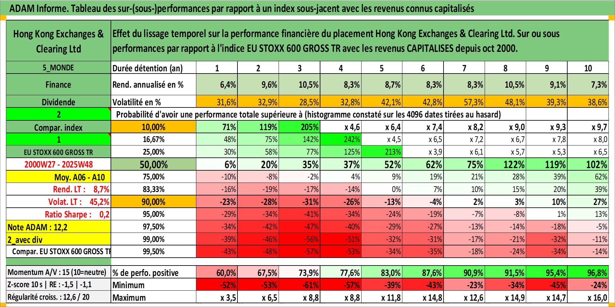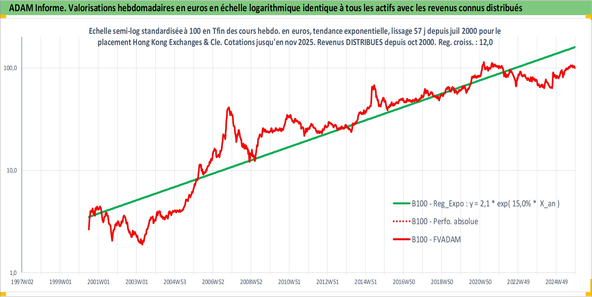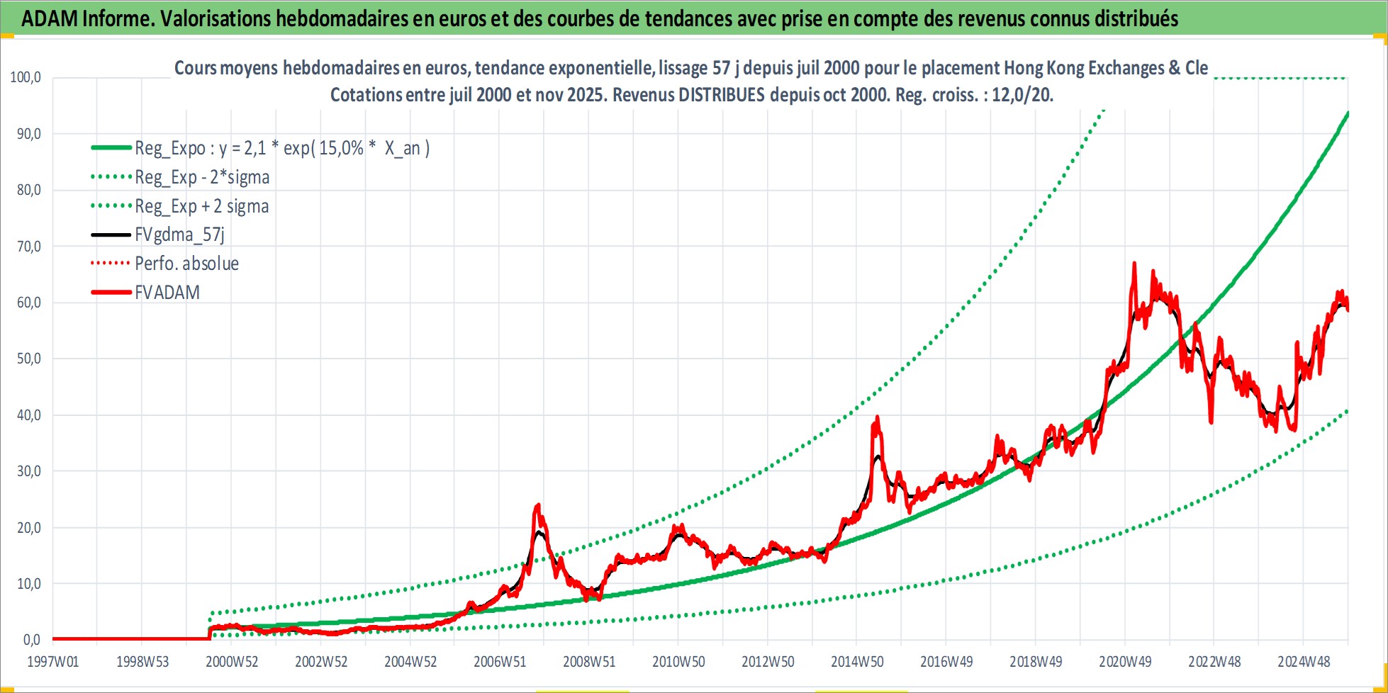 Site dédié aux investisseursPage dédiée sur site financeAnalyse des valorisations hebdomadaires de l'action Hong Kong Exchanges & Clearing Ltd. Cet actif est cote en HKD. Les valorisations sont en contrevaleur EURO et couvrent les semaines 2000W27 a 2025W48. Les revenus de cet actif financier sont pris en compte depuis la semaine 2000W40. La note globale ESG de cet actif est estimee a 12.0 (apres rebasage entre 0 et 20).