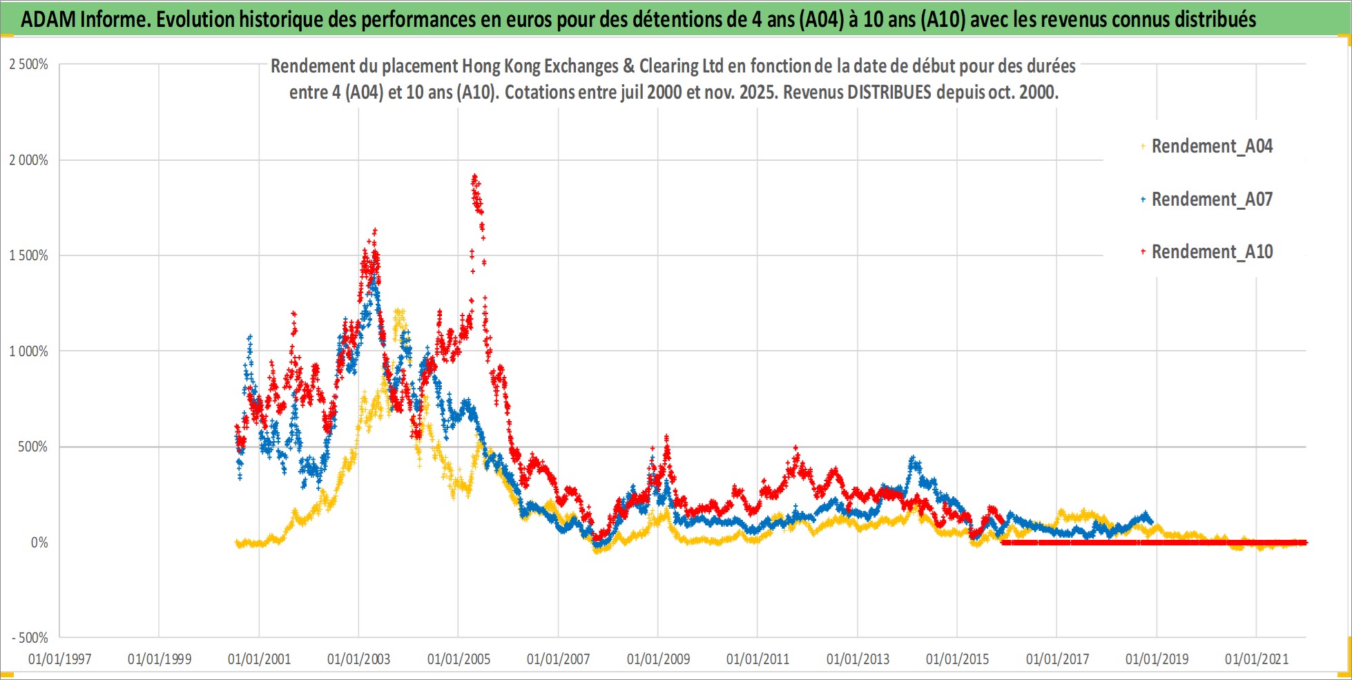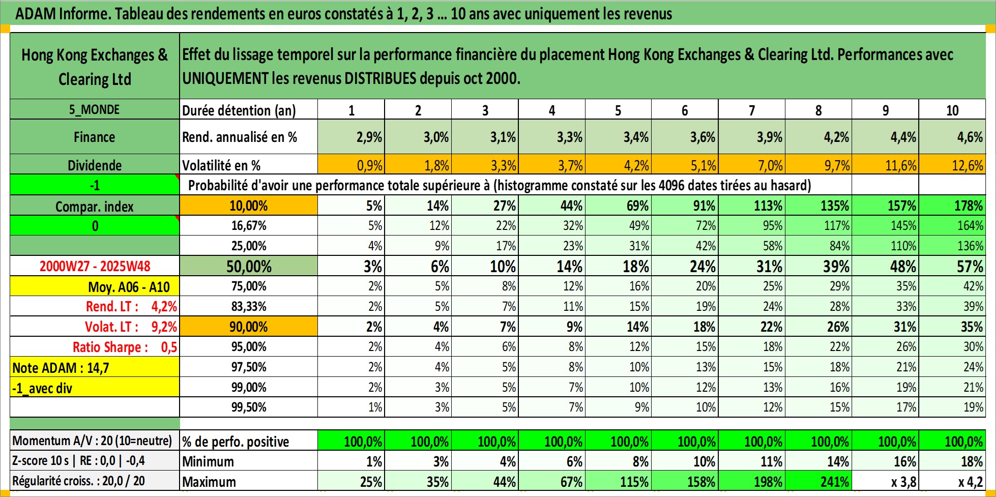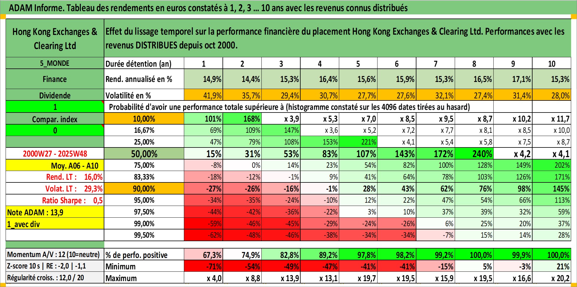 Site dédié aux investisseursPage dédiée sur site financeAnalyse des valorisations hebdomadaires de l'action Hong Kong Exchanges & Clearing Ltd. Cet actif est cote en HKD. Les valorisations sont en contrevaleur EURO et couvrent les semaines 2000W27 a 2025W48. Les revenus de cet actif financier sont pris en compte depuis la semaine 2000W40. La note globale ESG de cet actif est estimee a 12.0 (apres rebasage entre 0 et 20).