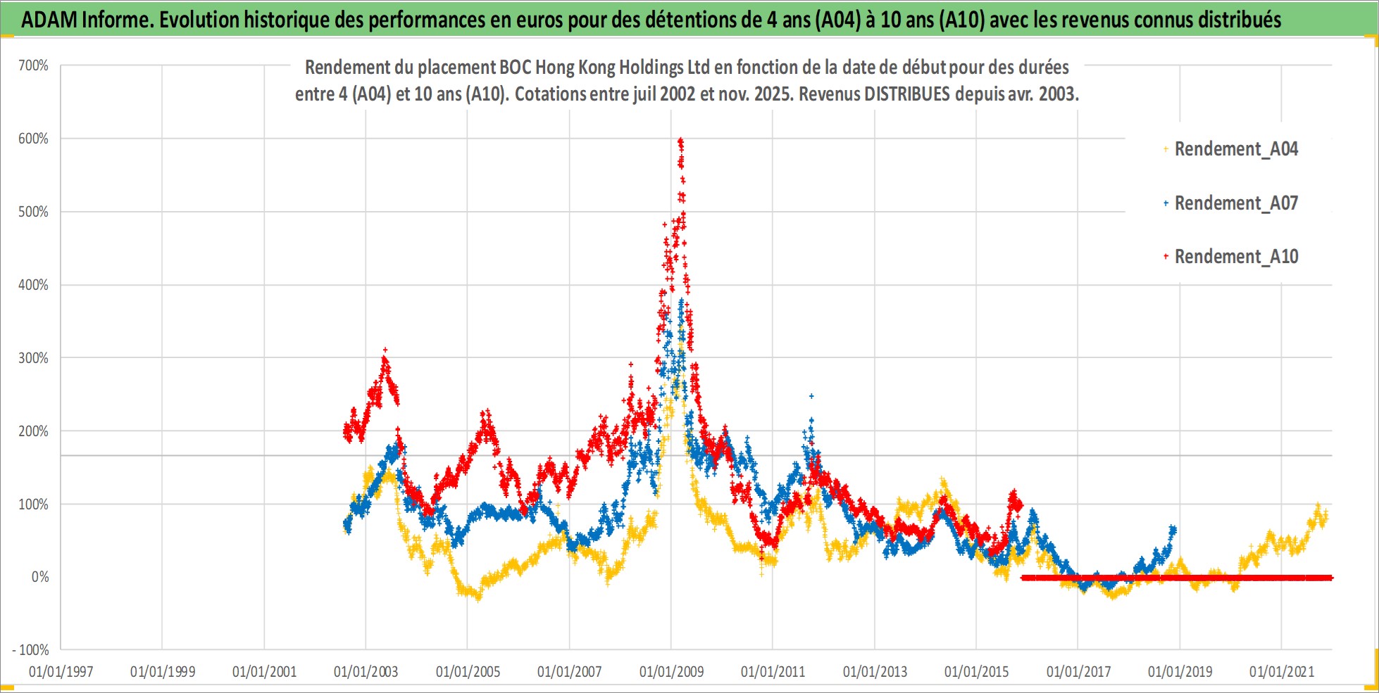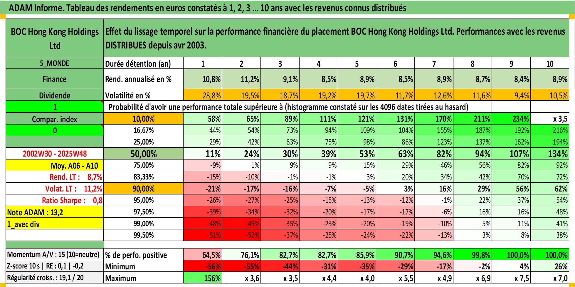Site dédié aux investisseursPage dédiée sur site financeAnalyse des valorisations hebdomadaires de l'action BOC Hong Kong Holdings Ltd. Cet actif est cote en HKD. Les valorisations sont en contrevaleur EURO et couvrent les semaines 2002W30 a 2025W48. Les revenus de cet actif financier sont pris en compte depuis la semaine 2003W18. La note globale ESG de cet actif est estimee a 9.0 (apres rebasage entre 0 et 20).