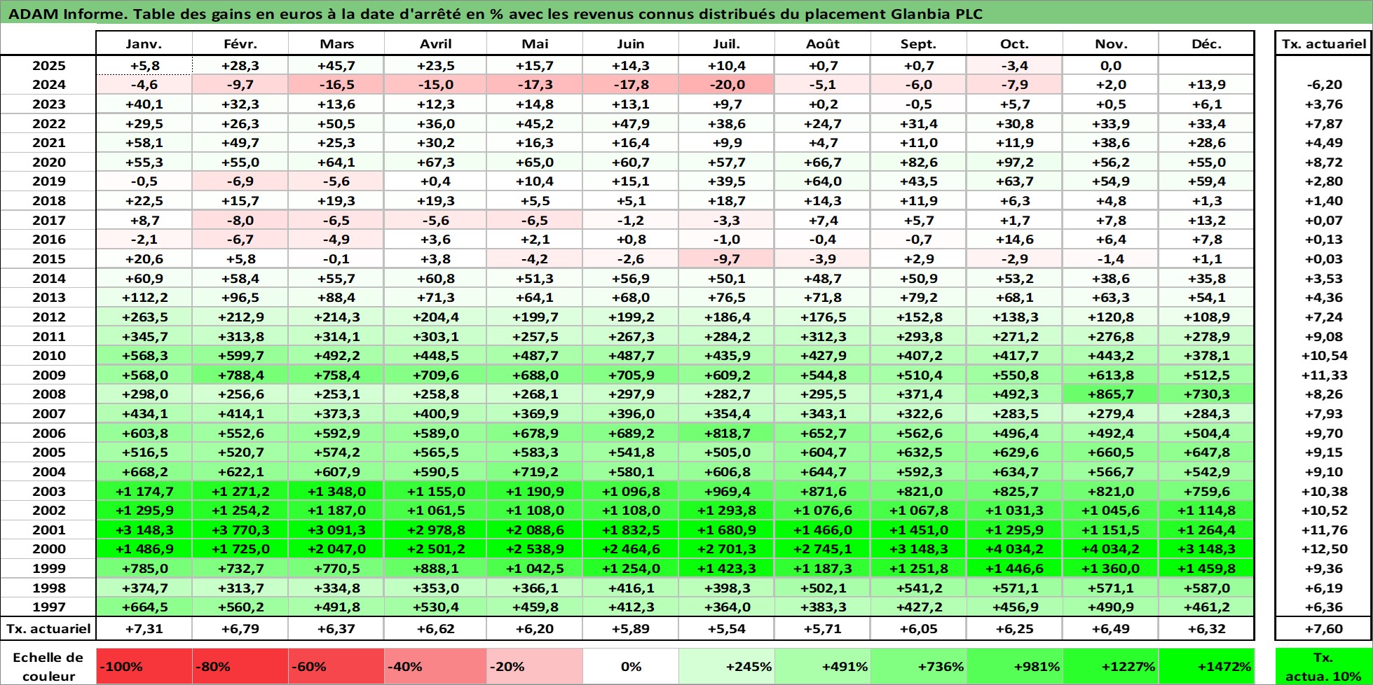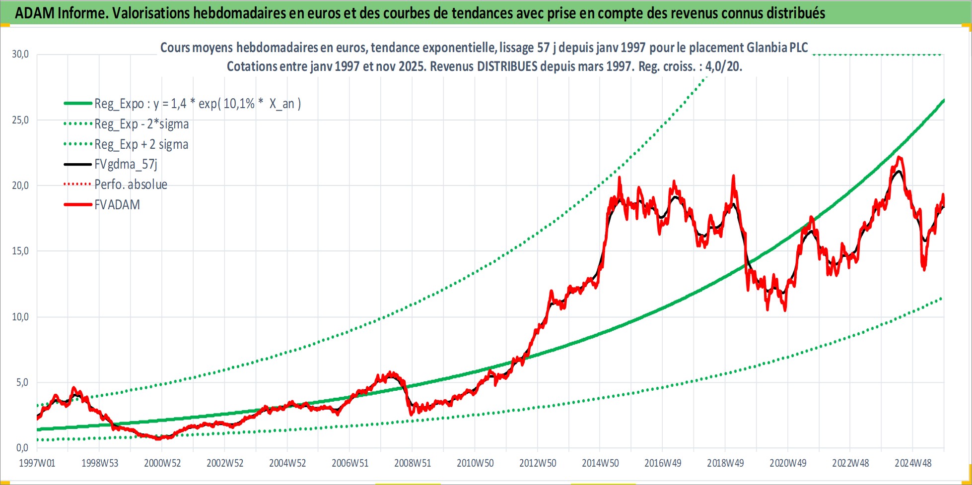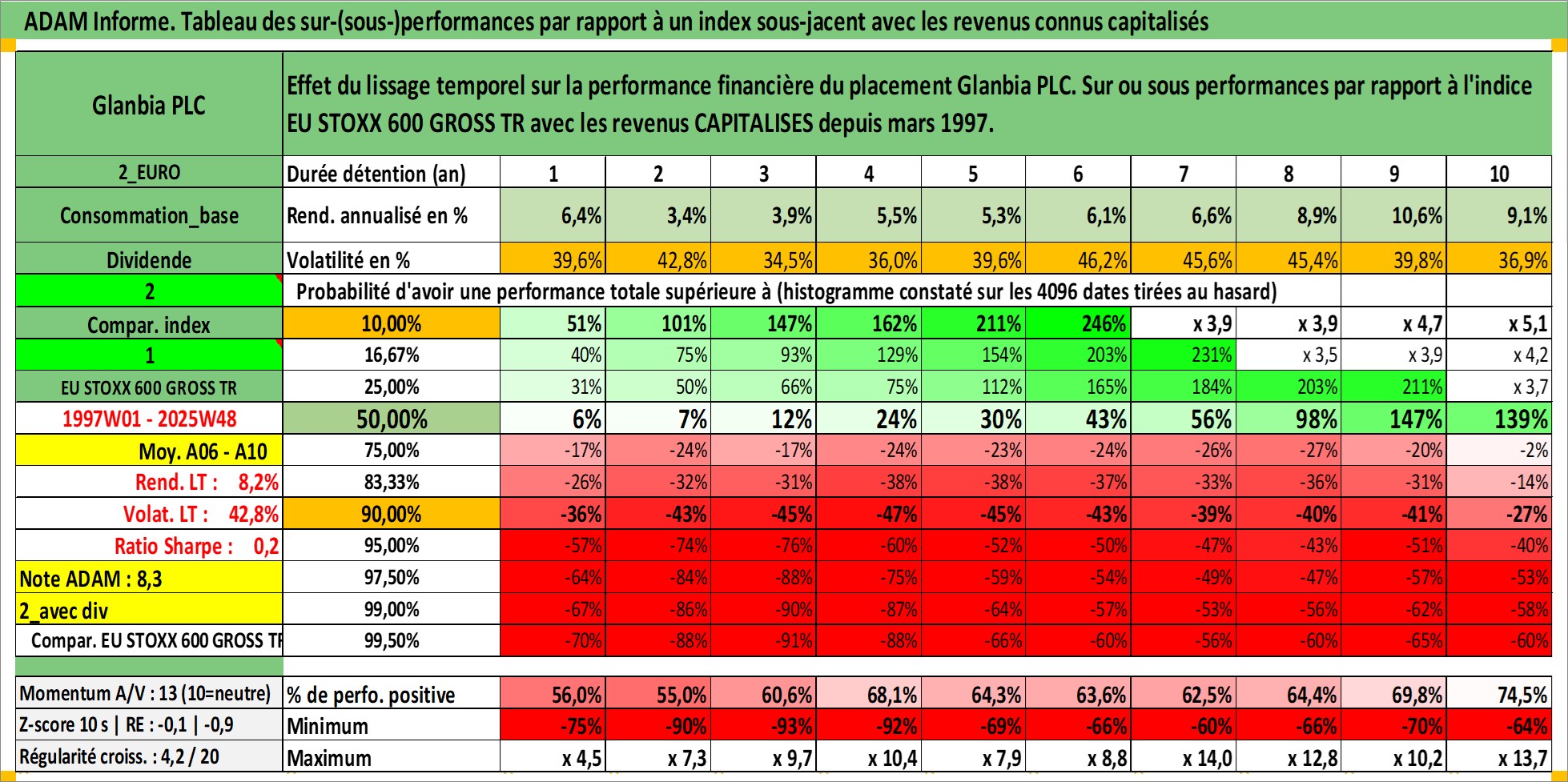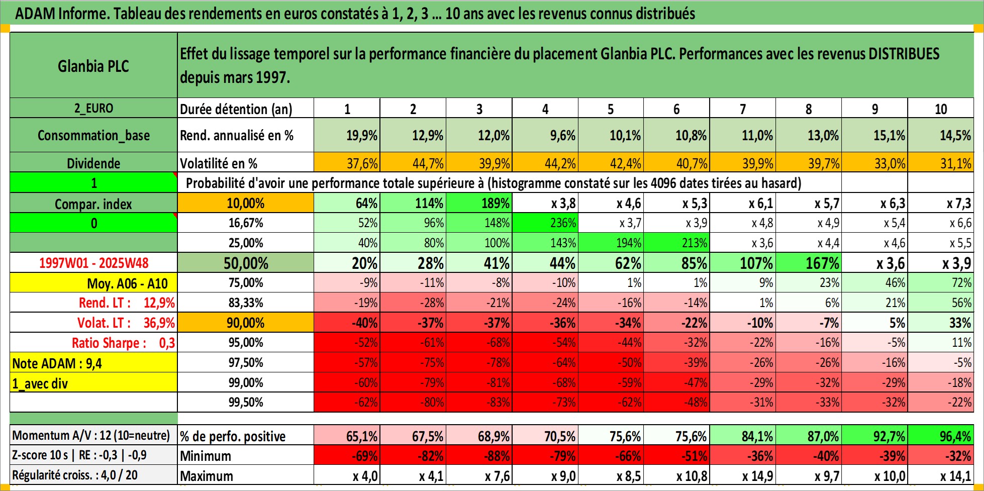 Site dédié aux investisseursPage dédiée sur site financeAnalyse des valorisations hebdomadaires de l'action Glanbia PLC. Cet actif est cote en EUR. Les valorisations couvrent les semaines 1997W01 a 2025W48. Les revenus de cet actif financier sont pris en compte depuis la semaine 1997W11. La note globale ESG de cet actif est estimee a 3.0 (apres rebasage entre 0 et 20).