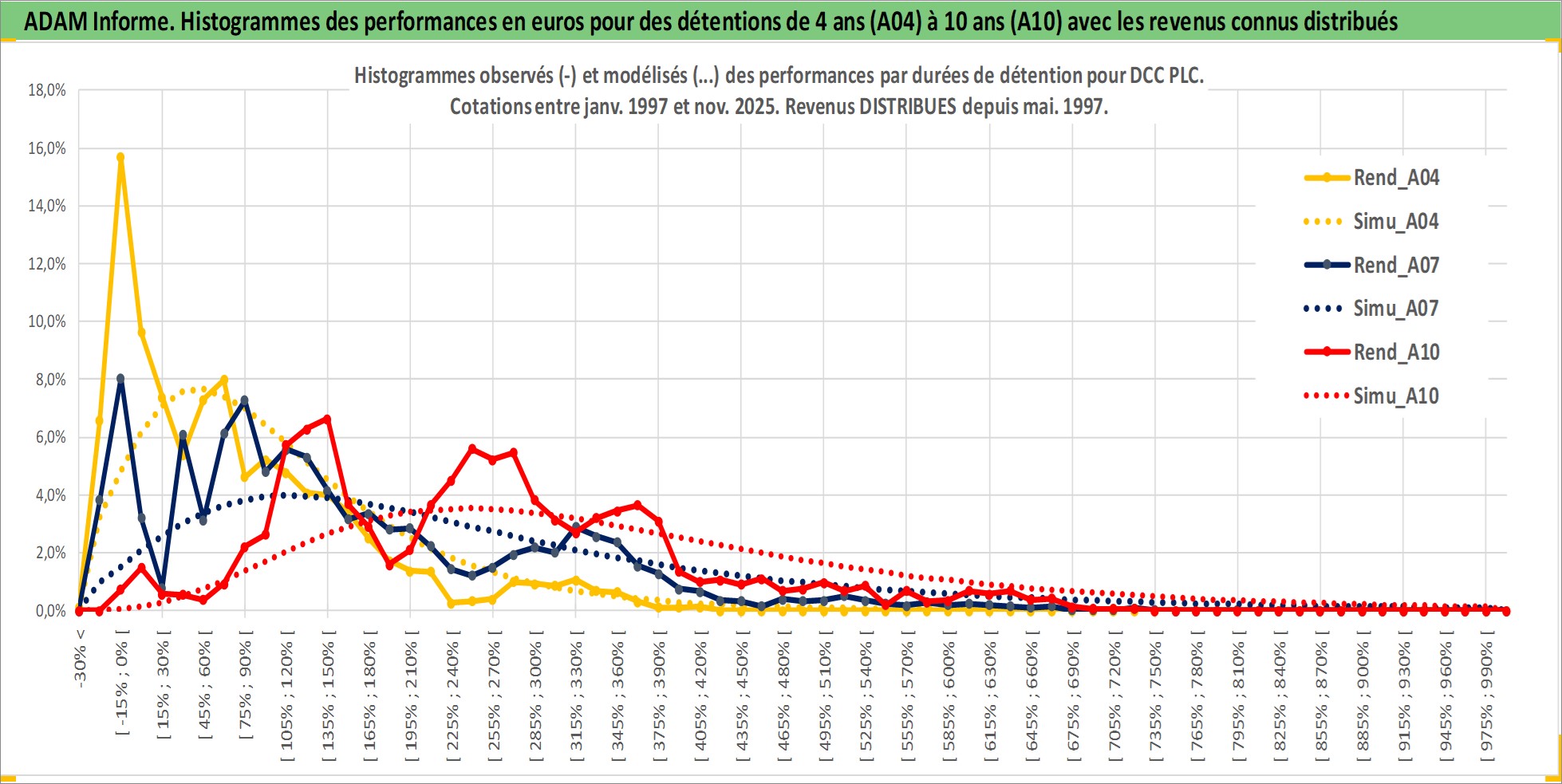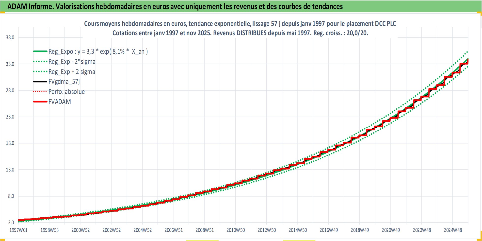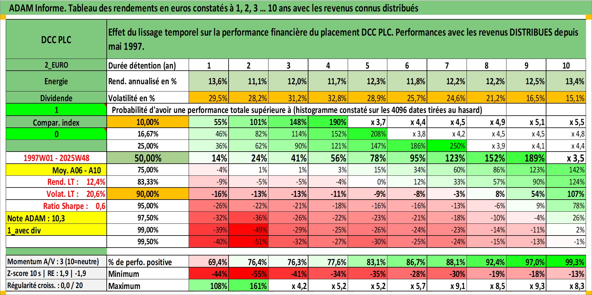 Site dédié aux investisseursPage dédiée sur site financeAnalyse des valorisations hebdomadaires de l'action DCC PLC. Cet actif est cote en GBX. Les valorisations sont en contrevaleur EURO et couvrent les semaines 1997W01 a 2025W48. Les revenus de cet actif financier sont pris en compte depuis la semaine 1997W21. La note globale ESG de cet actif est estimee a 9.0 (apres rebasage entre 0 et 20).