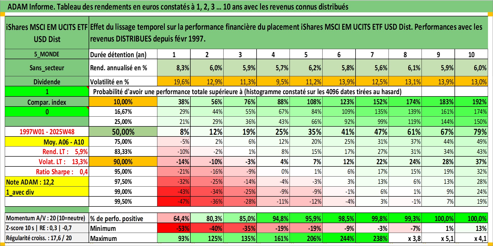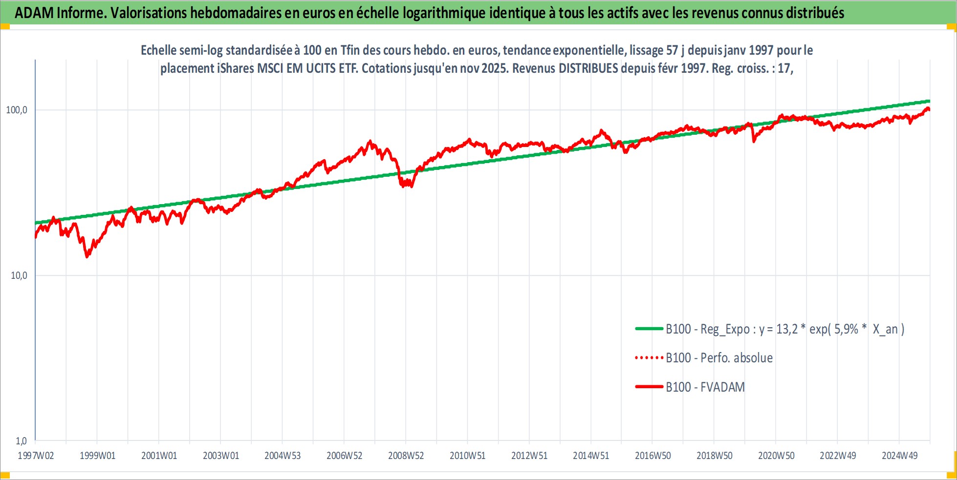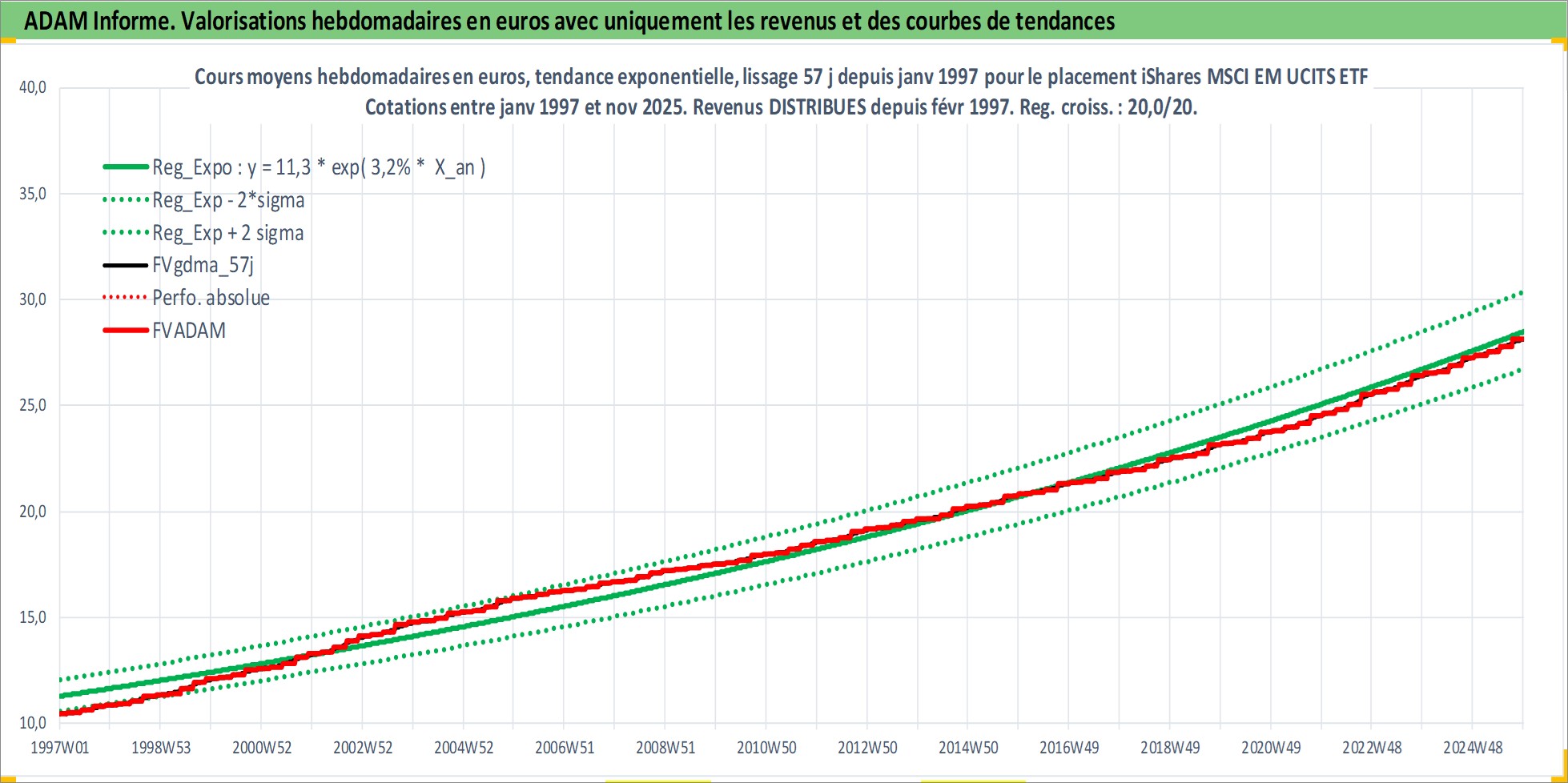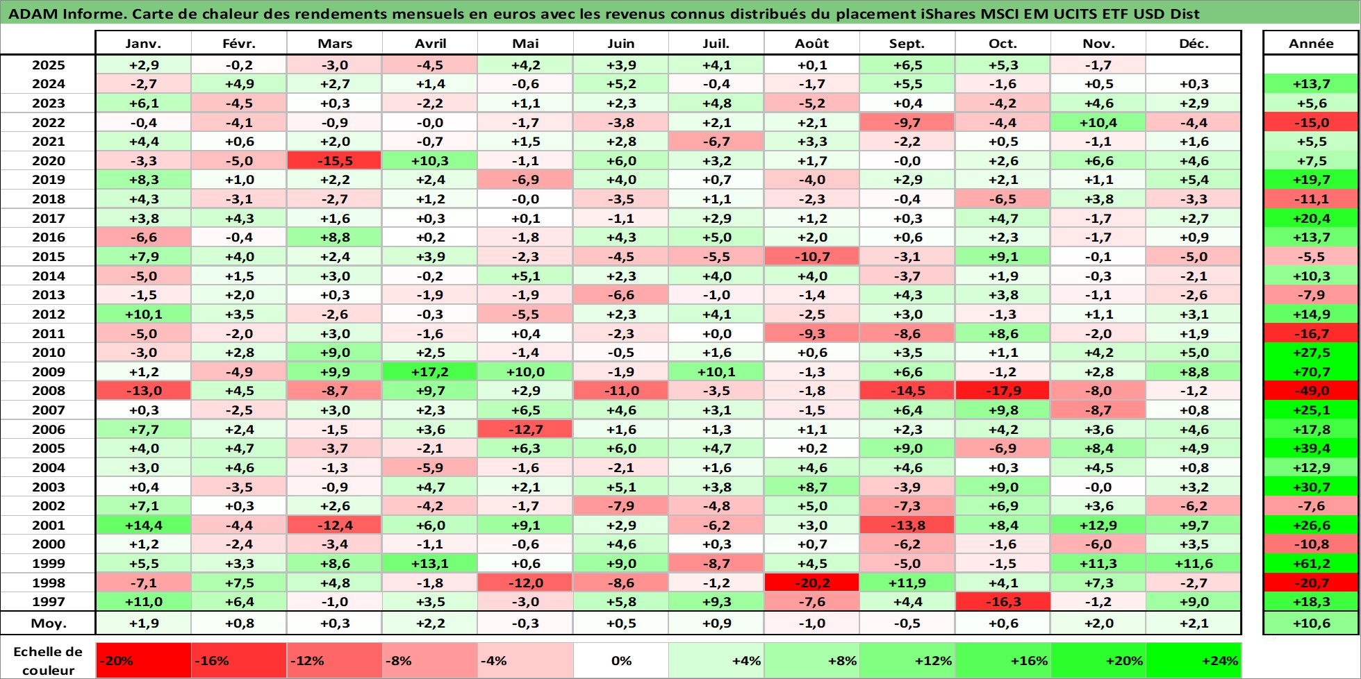 Site dédié aux investisseursPage dédiée sur site financeAnalyse des valorisations hebdomadaires du fonds iShares MSCI EM UCITS ETF USD Dist. Cet actif est cote en USD. Les valorisations sont en contrevaleur EURO et couvrent les semaines 1997W01 a 2025W48. Les revenus de cet actif financier sont pris en compte depuis la semaine 1997W09. La note ESG de cet actif n'est pas connue.