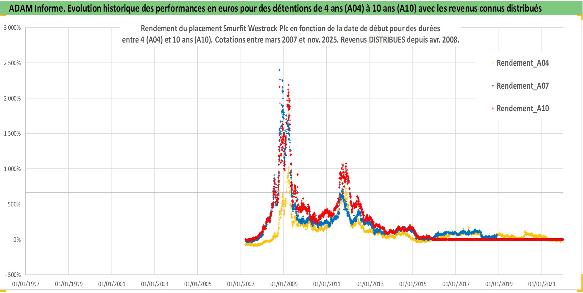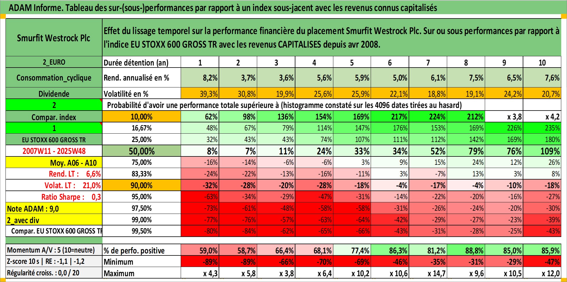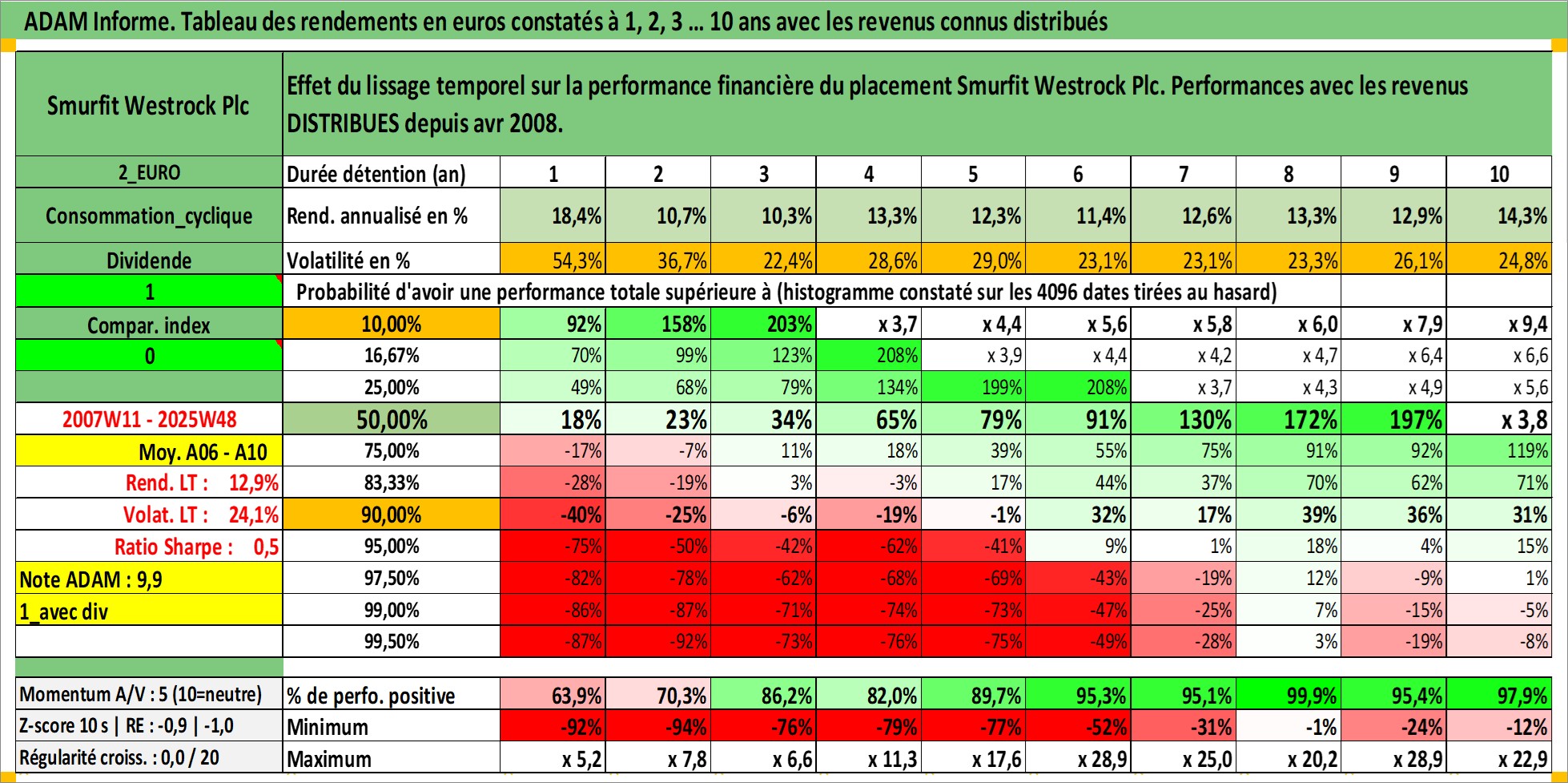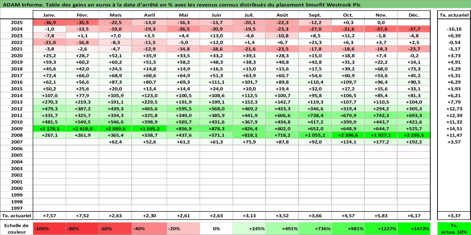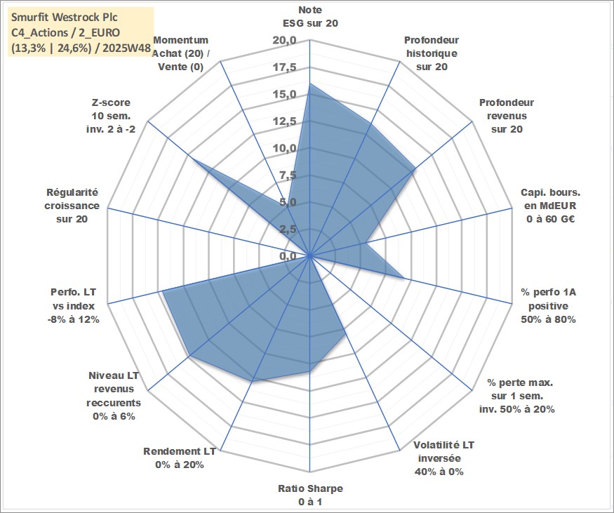 Site dédié aux investisseursPage dédiée sur site financeAnalyse des valorisations hebdomadaires de l'action Smurfit Westrock Plc. Cet actif est cote en GBX. Les valorisations sont en contrevaleur EURO et couvrent les semaines 2007W11 a 2025W48. Les revenus de cet actif financier sont pris en compte depuis la semaine 2008W14. La note globale ESG de cet actif est estimee a 16.0 (apres rebasage entre 0 et 20).