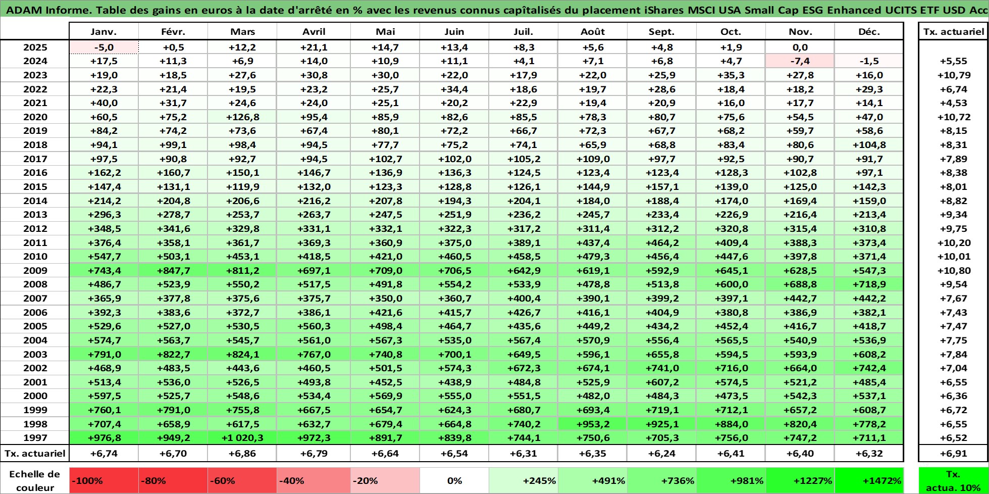 Site dédié aux investisseursPage dédiée sur site financeAnalyse des valorisations hebdomadaires du fonds iShares MSCI USA Small Cap ESG Enhanced UCITS ETF USD Acc. Cet actif est cote en USD. Les valorisations sont en contrevaleur EURO et couvrent les semaines 1997W01 a 2025W48. Les revenus de cet actif financier sont pris en compte depuis la semaine 1997W01. La note ESG de cet actif n'est pas connue.