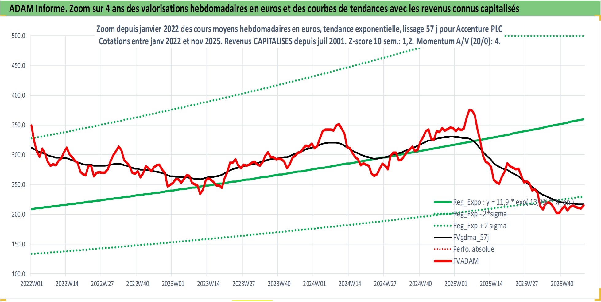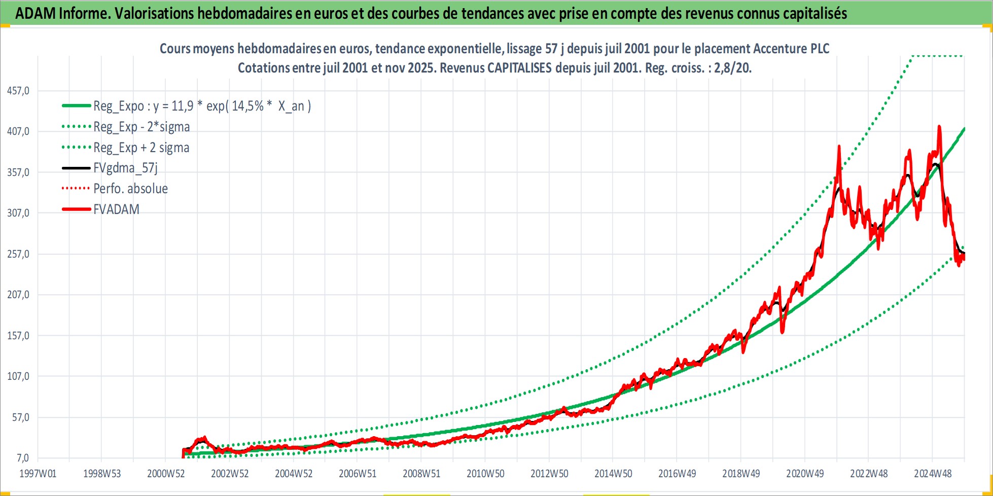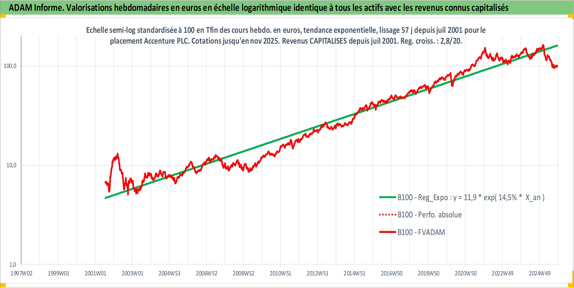 Site dédié aux investisseursPage dédiée sur site financeAnalyse des valorisations hebdomadaires de l'action Accenture PLC. Cet actif est cote en USD. Les valorisations sont en contrevaleur EURO et couvrent les semaines 2001W29 a 2025W48. Les revenus de cet actif financier sont pris en compte depuis la semaine 2001W29. La note globale ESG de cet actif est estimee a 17.0 (apres rebasage entre 0 et 20).