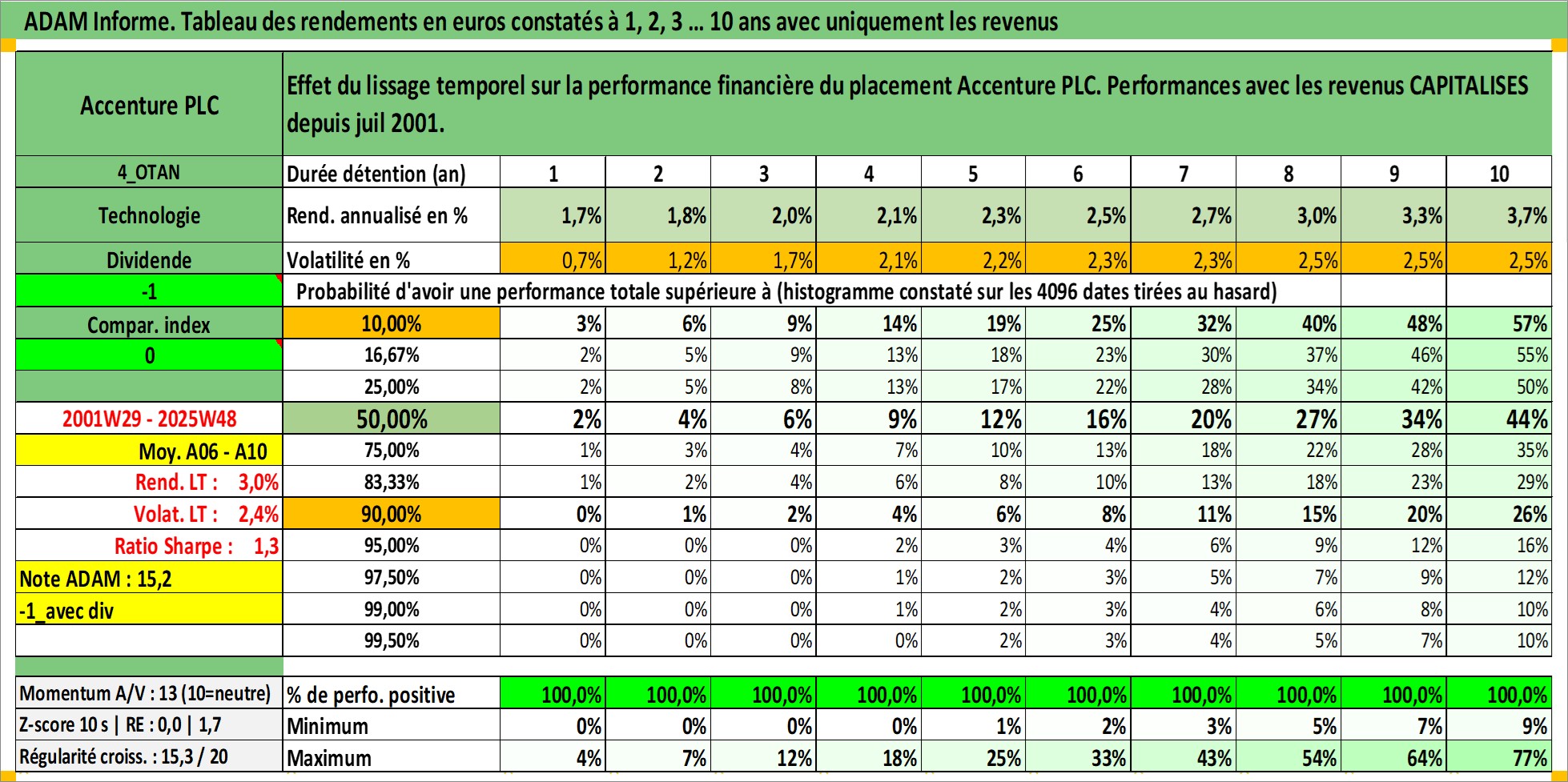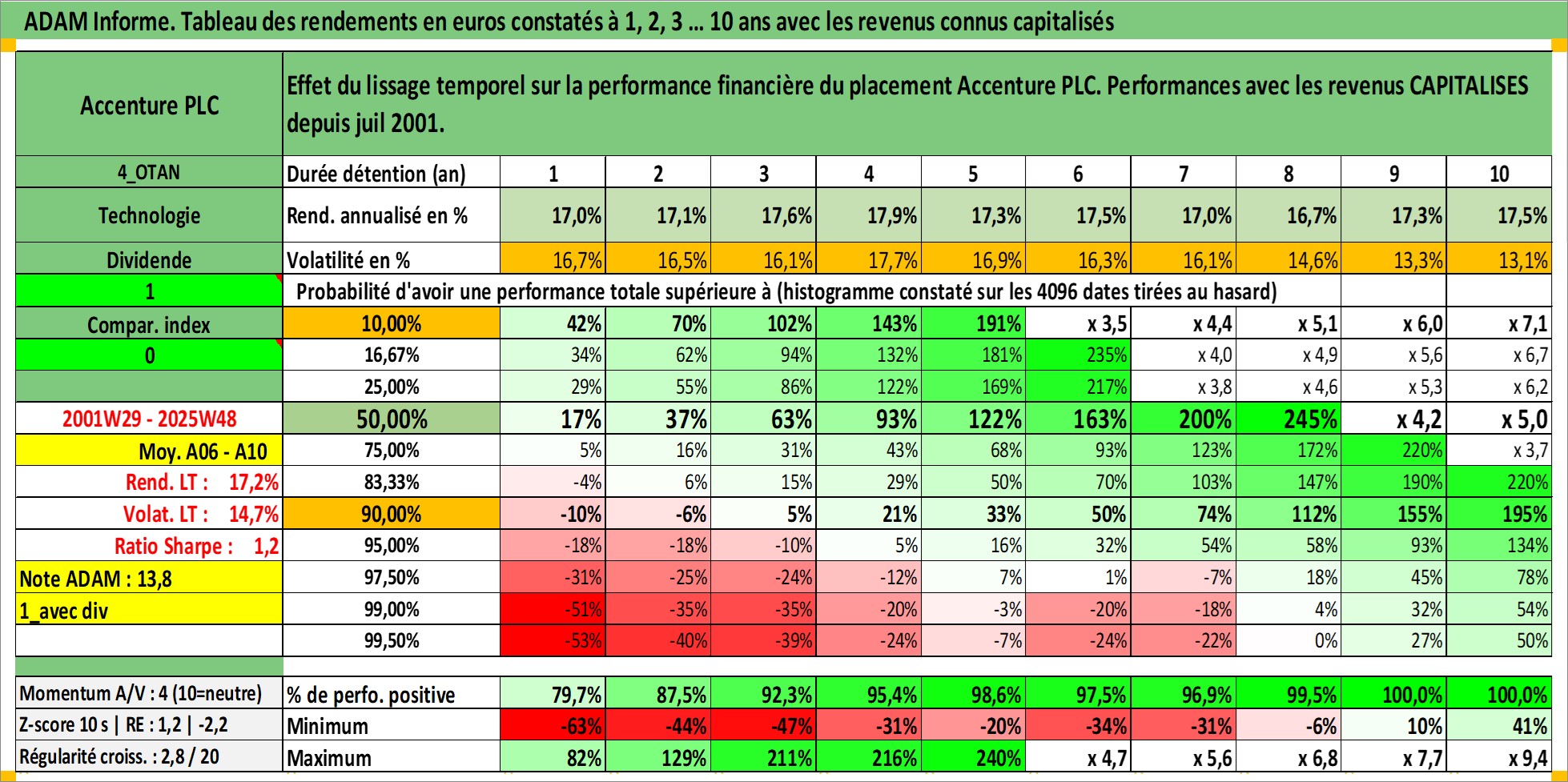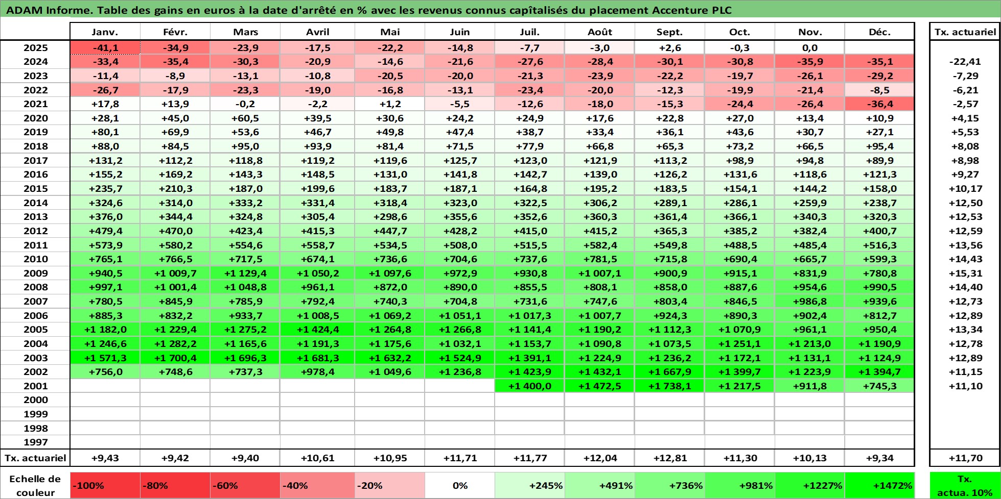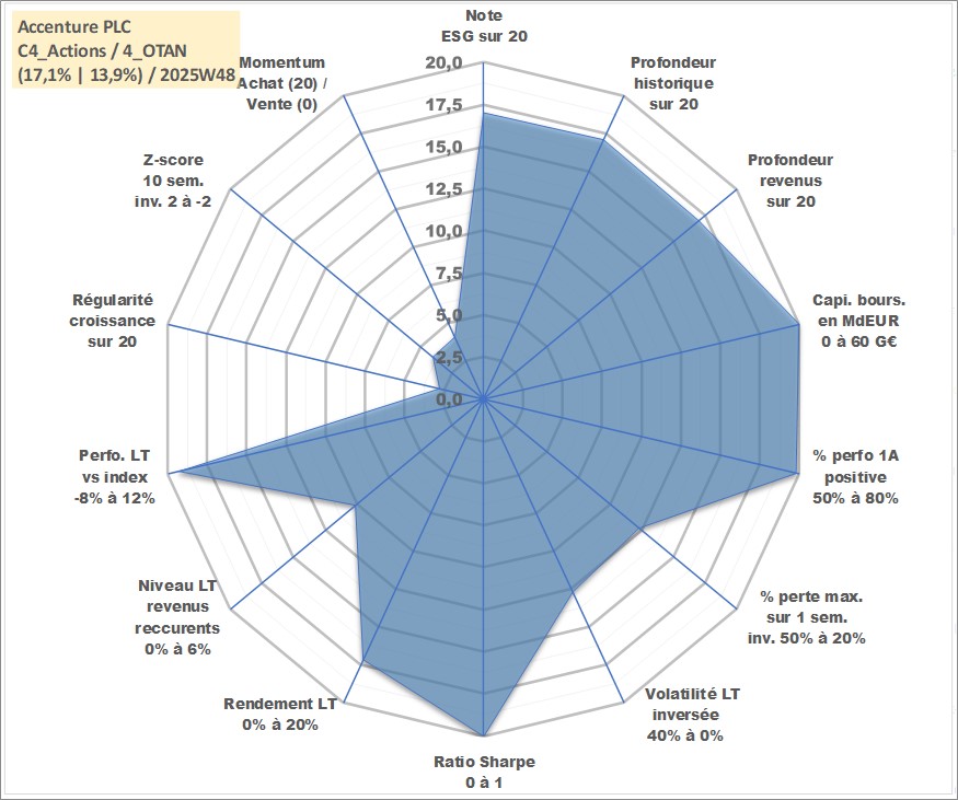 Site dédié aux investisseursPage dédiée sur site financeAnalyse des valorisations hebdomadaires de l'action Accenture PLC. Cet actif est cote en USD. Les valorisations sont en contrevaleur EURO et couvrent les semaines 2001W29 a 2025W48. Les revenus de cet actif financier sont pris en compte depuis la semaine 2001W29. La note globale ESG de cet actif est estimee a 17.0 (apres rebasage entre 0 et 20).