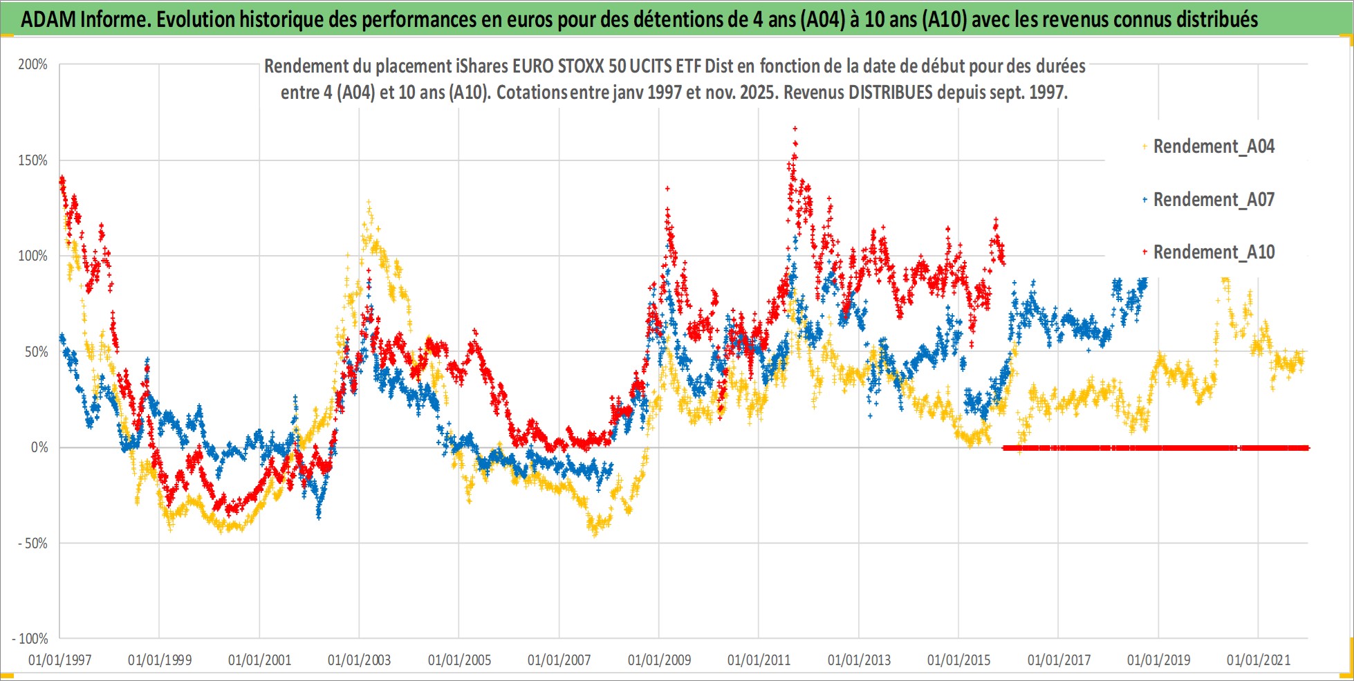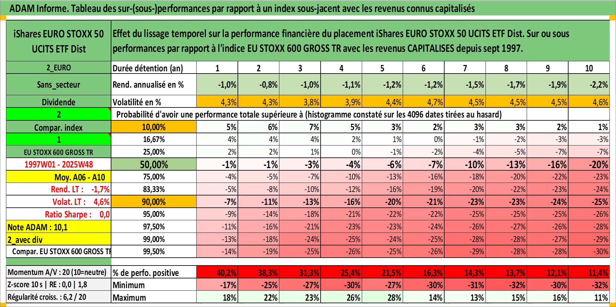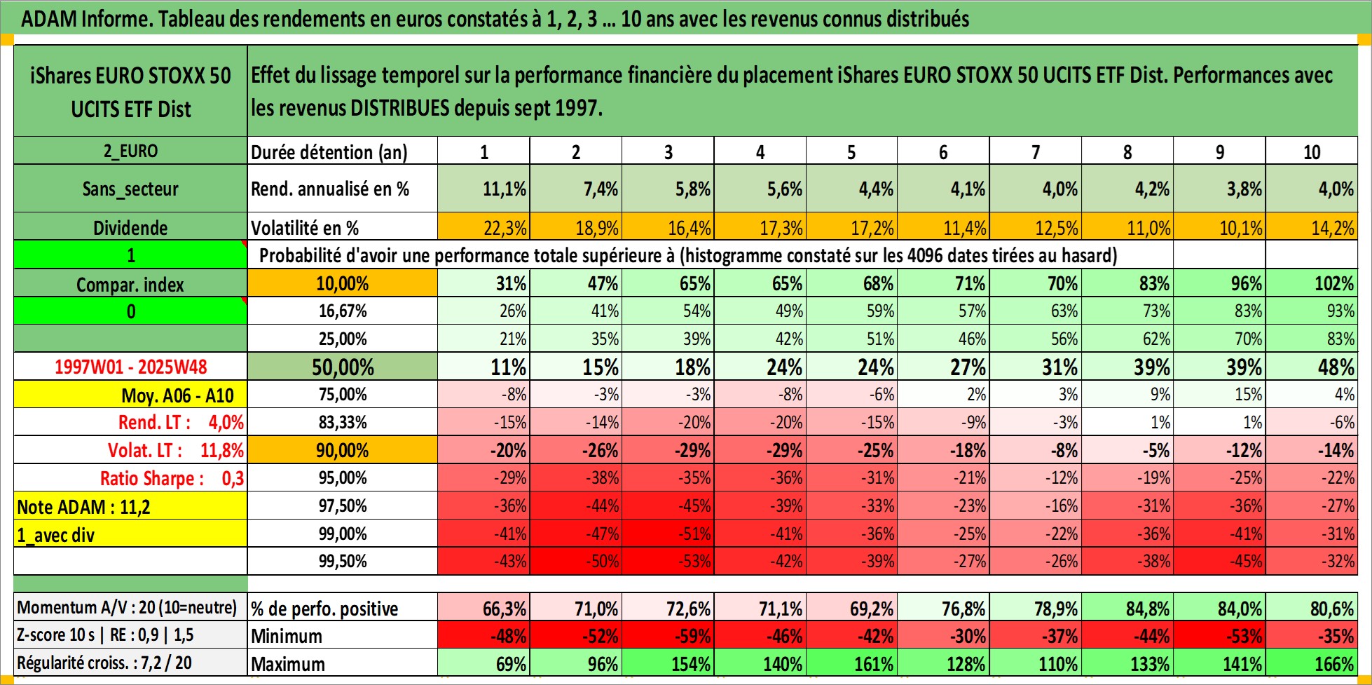Site dédié aux investisseursPage dédiée sur site financeAnalyse des valorisations hebdomadaires du fonds iShares EURO STOXX 50 UCITS ETF Dist. Cet actif est cote en EUR. Les valorisations couvrent les semaines 1997W01 a 2025W48. Les revenus de cet actif financier sont pris en compte depuis la semaine 1997W40. La note ESG de cet actif n'est pas connue.