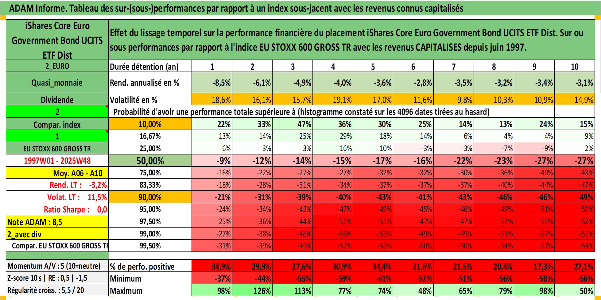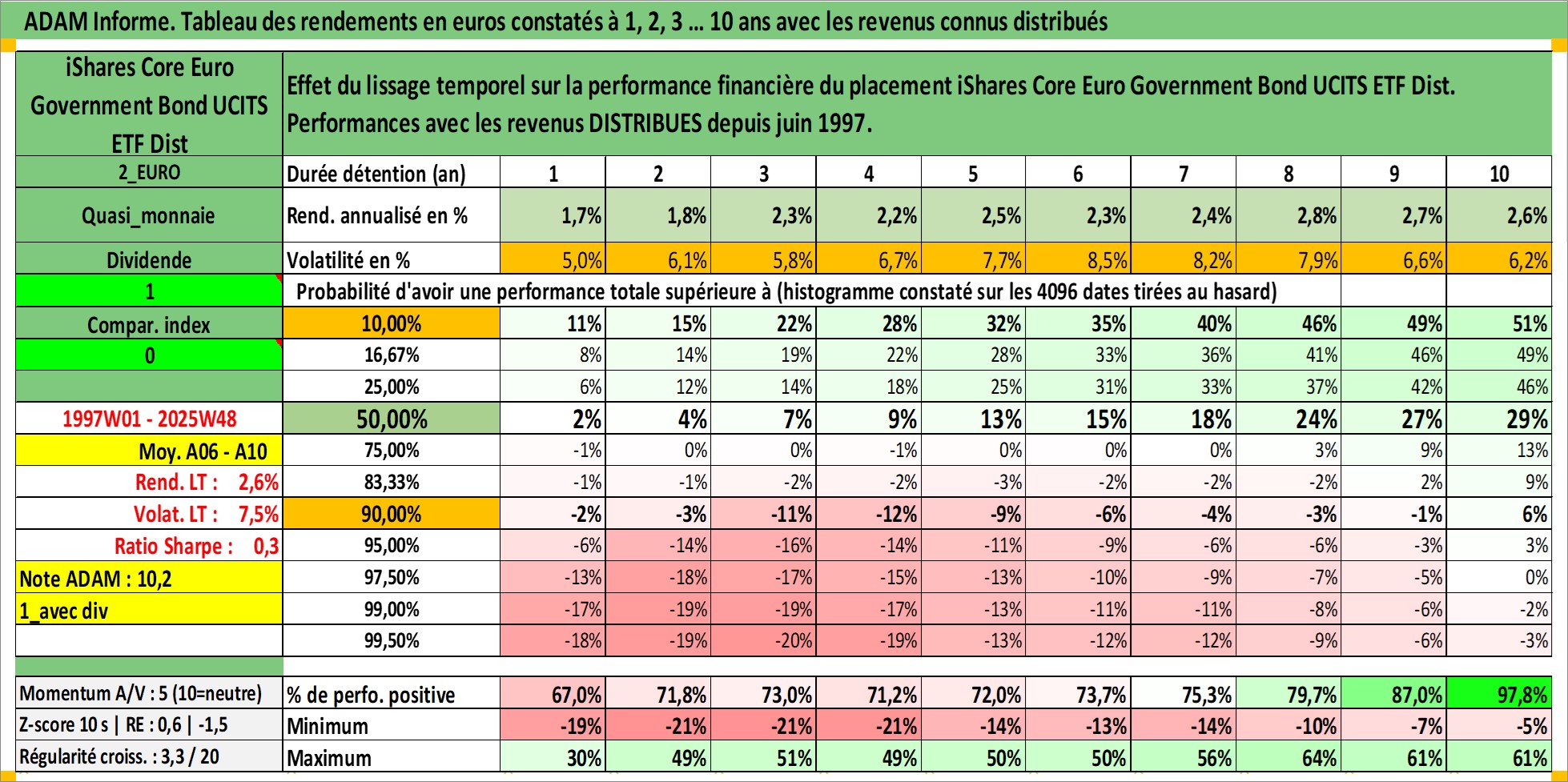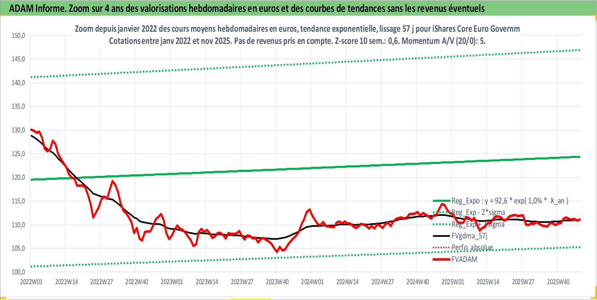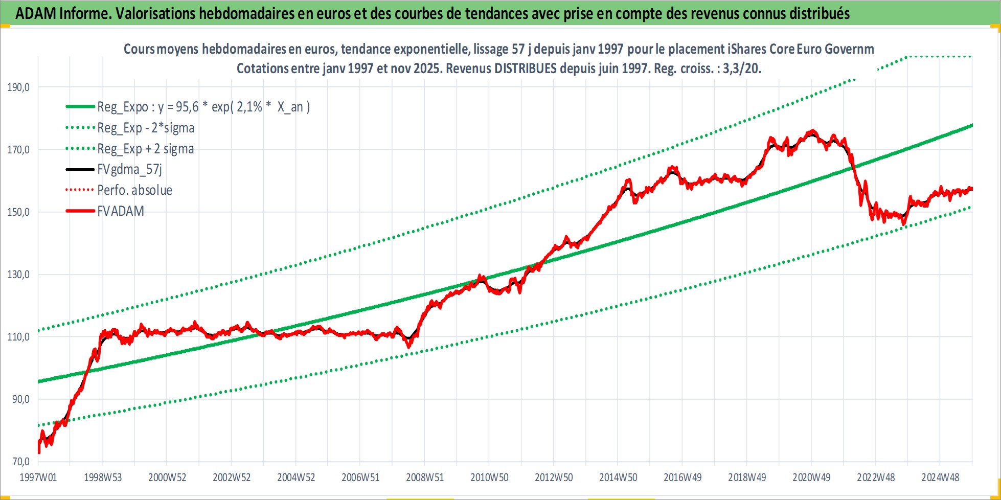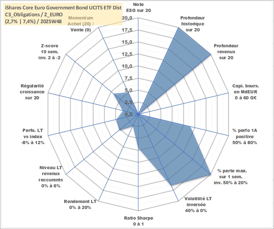 Site dédié aux investisseursPage dédiée sur site financeAnalyse des valorisations hebdomadaires du fonds iShares Core Euro Government Bond UCITS ETF Dist. Cet actif est cote en EUR. Les valorisations couvrent les semaines 1997W01 a 2025W48. Les revenus de cet actif financier sont pris en compte depuis la semaine 1997W24. La note ESG de cet actif n'est pas connue.