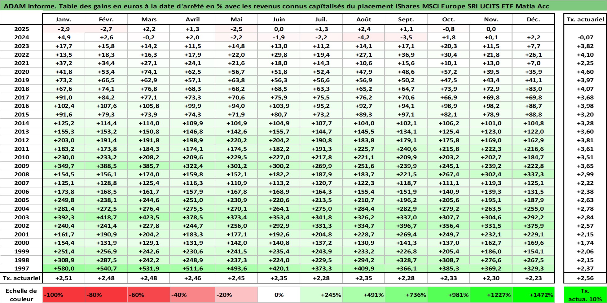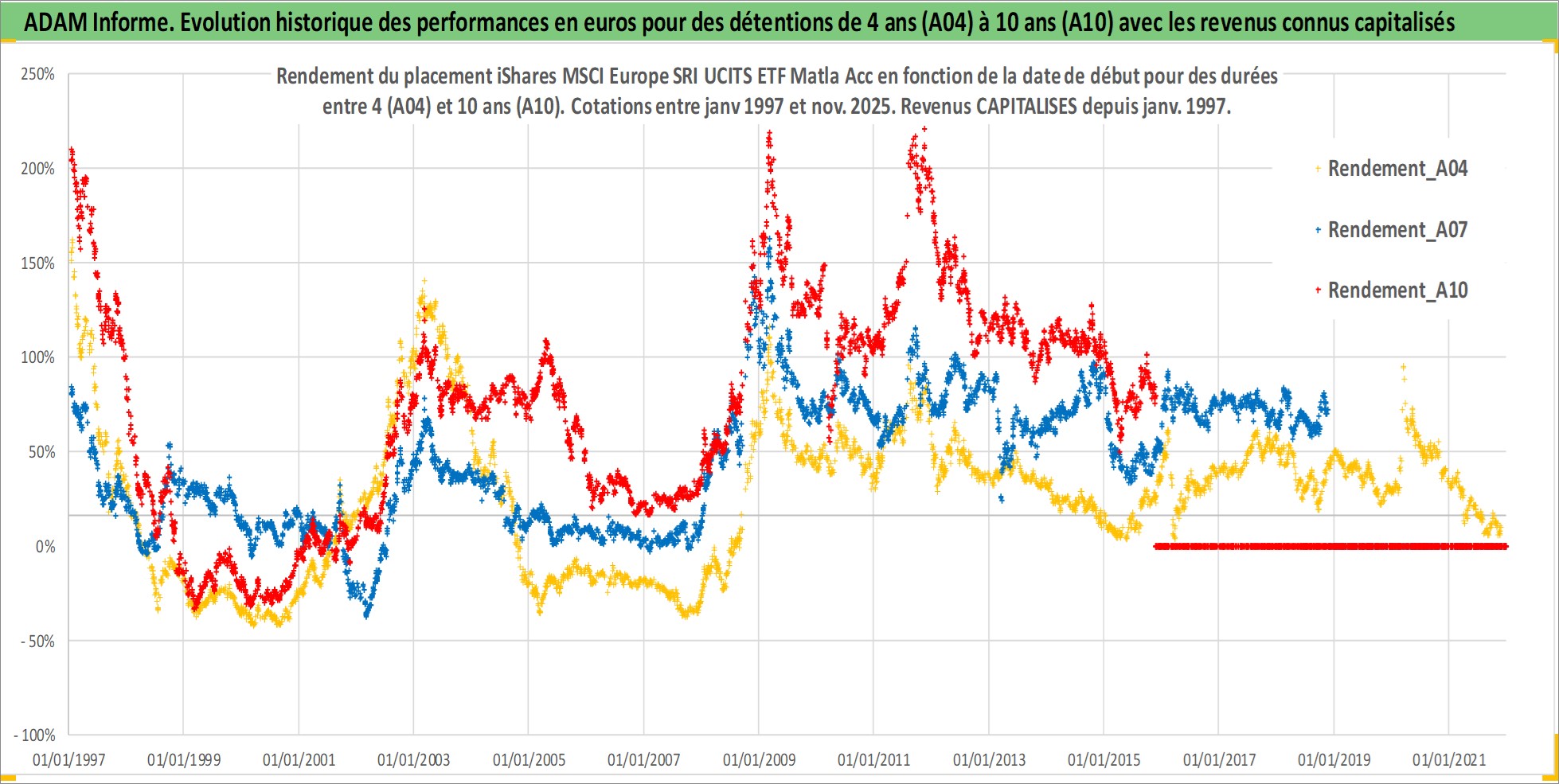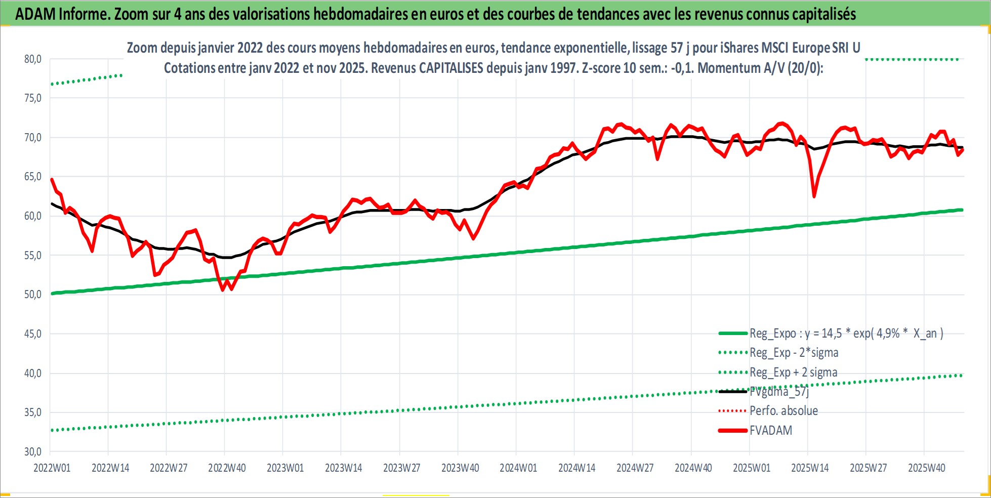 Site dédié aux investisseursPage dédiée sur site financeAnalyse des valorisations hebdomadaires du fonds iShares MSCI Europe SRI UCITS ETF Matla Acc. Cet actif est cote en EUR. Les valorisations couvrent les semaines 1997W01 a 2025W48. Les revenus de cet actif financier sont pris en compte depuis la semaine 1997W01. La note globale ESG de cet actif est estimee a 9.1 (apres rebasage entre 0 et 20).