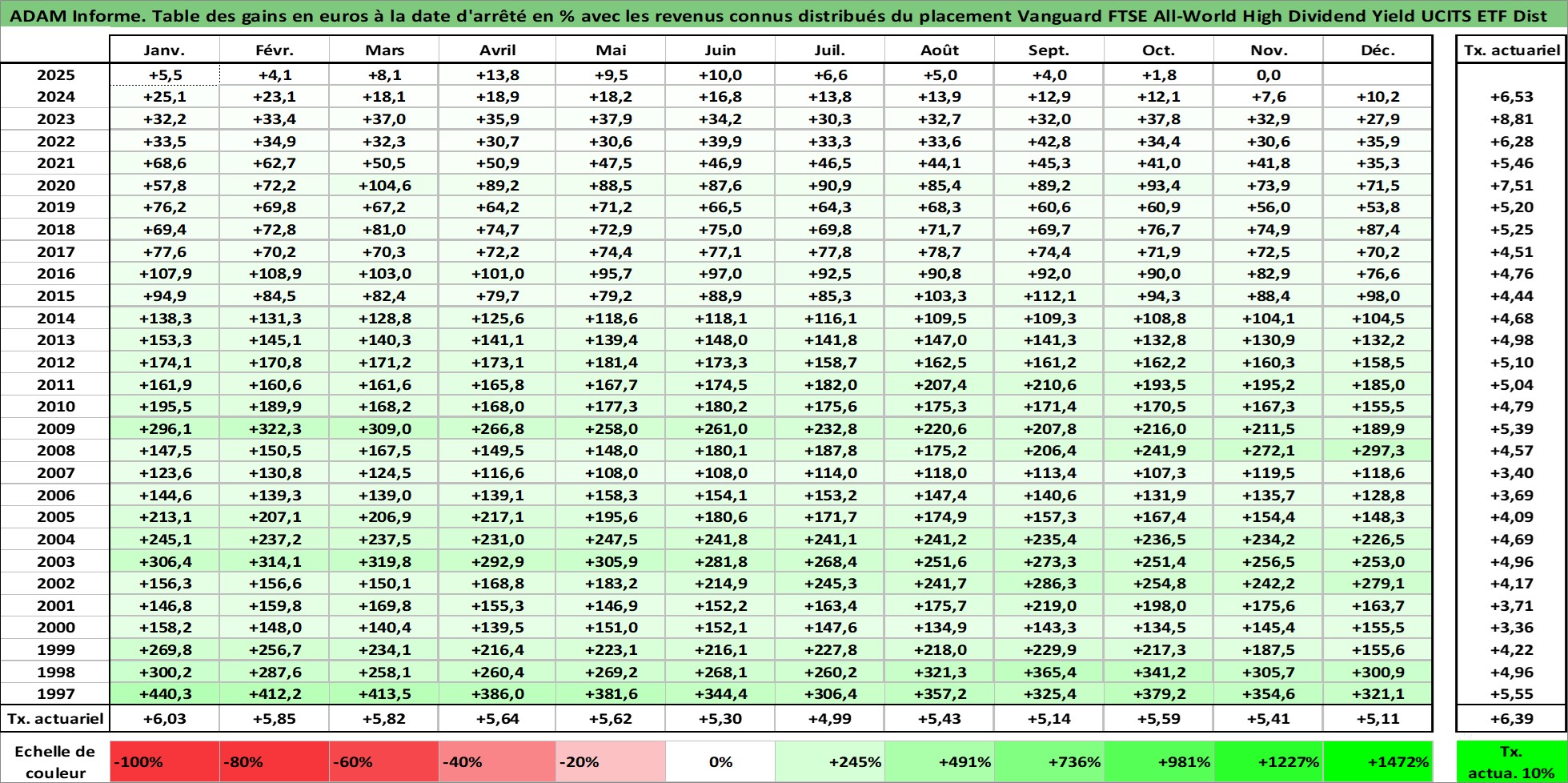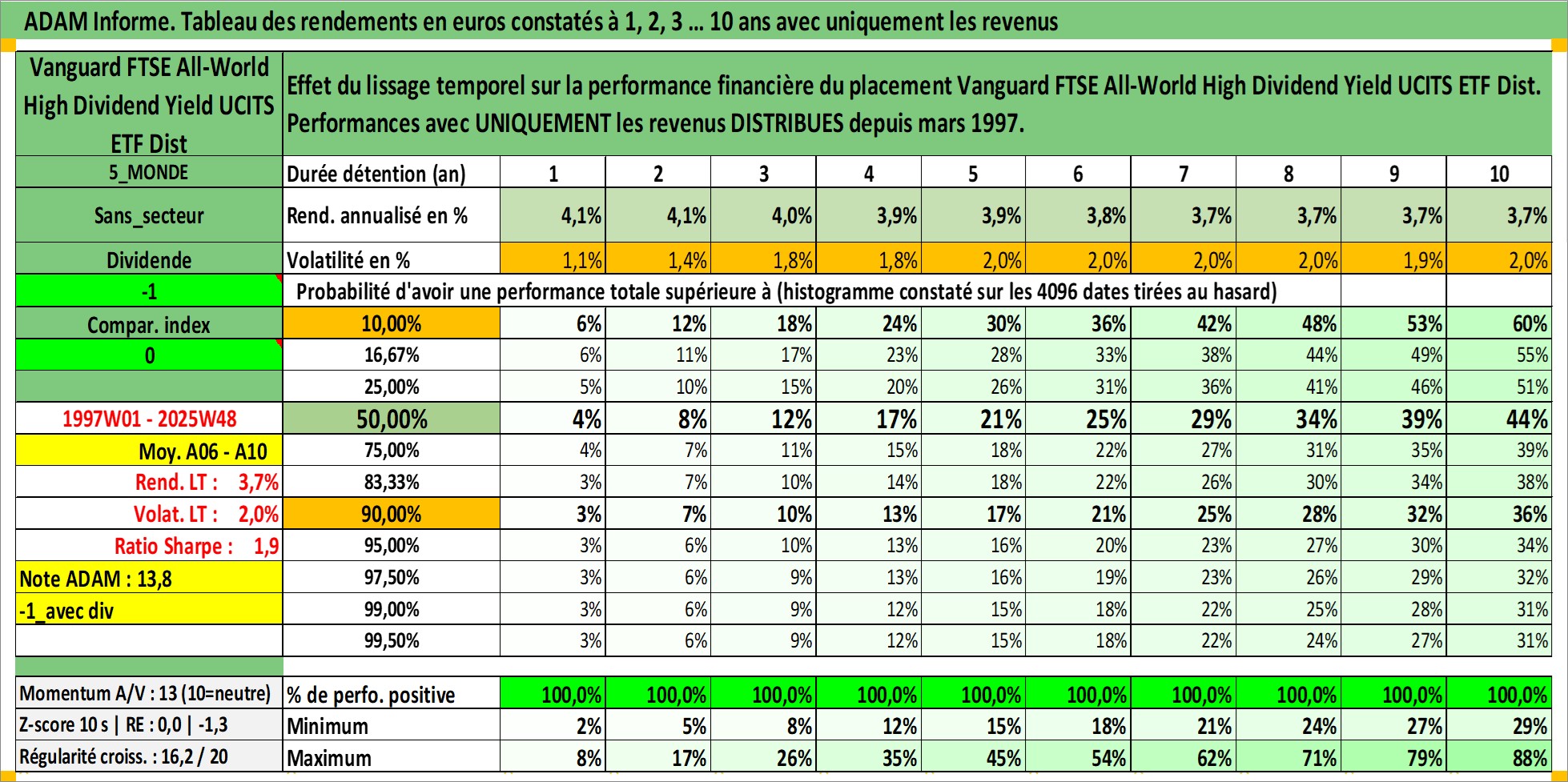 Site dédié aux investisseursPage dédiée sur site financeAnalyse des valorisations hebdomadaires du fonds Vanguard FTSE All-World High Dividend Yield UCITS ETF Dist. Cet actif est cote en GBP. Les valorisations sont en contrevaleur EURO et couvrent les semaines 1997W01 a 2025W48. Les revenus de cet actif financier sont pris en compte depuis la semaine 1997W12. La note ESG de cet actif n'est pas connue.