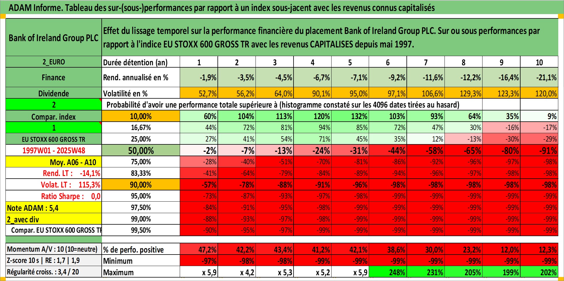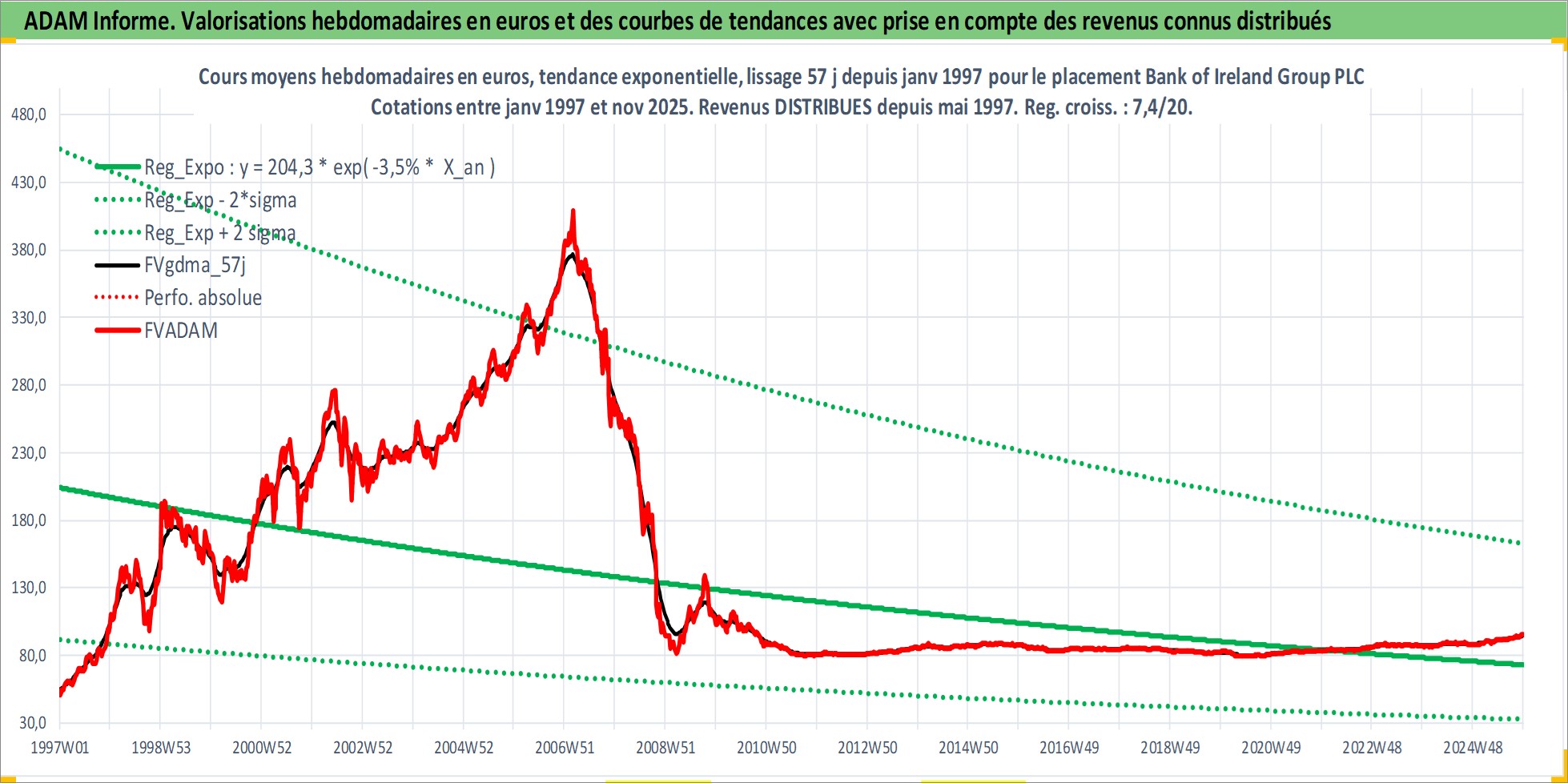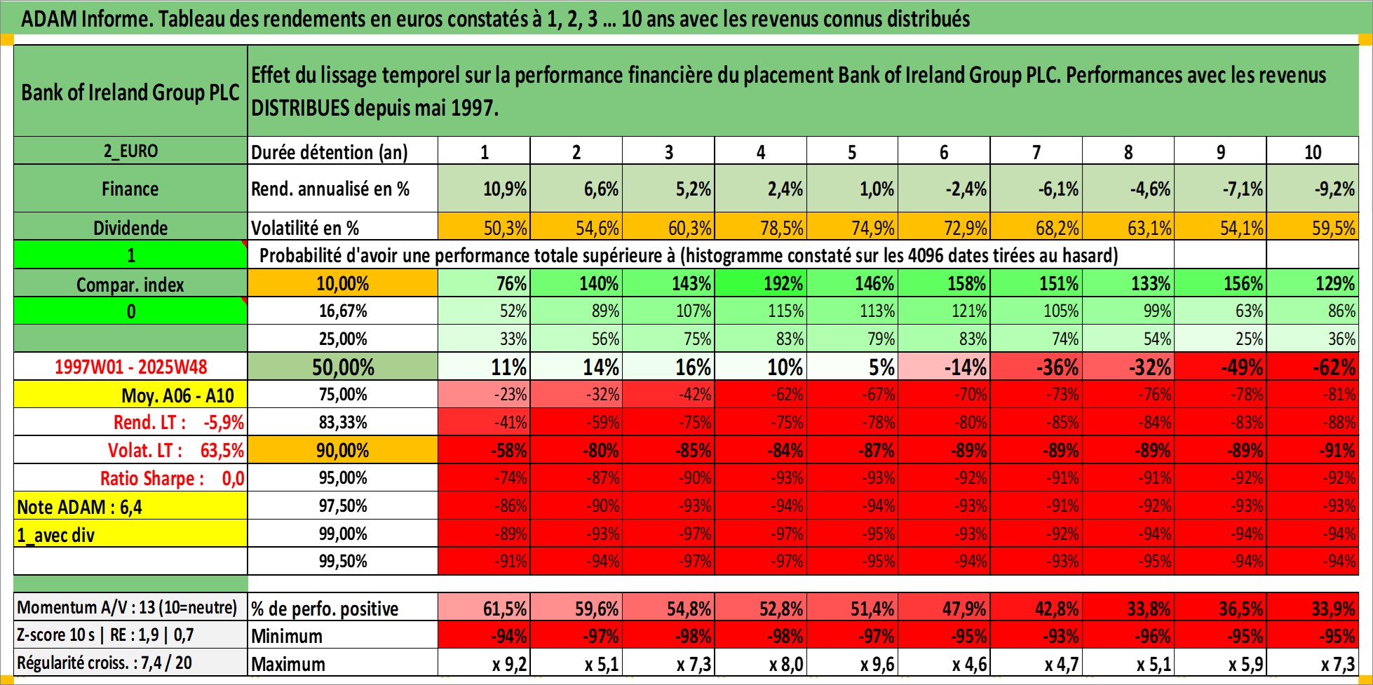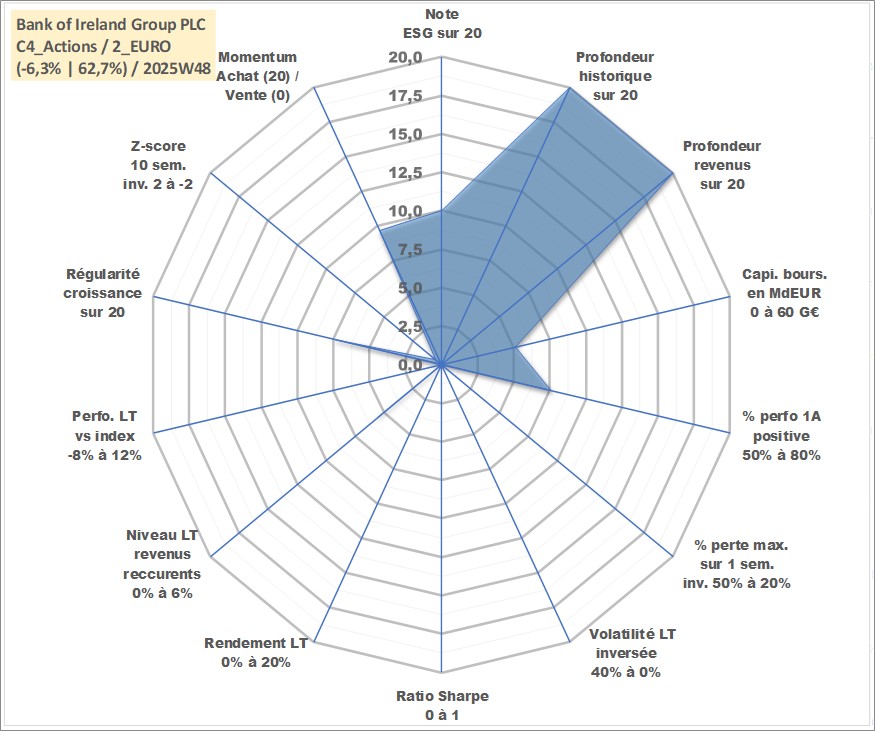 Site dédié aux investisseursPage dédiée sur site financeAnalyse des valorisations hebdomadaires de l'action Bank of Ireland Group PLC. Cet actif est cote en EUR. Les valorisations couvrent les semaines 1997W01 a 2025W48. Les revenus de cet actif financier sont pris en compte depuis la semaine 1997W22. La note globale ESG de cet actif est estimee a 10.0 (apres rebasage entre 0 et 20).