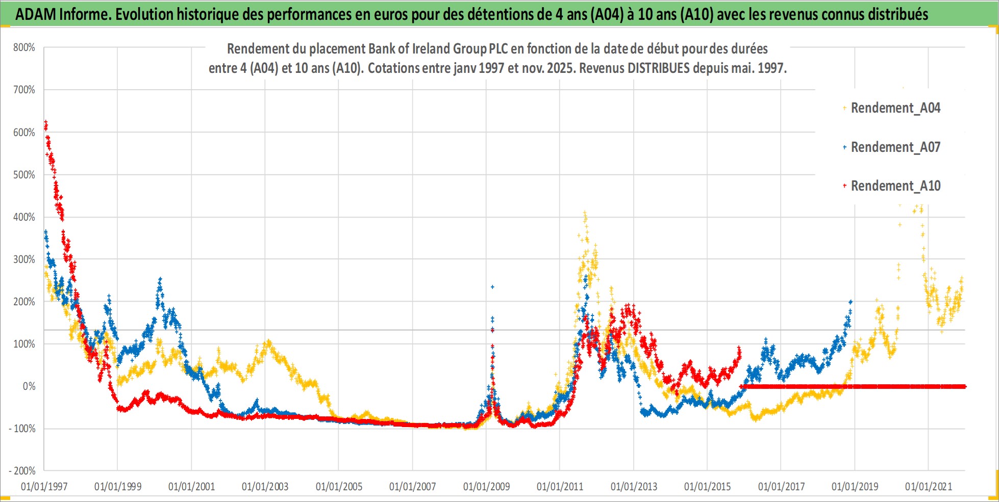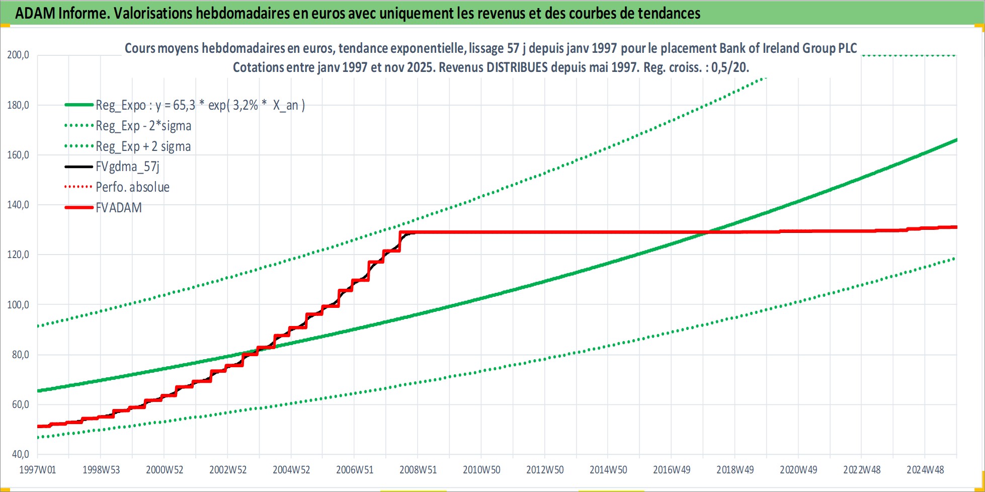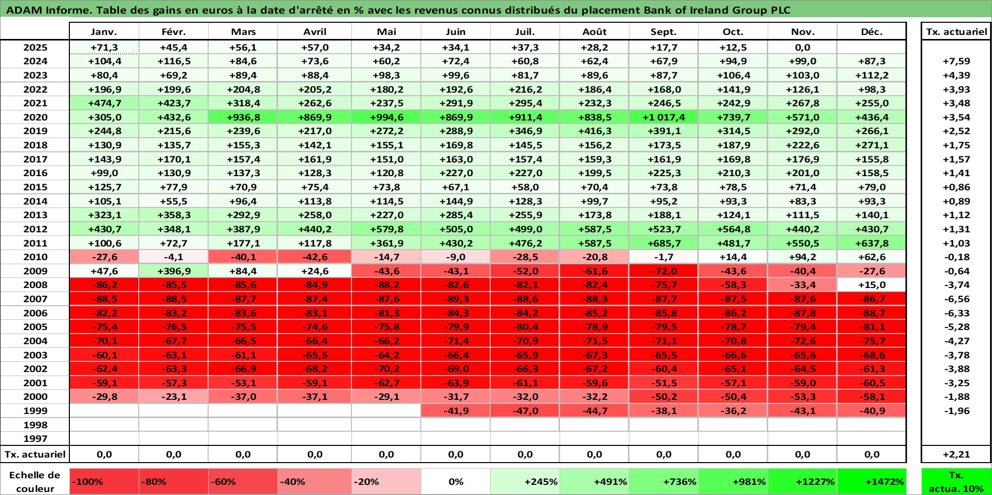 Site dédié aux investisseursPage dédiée sur site financeAnalyse des valorisations hebdomadaires de l'action Bank of Ireland Group PLC. Cet actif est cote en EUR. Les valorisations couvrent les semaines 1997W01 a 2025W48. Les revenus de cet actif financier sont pris en compte depuis la semaine 1997W22. La note globale ESG de cet actif est estimee a 10.0 (apres rebasage entre 0 et 20).