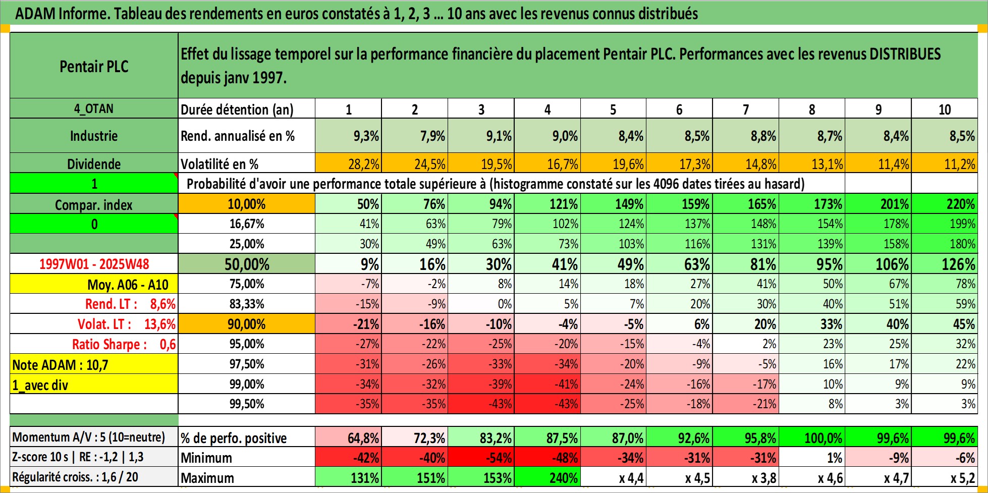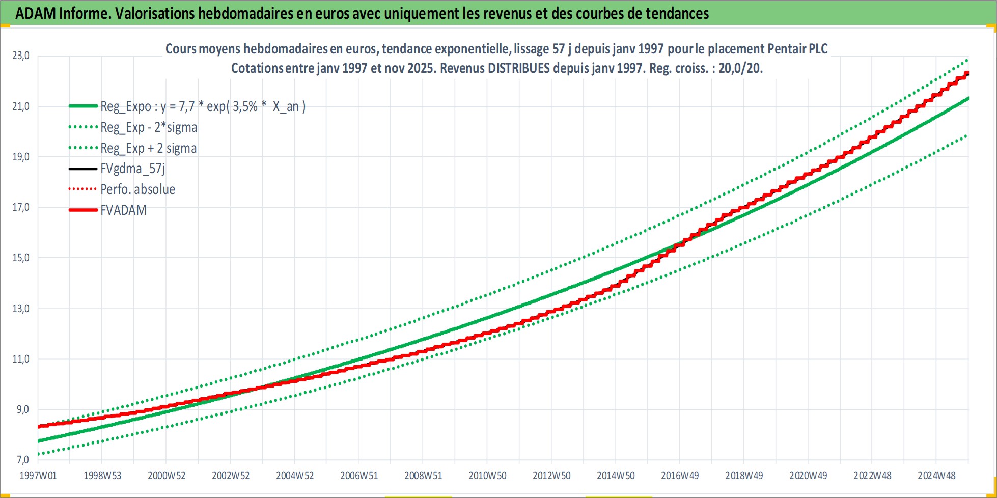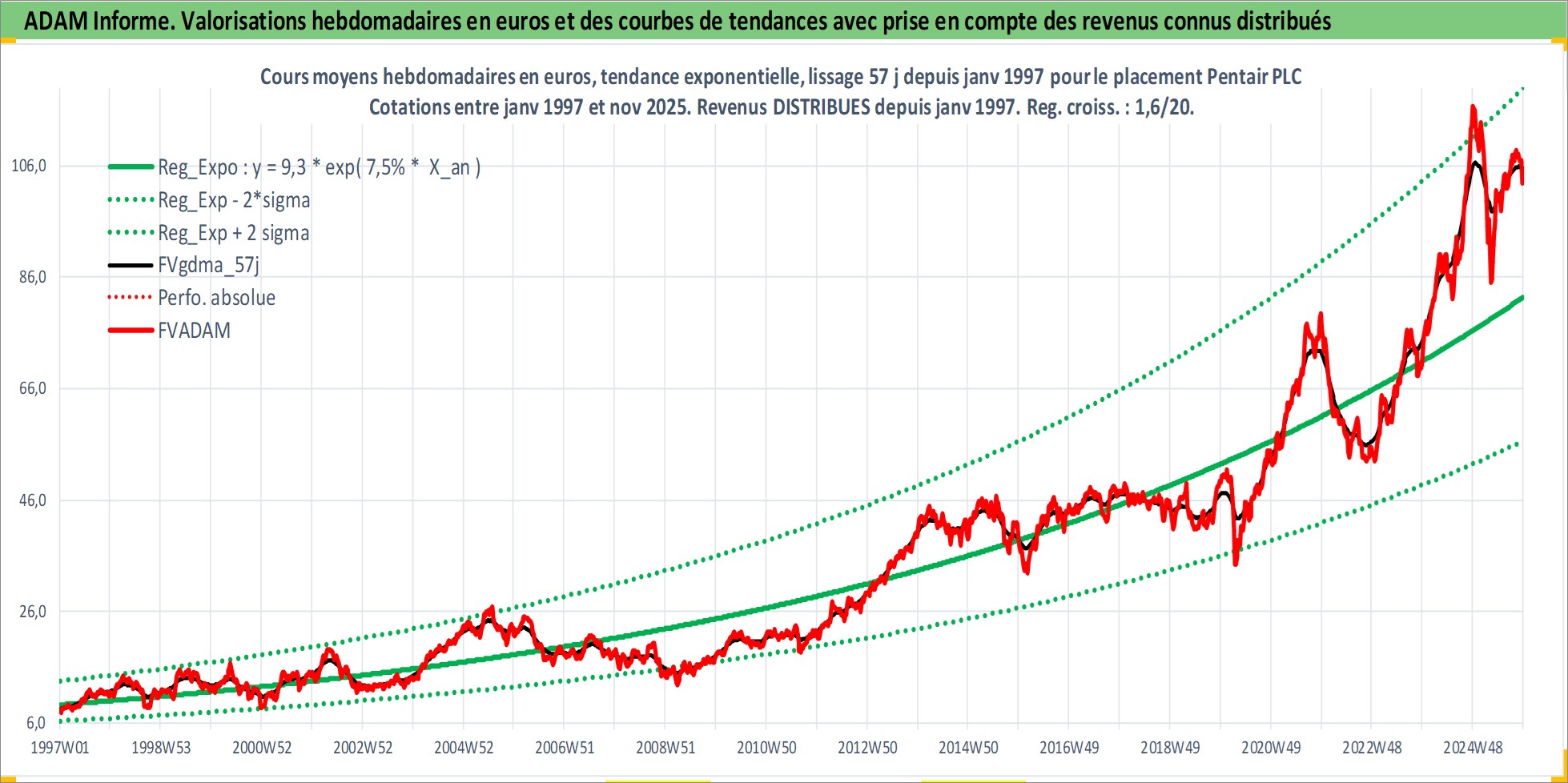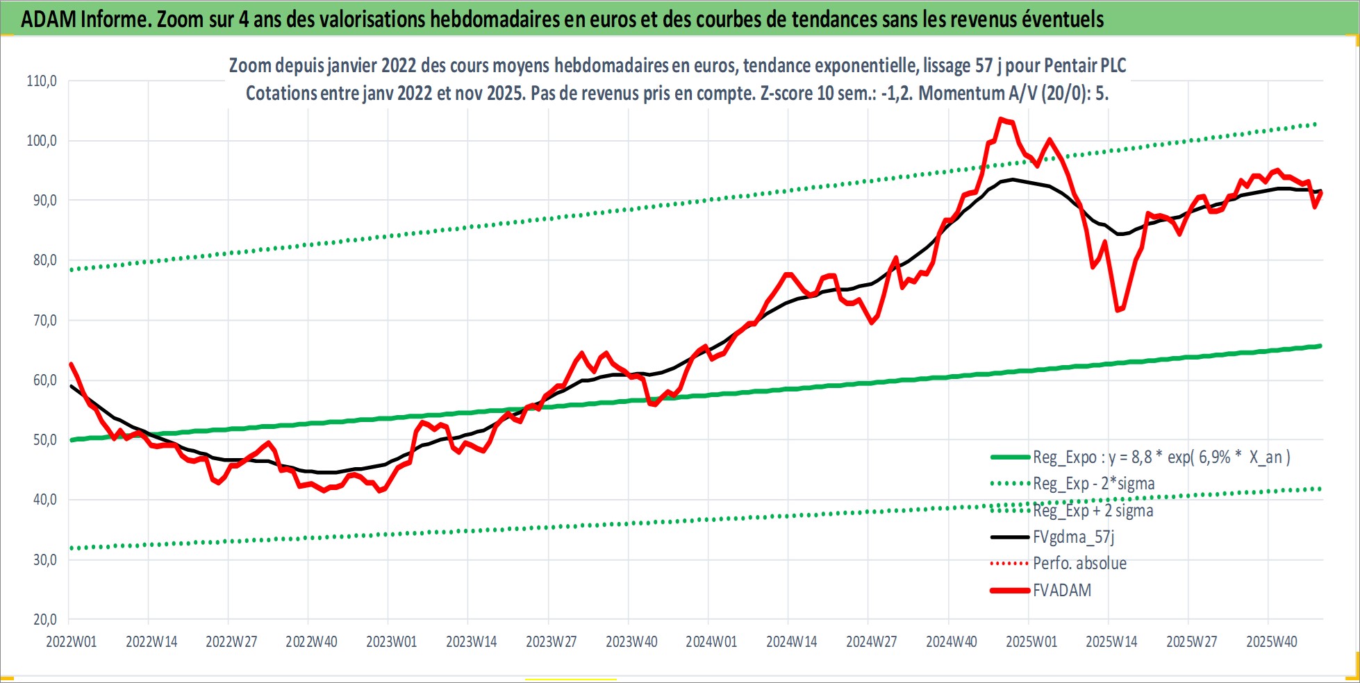 Site dédié aux investisseursPage dédiée sur site financeAnalyse des valorisations hebdomadaires de l'action Pentair PLC. Cet actif est cote en USD. Les valorisations sont en contrevaleur EURO et couvrent les semaines 1997W01 a 2025W48. Les revenus de cet actif financier sont pris en compte depuis la semaine 1997W05. La note globale ESG de cet actif est estimee a 9.0 (apres rebasage entre 0 et 20).