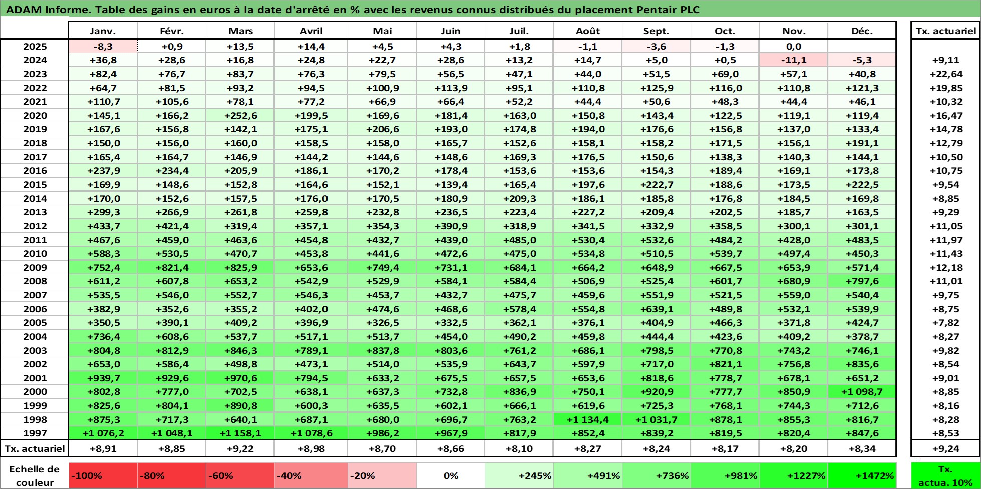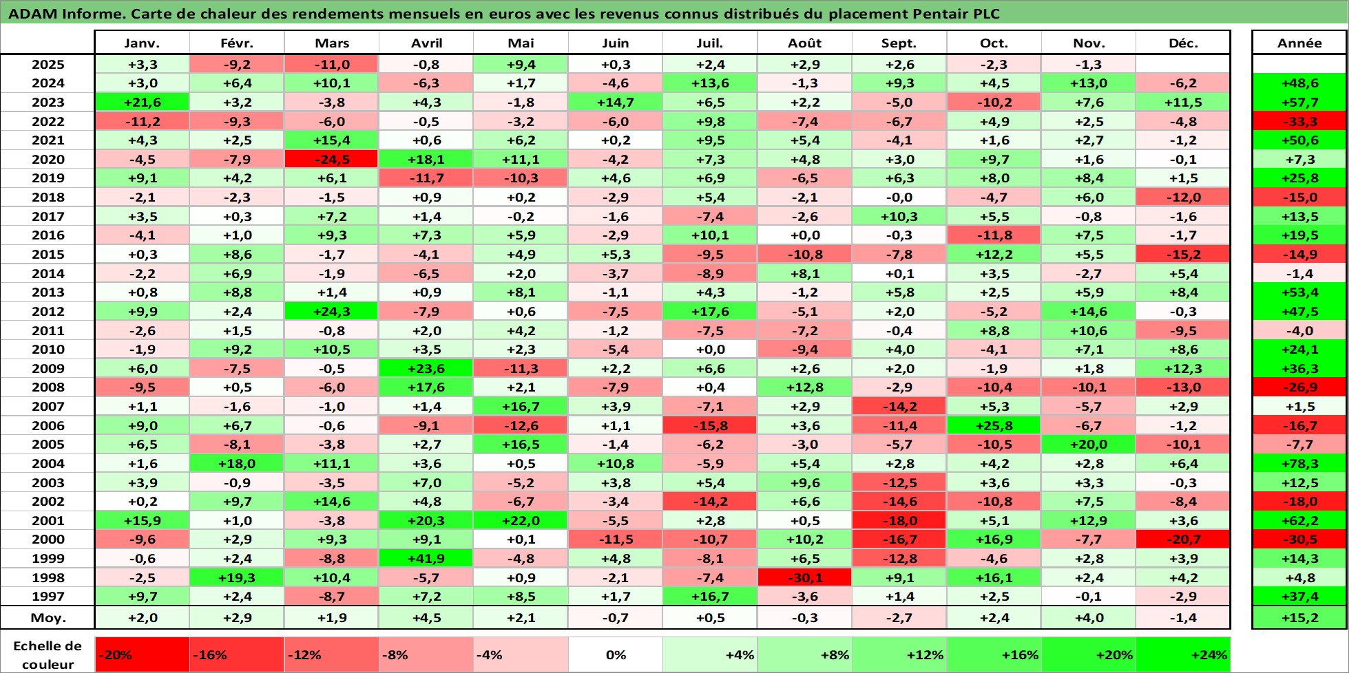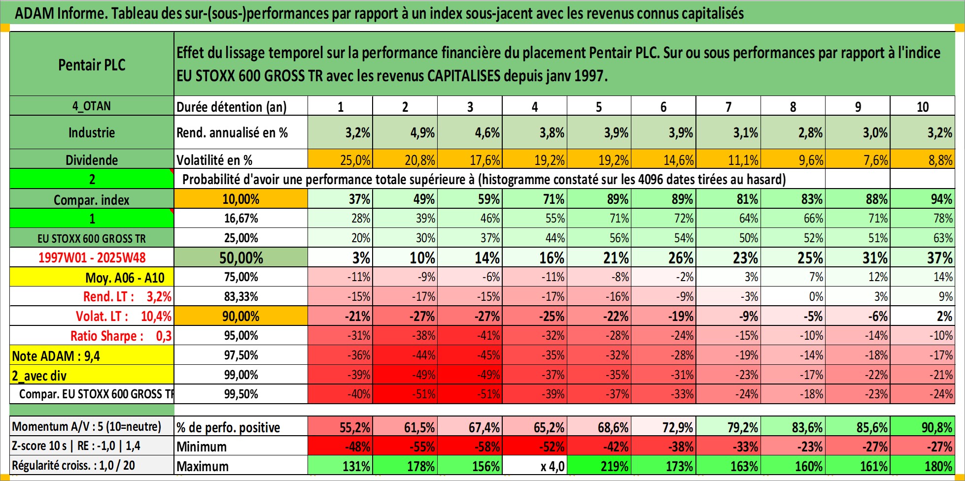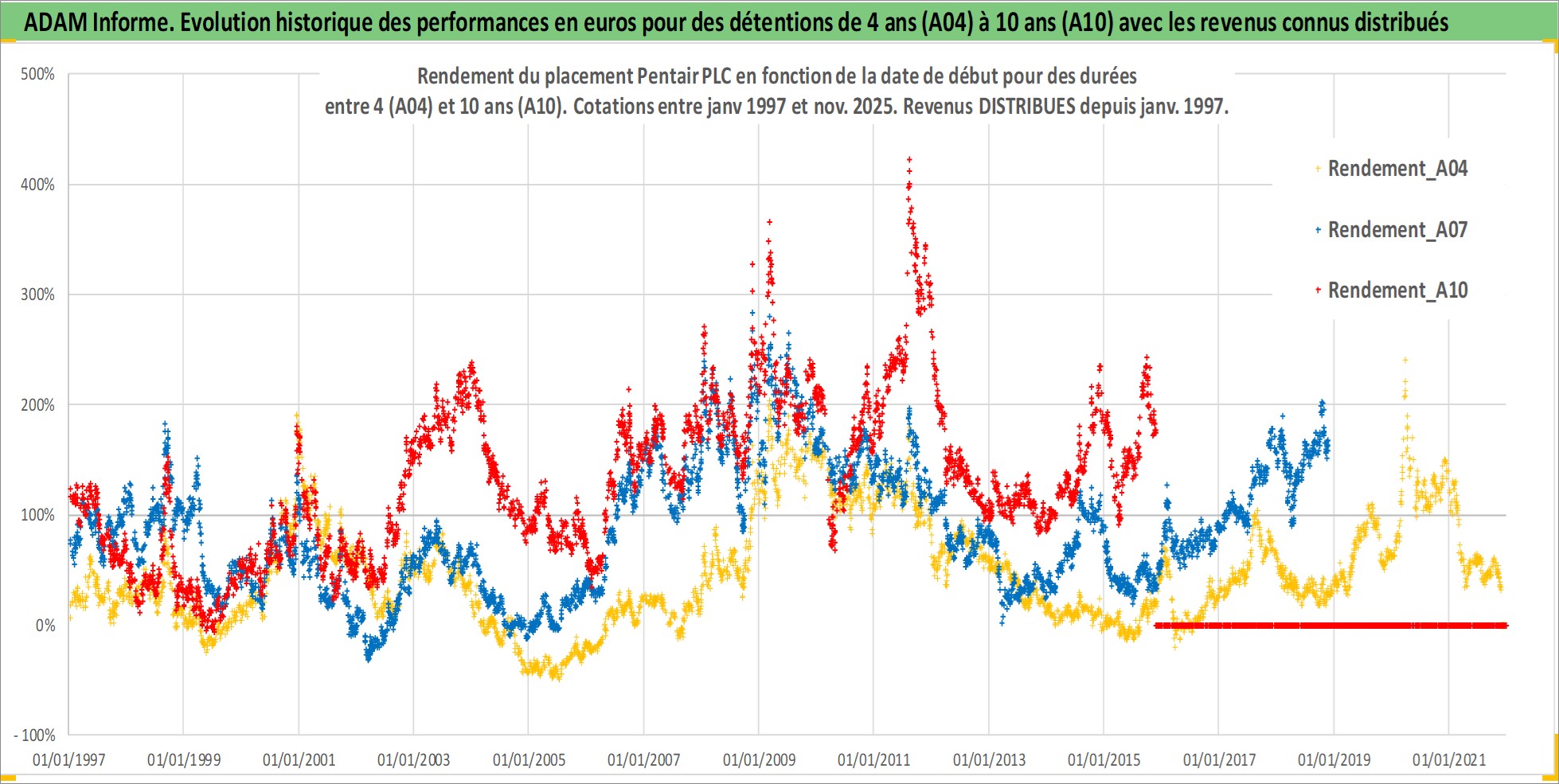 Site dédié aux investisseursPage dédiée sur site financeAnalyse des valorisations hebdomadaires de l'action Pentair PLC. Cet actif est cote en USD. Les valorisations sont en contrevaleur EURO et couvrent les semaines 1997W01 a 2025W48. Les revenus de cet actif financier sont pris en compte depuis la semaine 1997W05. La note globale ESG de cet actif est estimee a 9.0 (apres rebasage entre 0 et 20).