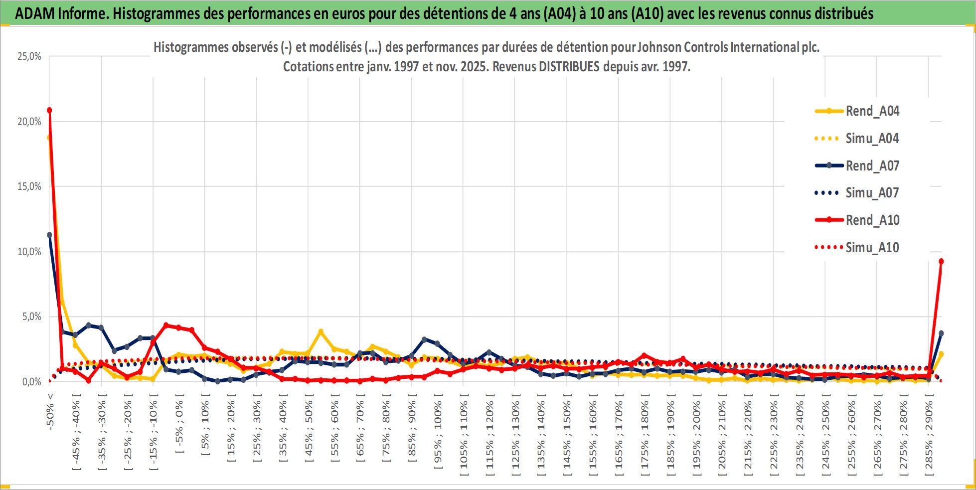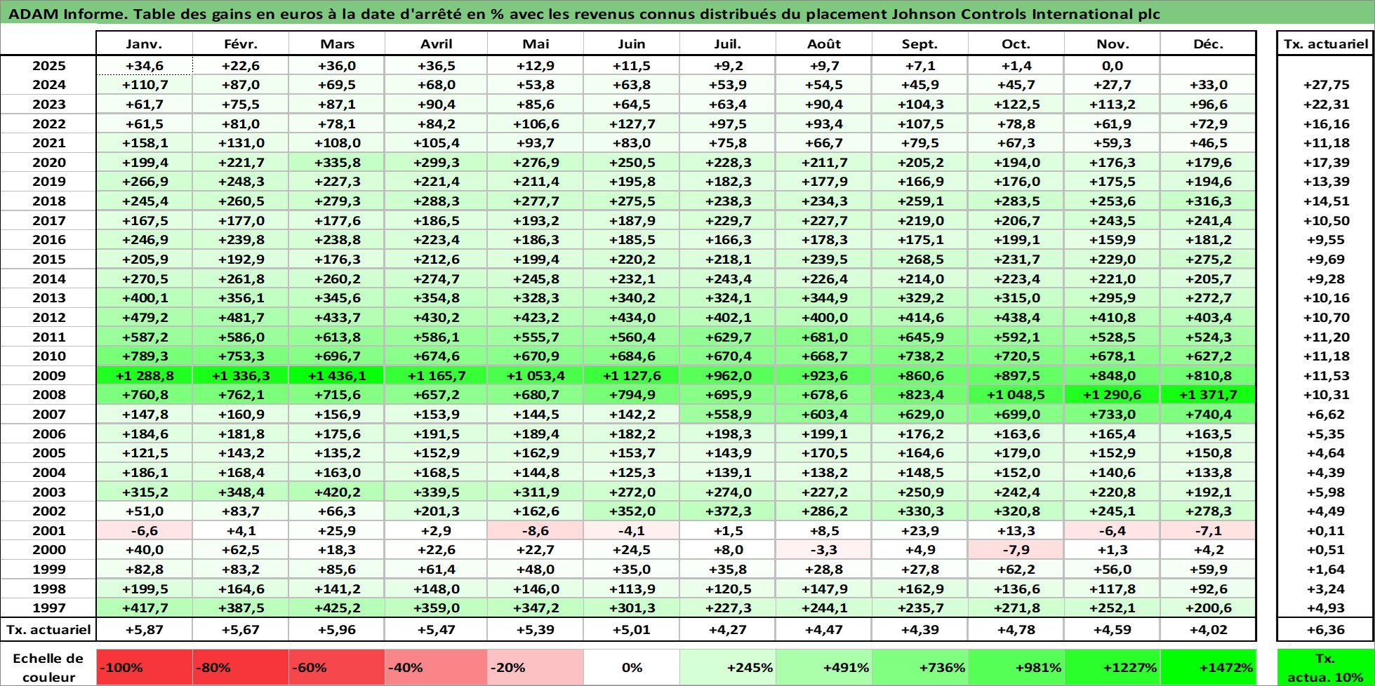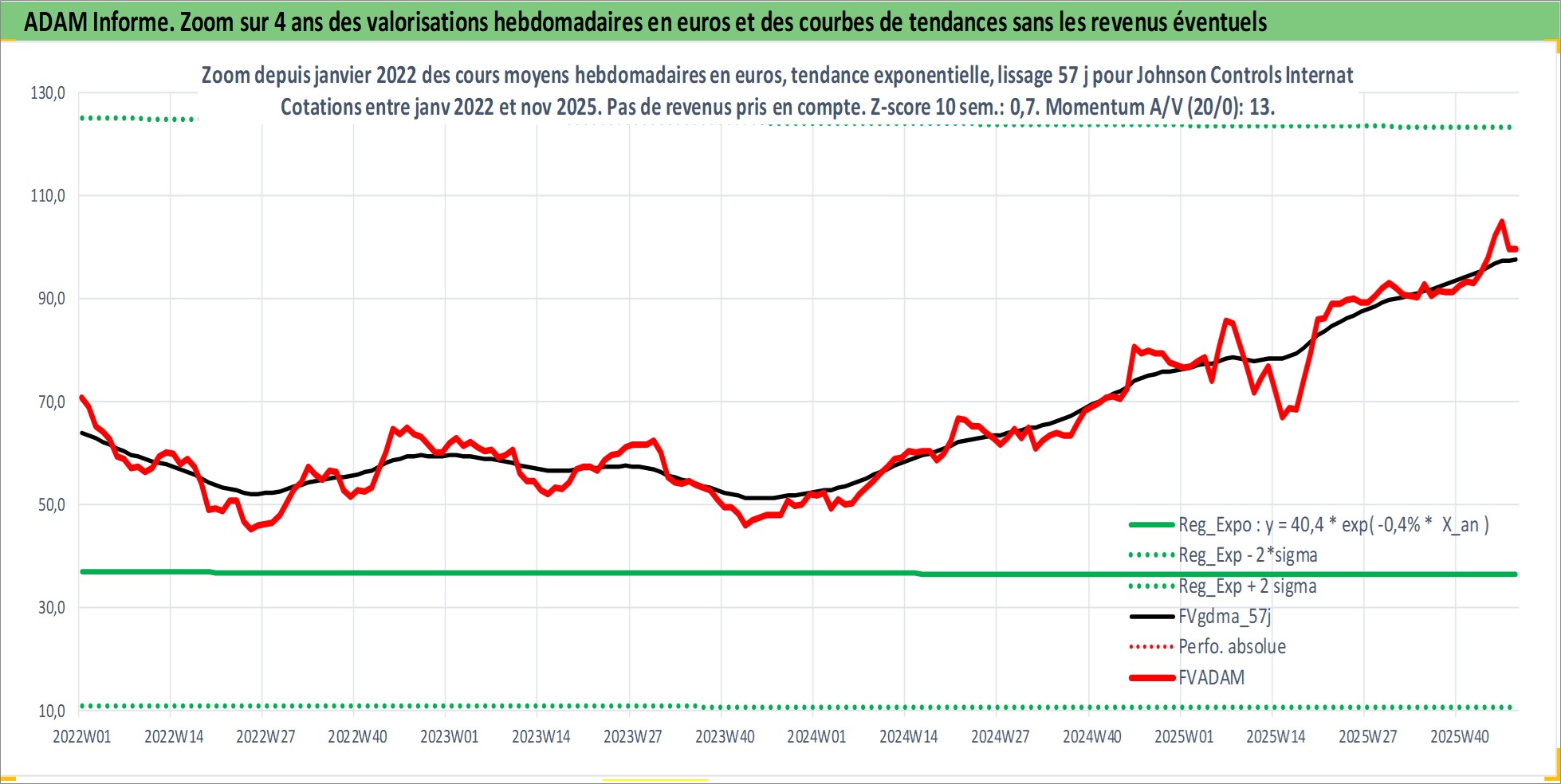 Site dédié aux investisseursPage dédiée sur site financeAnalyse des valorisations hebdomadaires de l'action Johnson Controls International plc. Cet actif est cote en USD. Les valorisations sont en contrevaleur EURO et couvrent les semaines 1997W01 a 2025W48. Les revenus de cet actif financier sont pris en compte depuis la semaine 1997W14. La note globale ESG de cet actif est estimee a 13.0 (apres rebasage entre 0 et 20).