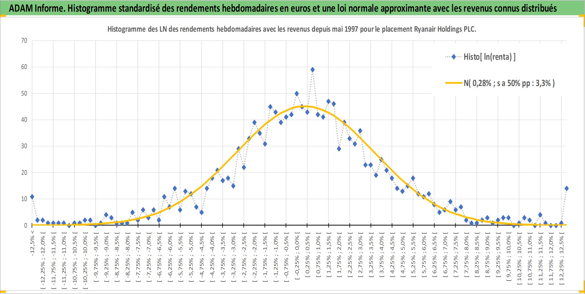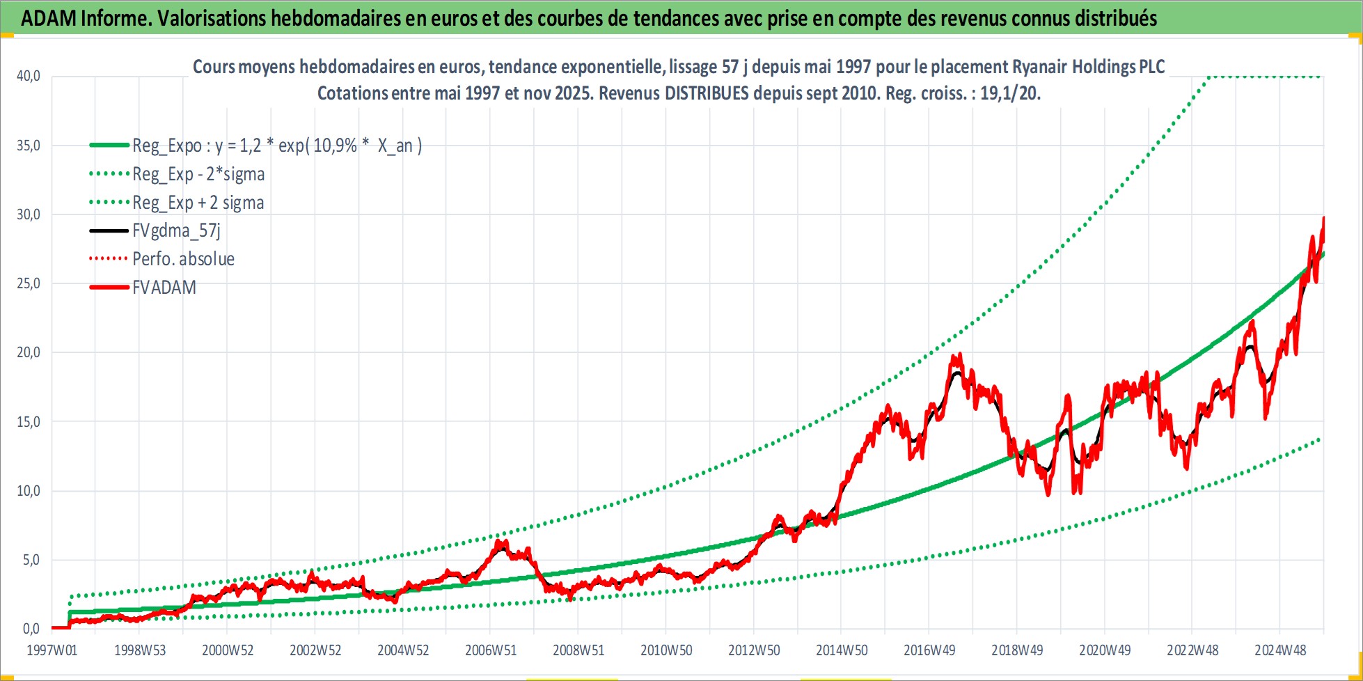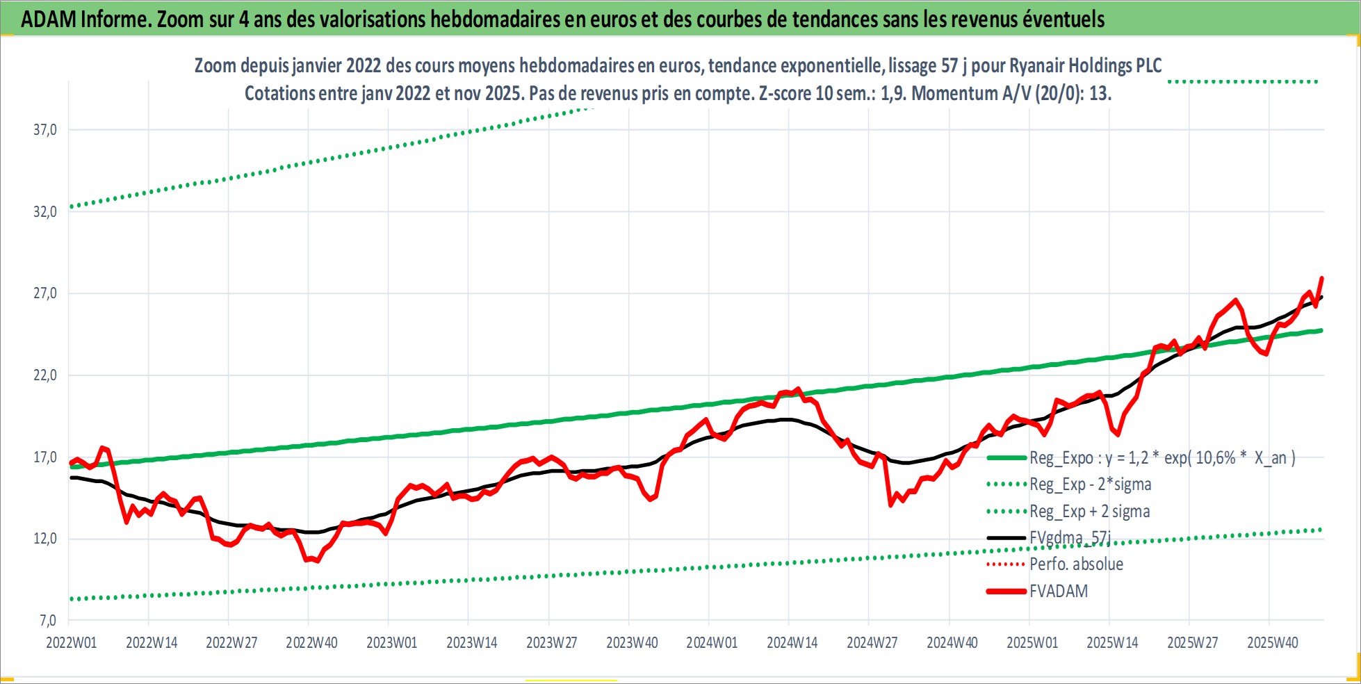 Site dédié aux investisseursPage dédiée sur site financeAnalyse des valorisations hebdomadaires de l'action Ryanair Holdings PLC. Cet actif est cote en EUR. Les valorisations couvrent les semaines 1997W22 a 2025W48. Les revenus de cet actif financier sont pris en compte depuis la semaine 2010W37. La note globale ESG de cet actif est estimee a 8.0 (apres rebasage entre 0 et 20).