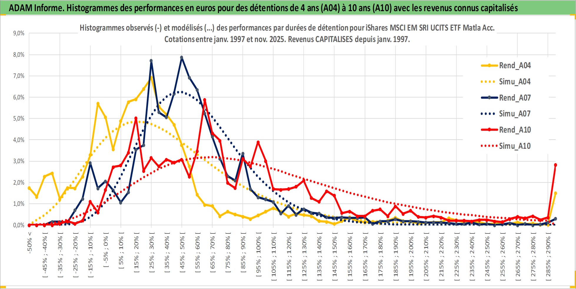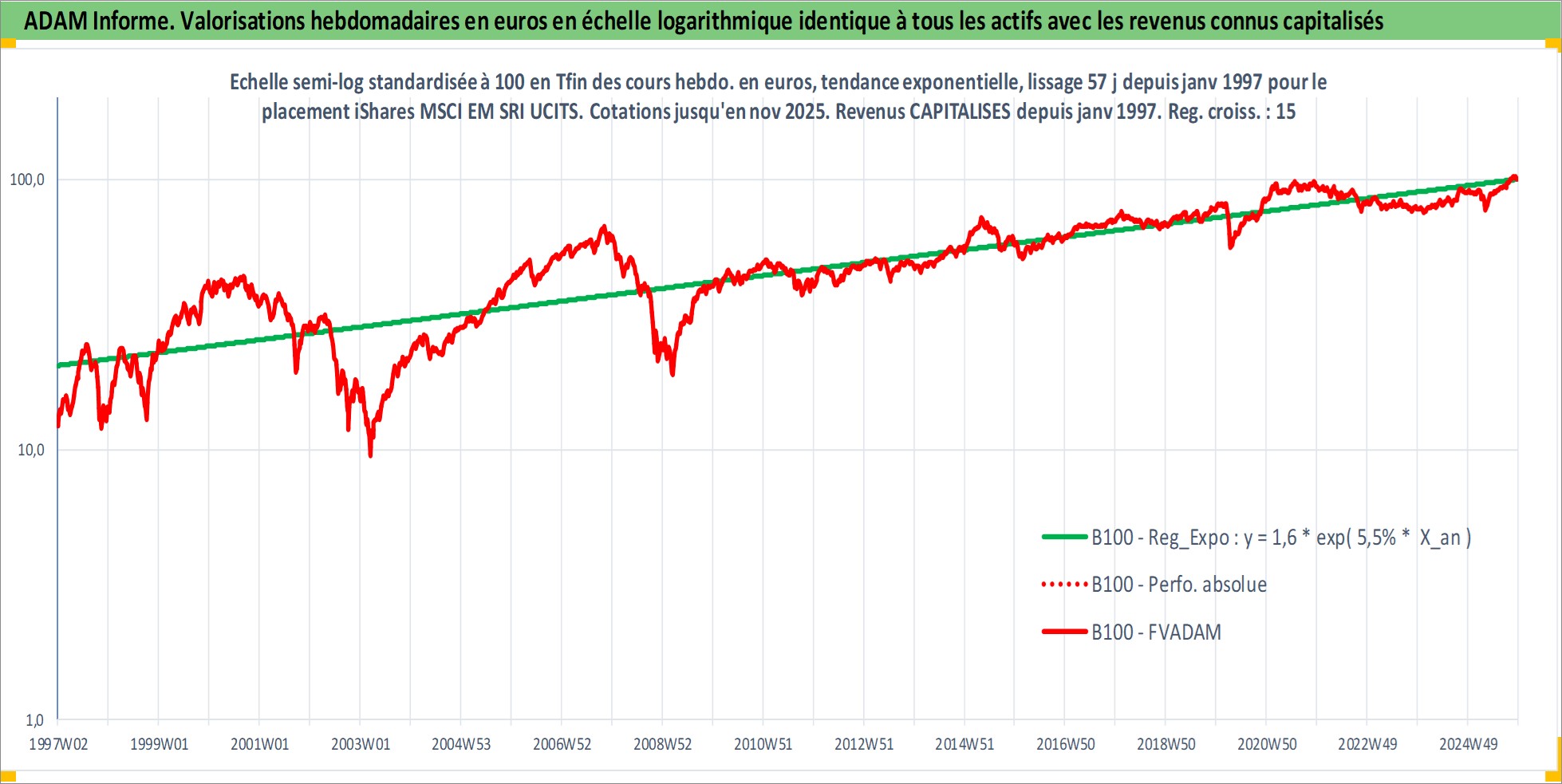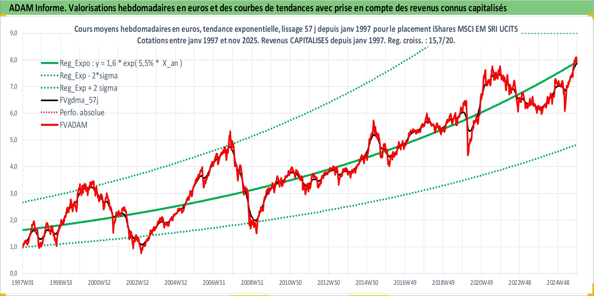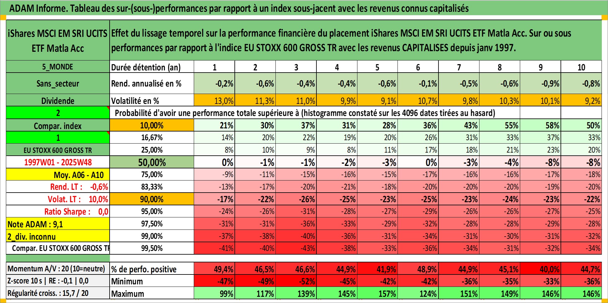 Site dédié aux investisseursPage dédiée sur site financeAnalyse des valorisations hebdomadaires du fonds iShares MSCI EM SRI UCITS ETF Matla Acc. Cet actif est cote en USD. Les valorisations sont en contrevaleur EURO et couvrent les semaines 1997W01 a 2025W48. Les revenus de cet actif financier sont pris en compte depuis la semaine 1997W01. La note globale ESG de cet actif est estimee a 7.4 (apres rebasage entre 0 et 20).