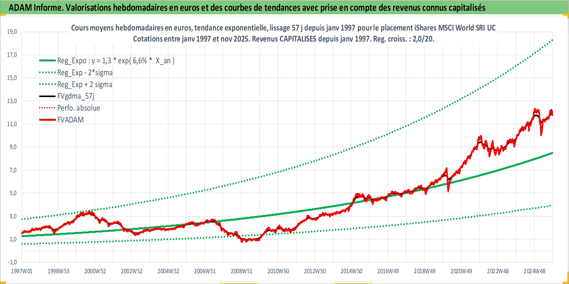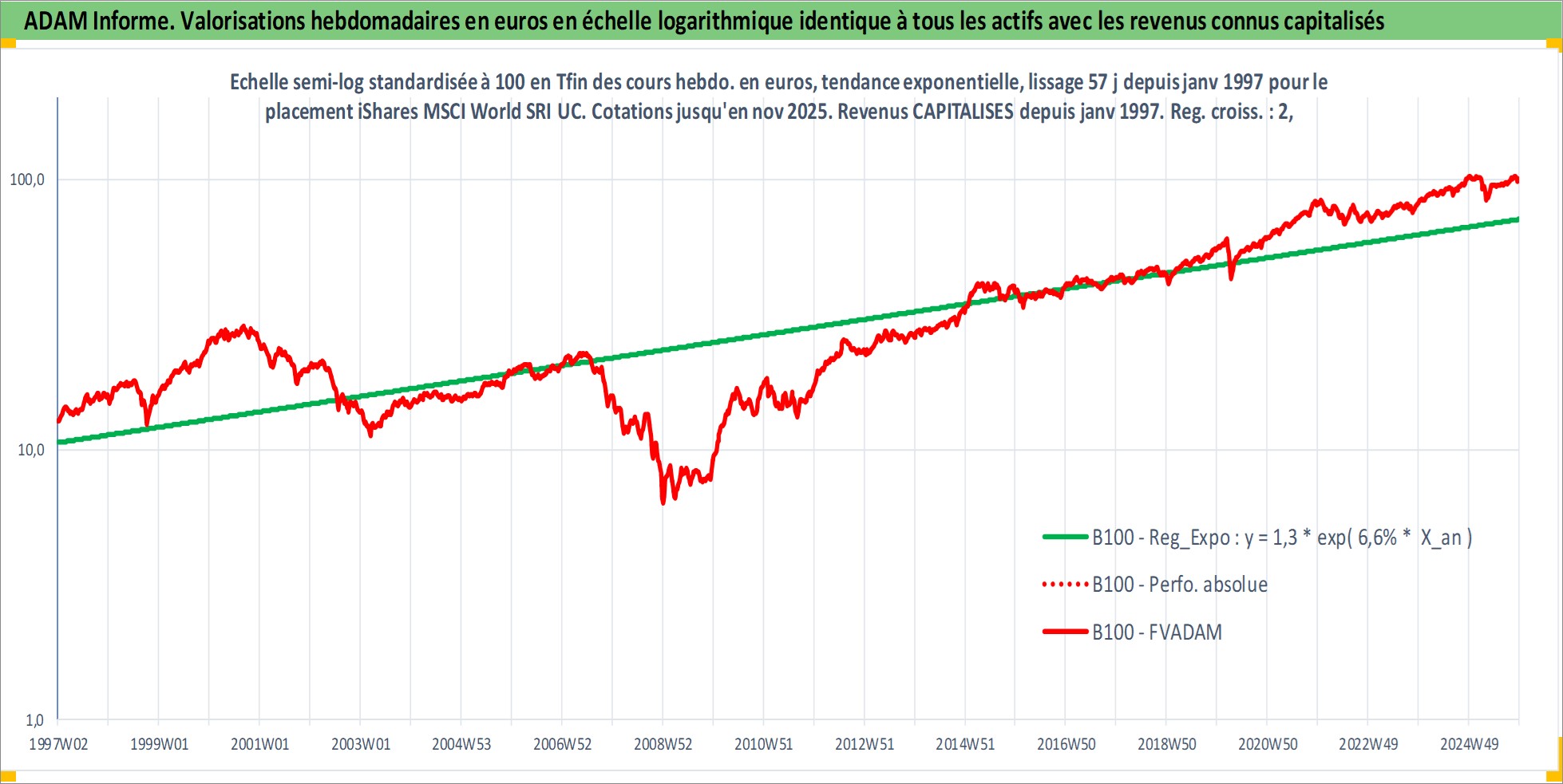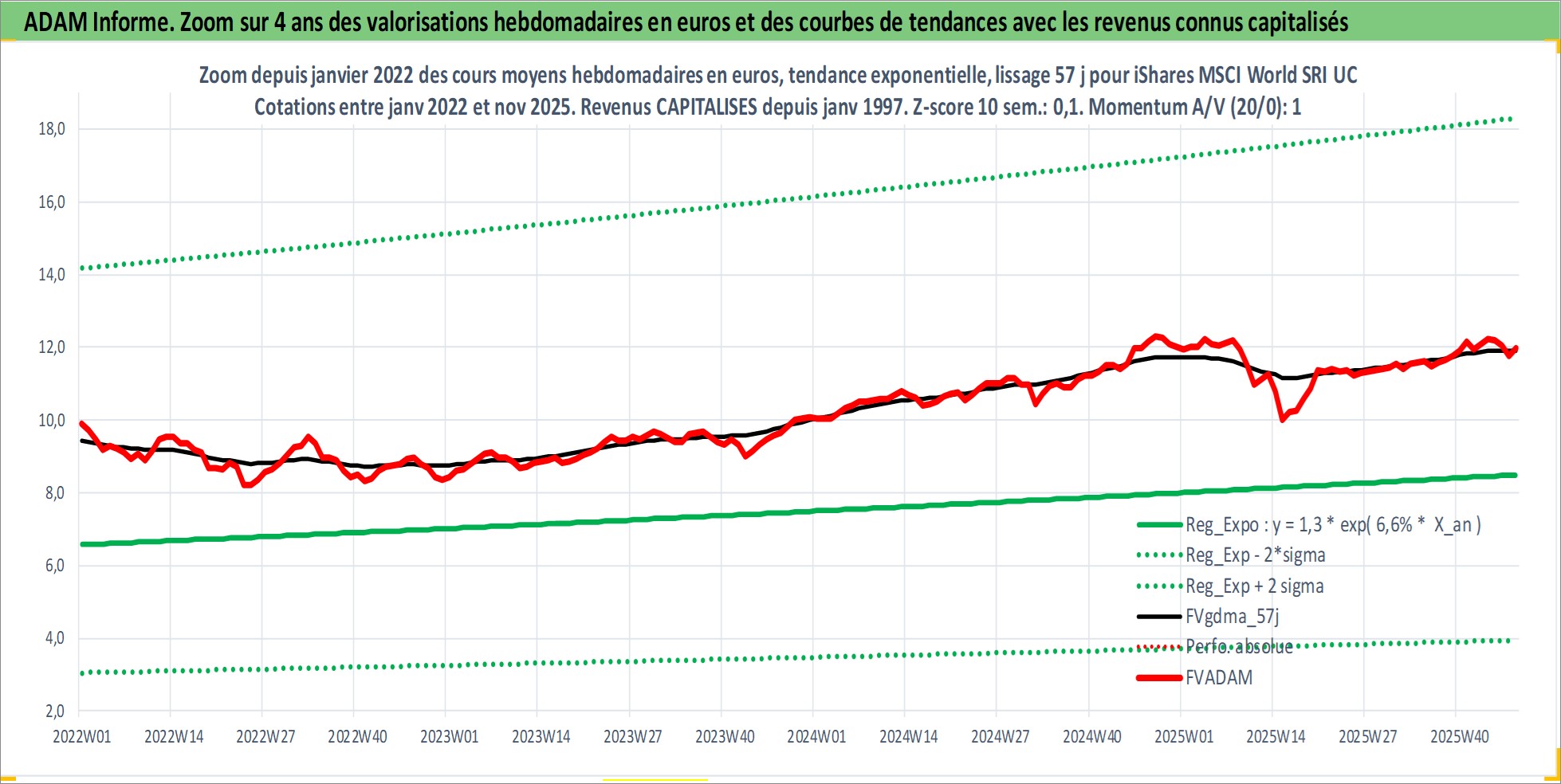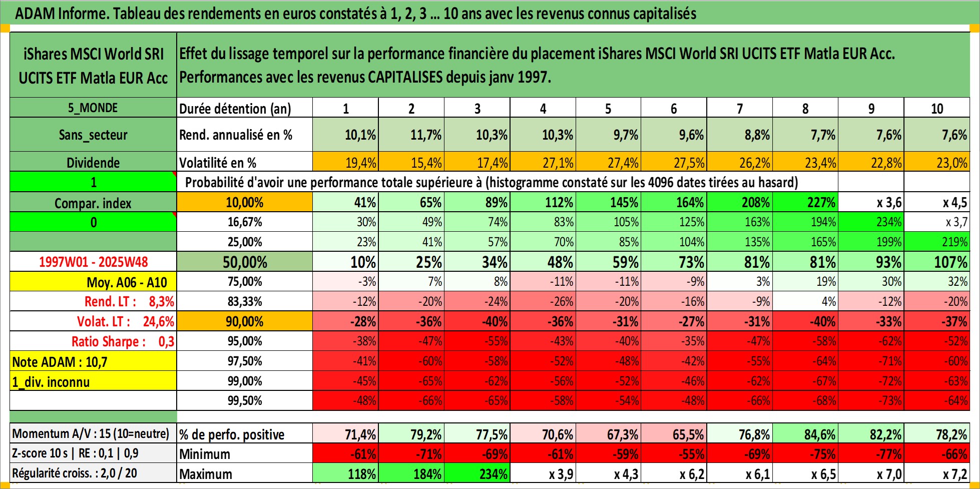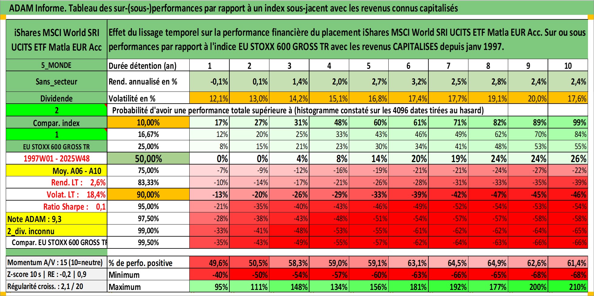 Site dédié aux investisseursPage dédiée sur site financeAnalyse des valorisations hebdomadaires du fonds iShares MSCI World SRI UCITS ETF Matla EUR Acc. Cet actif est cote en EUR. Les valorisations couvrent les semaines 1997W01 a 2025W48. Les revenus de cet actif financier sont pris en compte depuis la semaine 1997W01. La note globale ESG de cet actif est estimee a 8.3 (apres rebasage entre 0 et 20).