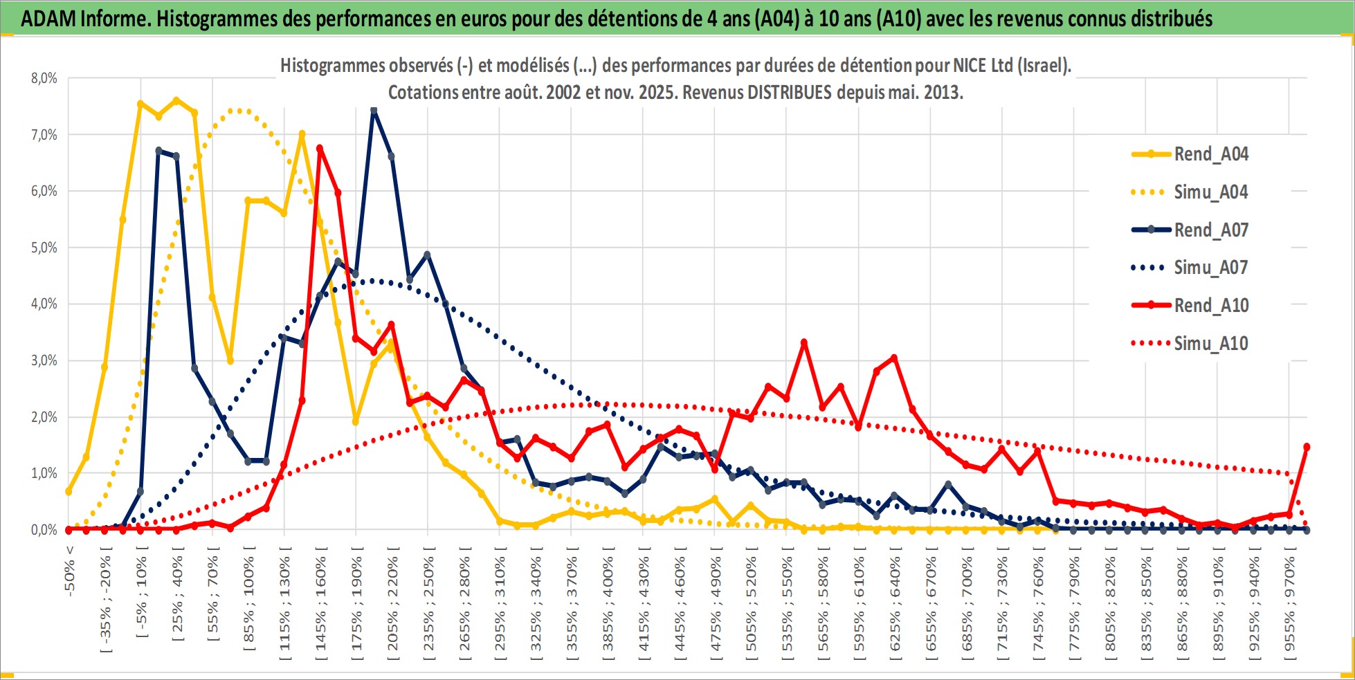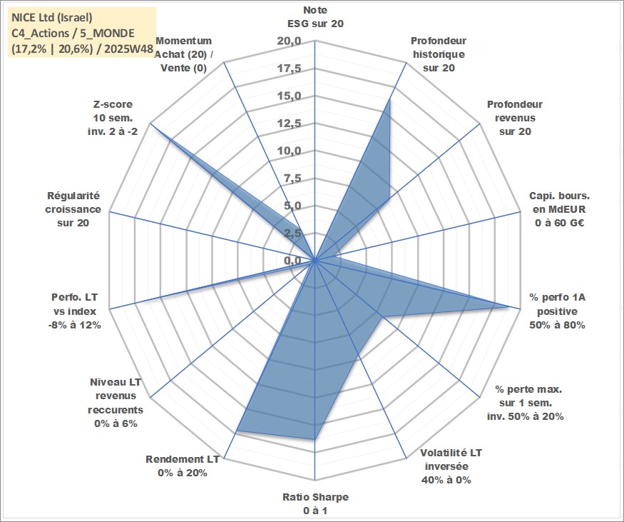 Site dédié aux investisseursPage dédiée sur site financeAnalyse des valorisations hebdomadaires de l'action NICE Ltd (Israel). Cet actif est cote en ILA. Les valorisations sont en contrevaleur EURO et couvrent les semaines 2002W33 a 2025W48. Les revenus de cet actif financier sont pris en compte depuis la semaine 2013W21. La note ESG de cet actif n'est pas connue.