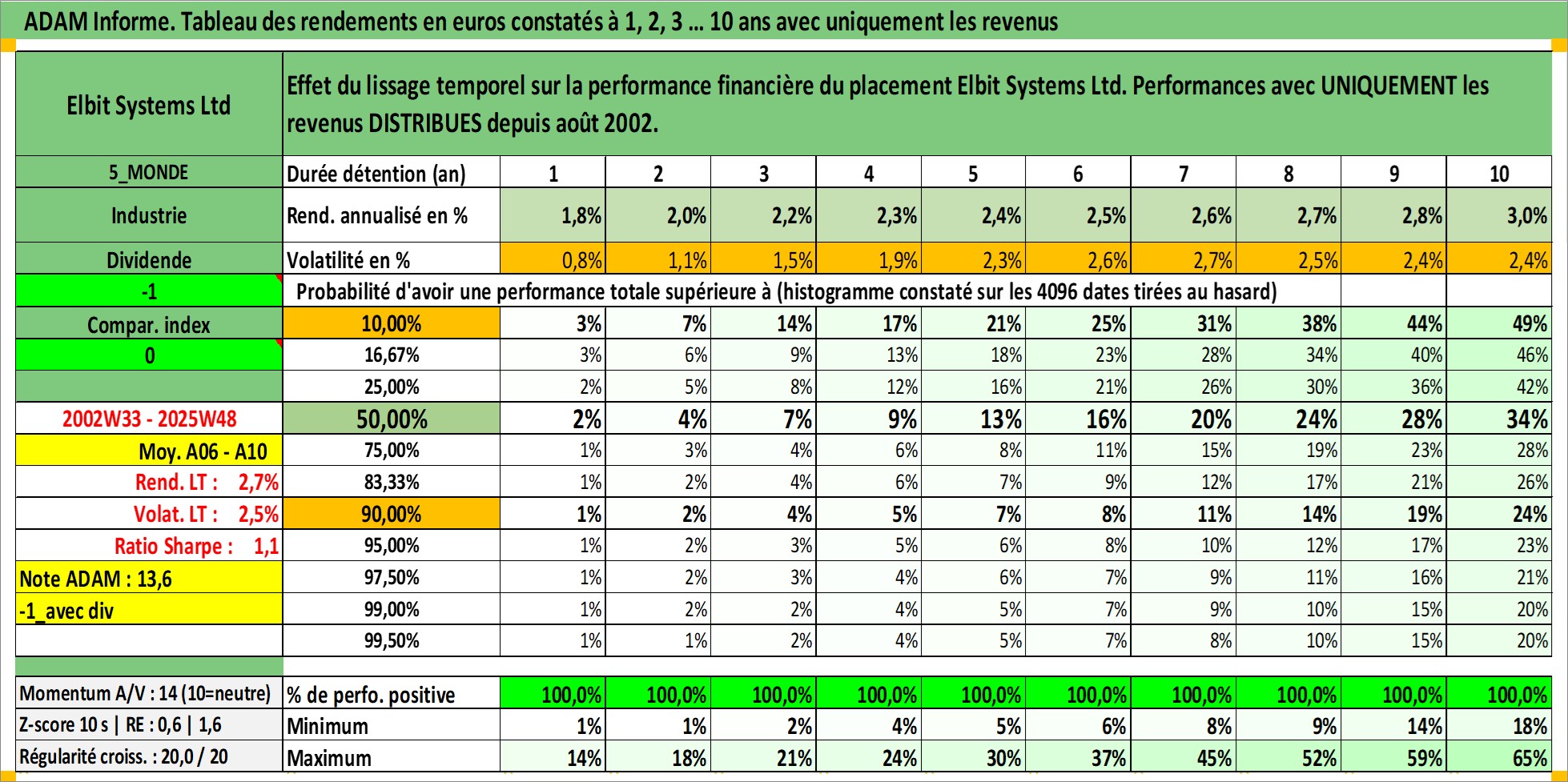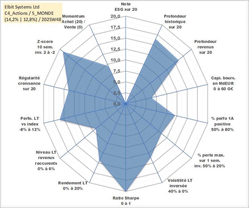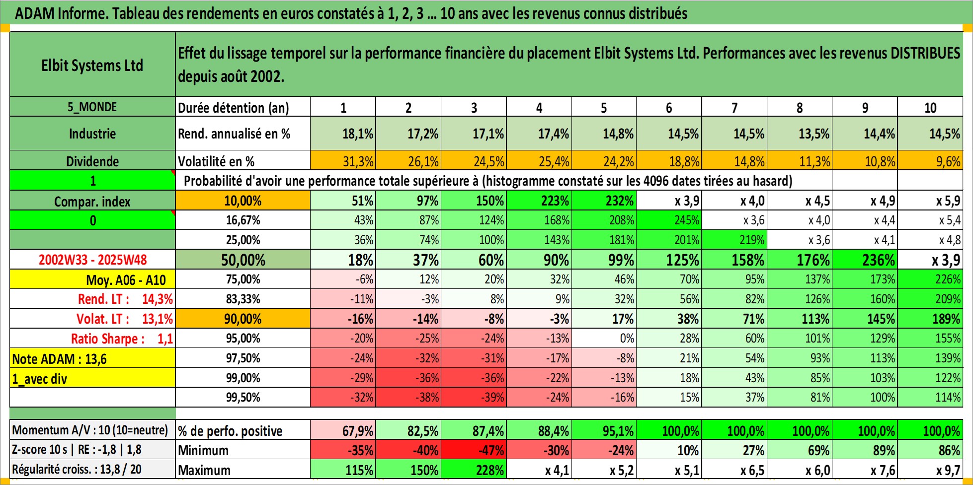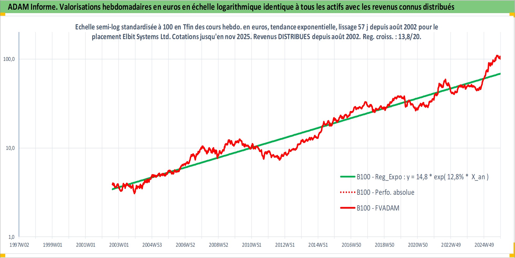 Site dédié aux investisseursPage dédiée sur site financeAnalyse des valorisations hebdomadaires de l'action Elbit Systems Ltd. Cet actif est cote en ILA. Les valorisations sont en contrevaleur EURO et couvrent les semaines 2002W33 a 2025W48. Les revenus de cet actif financier sont pris en compte depuis la semaine 2002W35. La note ESG de cet actif n'est pas connue.