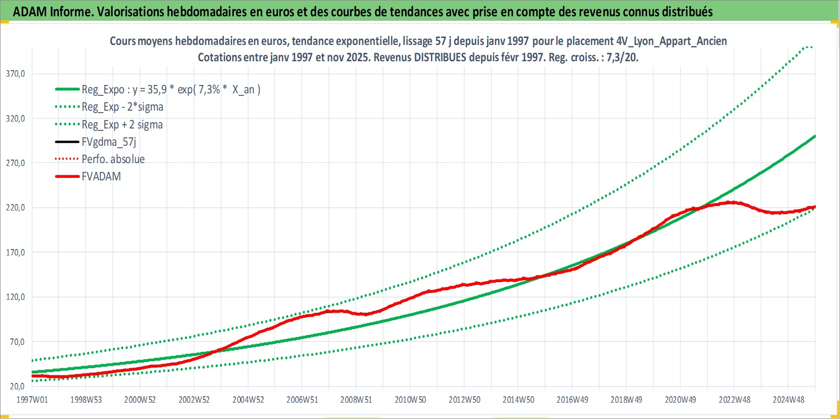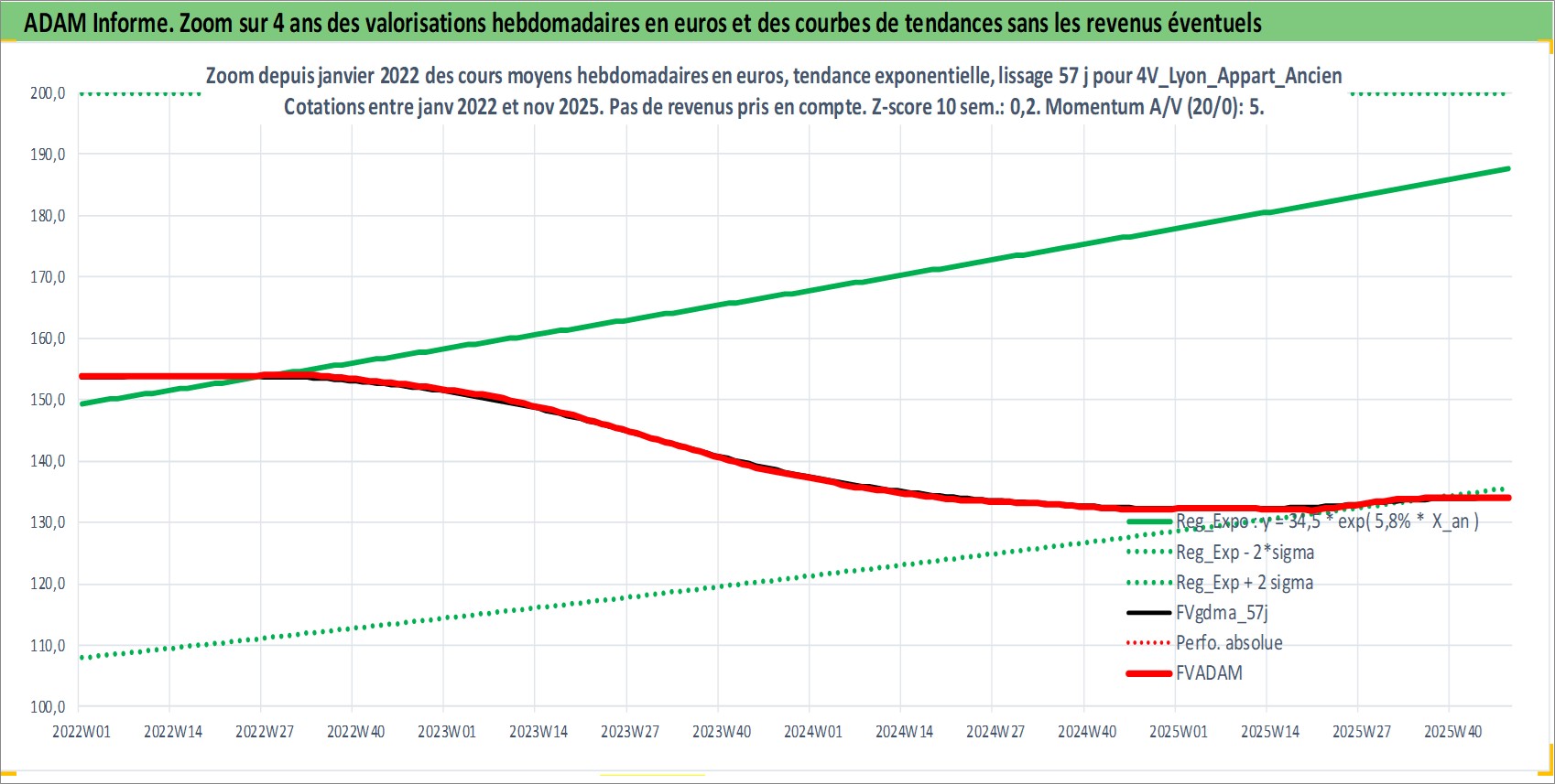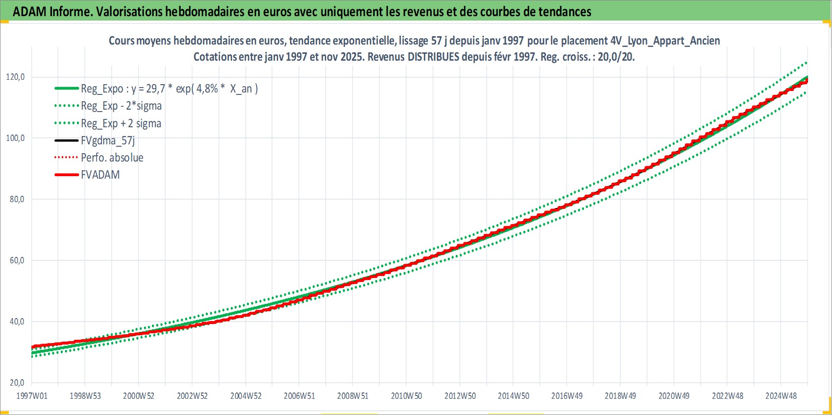 Site dédié aux investisseursPage dédiée sur site financeAnalyse des valorisations hebdomadaires de l'actif 4V_Lyon_Appart_Ancien. Cet actif est cote en EUR. Les valorisations couvrent les semaines 1997W01 a 2025W48. Les loyers de cet actif immobilier sont pris egaux a 3,33% annuels de la valeur venale du logement.
