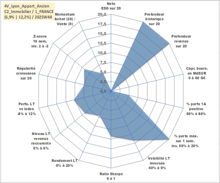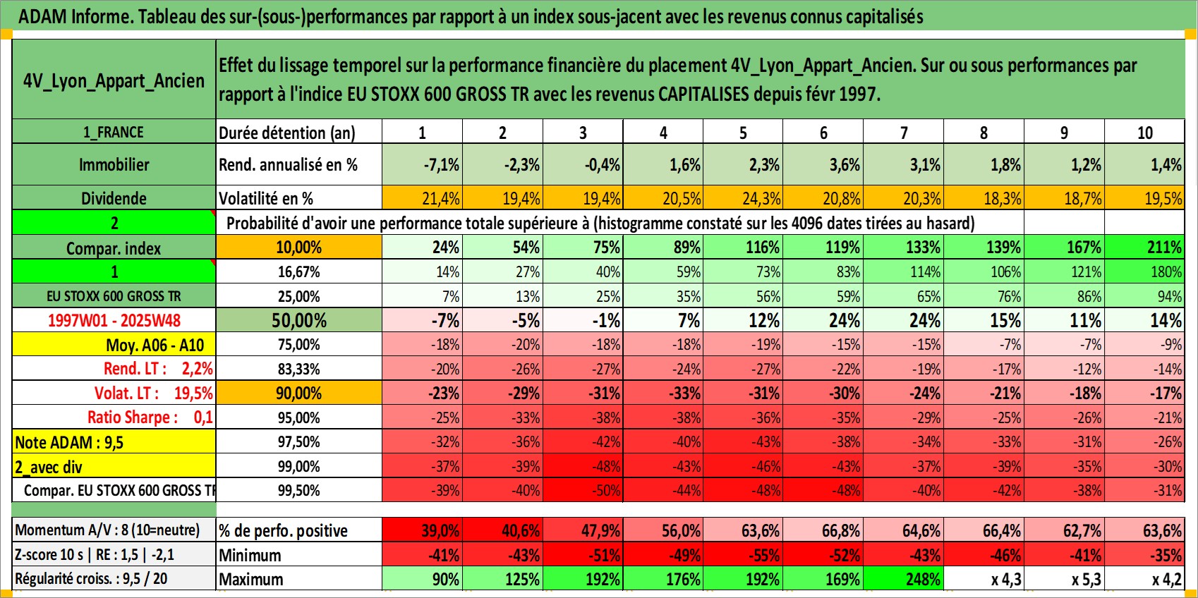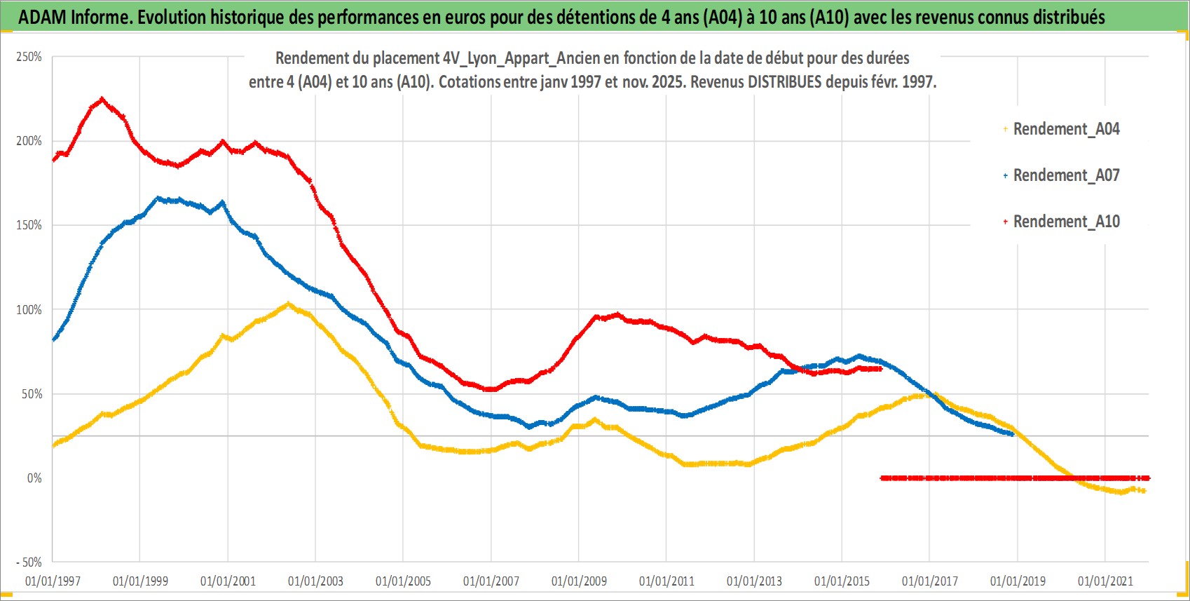 Site dédié aux investisseursPage dédiée sur site financeAnalyse des valorisations hebdomadaires de l'actif 4V_Lyon_Appart_Ancien. Cet actif est cote en EUR. Les valorisations couvrent les semaines 1997W01 a 2025W48. Les loyers de cet actif immobilier sont pris egaux a 3,33% annuels de la valeur venale du logement.