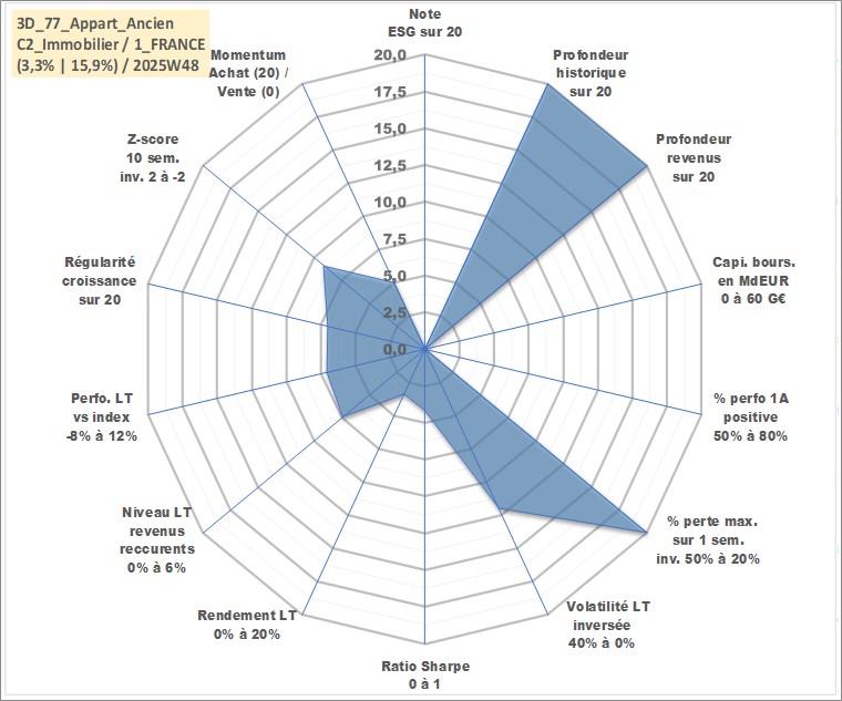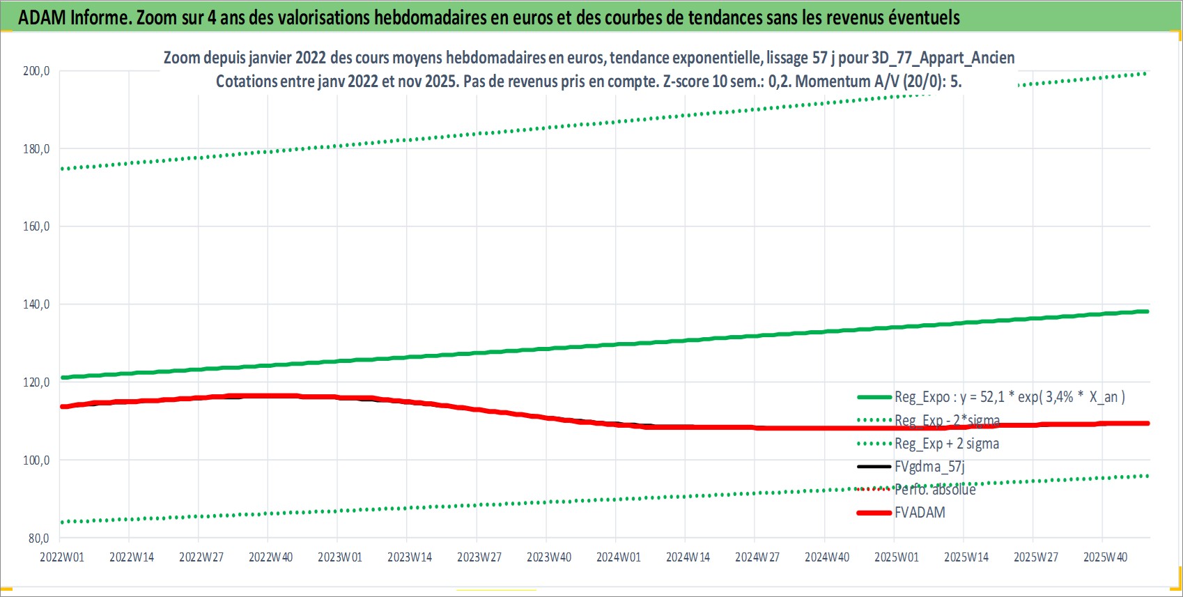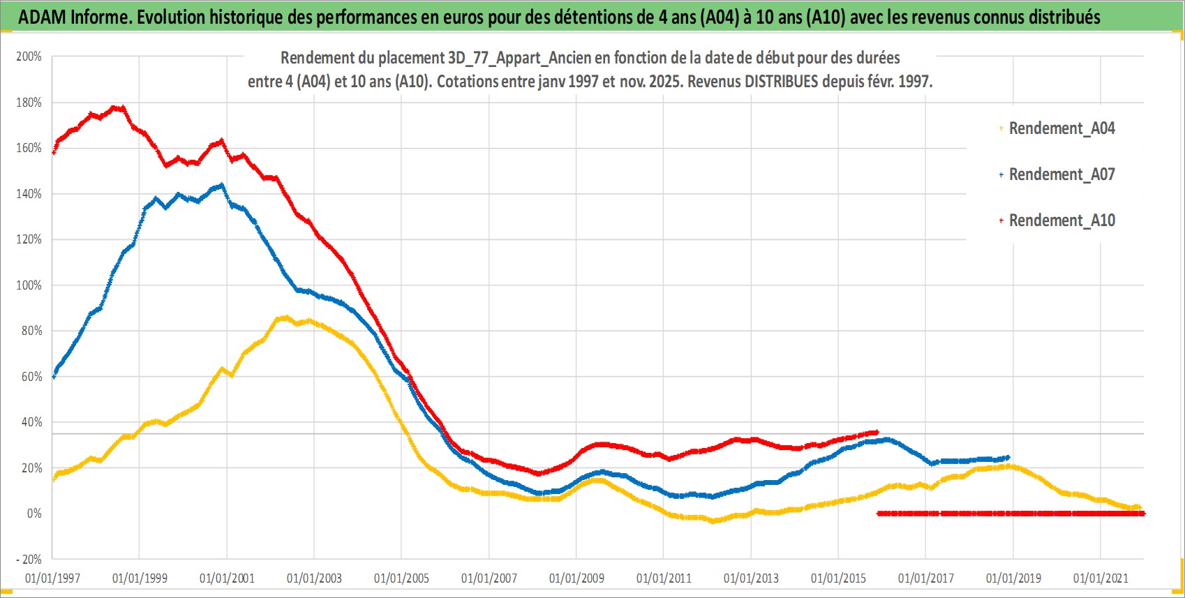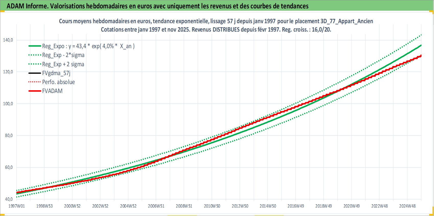 Site dédié aux investisseursPage dédiée sur site financeAnalyse des valorisations hebdomadaires de l'actif 3D_77_Appart_Ancien. Cet actif est cote en EUR. Les valorisations couvrent les semaines 1997W01 a 2025W48. Les loyers de cet actif immobilier sont pris egaux a 3,33% annuels de la valeur venale du logement.