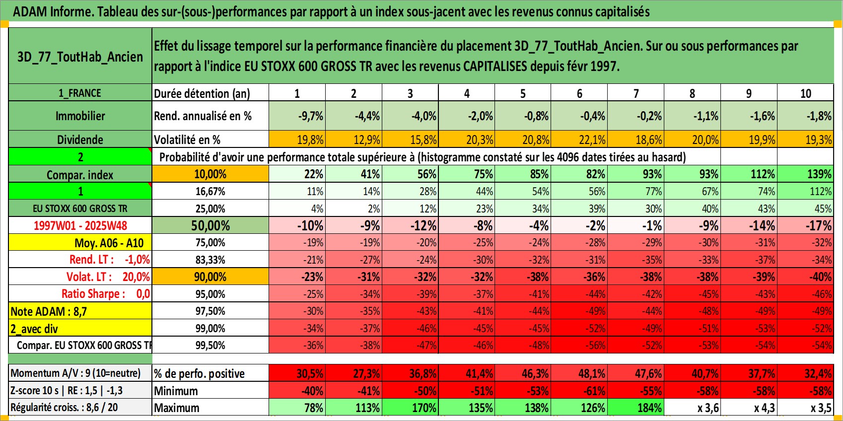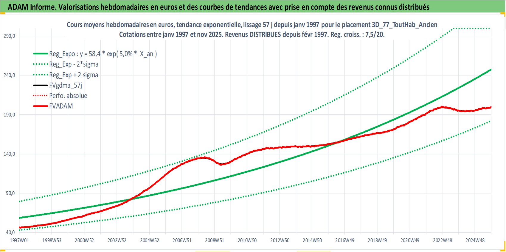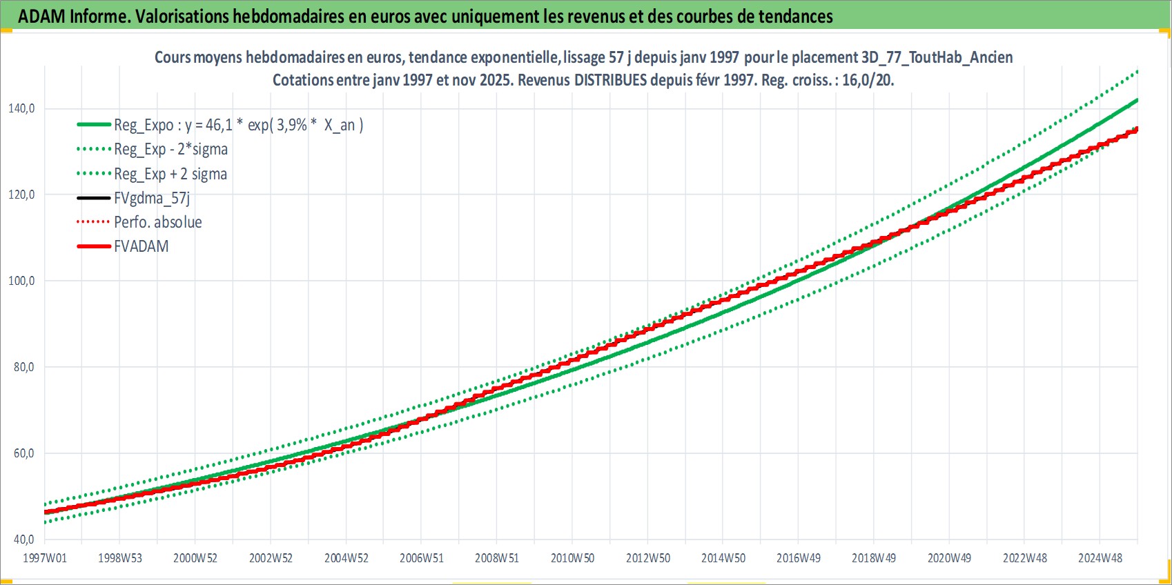 Site dédié aux investisseursPage dédiée sur site financeAnalyse des valorisations hebdomadaires de l'actif 3D_77_ToutHab_Ancien. Cet actif est cote en EUR. Les valorisations couvrent les semaines 1997W01 a 2025W48. Les loyers de cet actif immobilier sont pris egaux a 3,33% annuels de la valeur venale du logement.