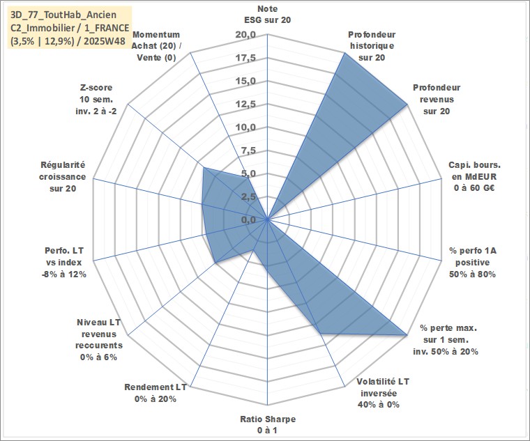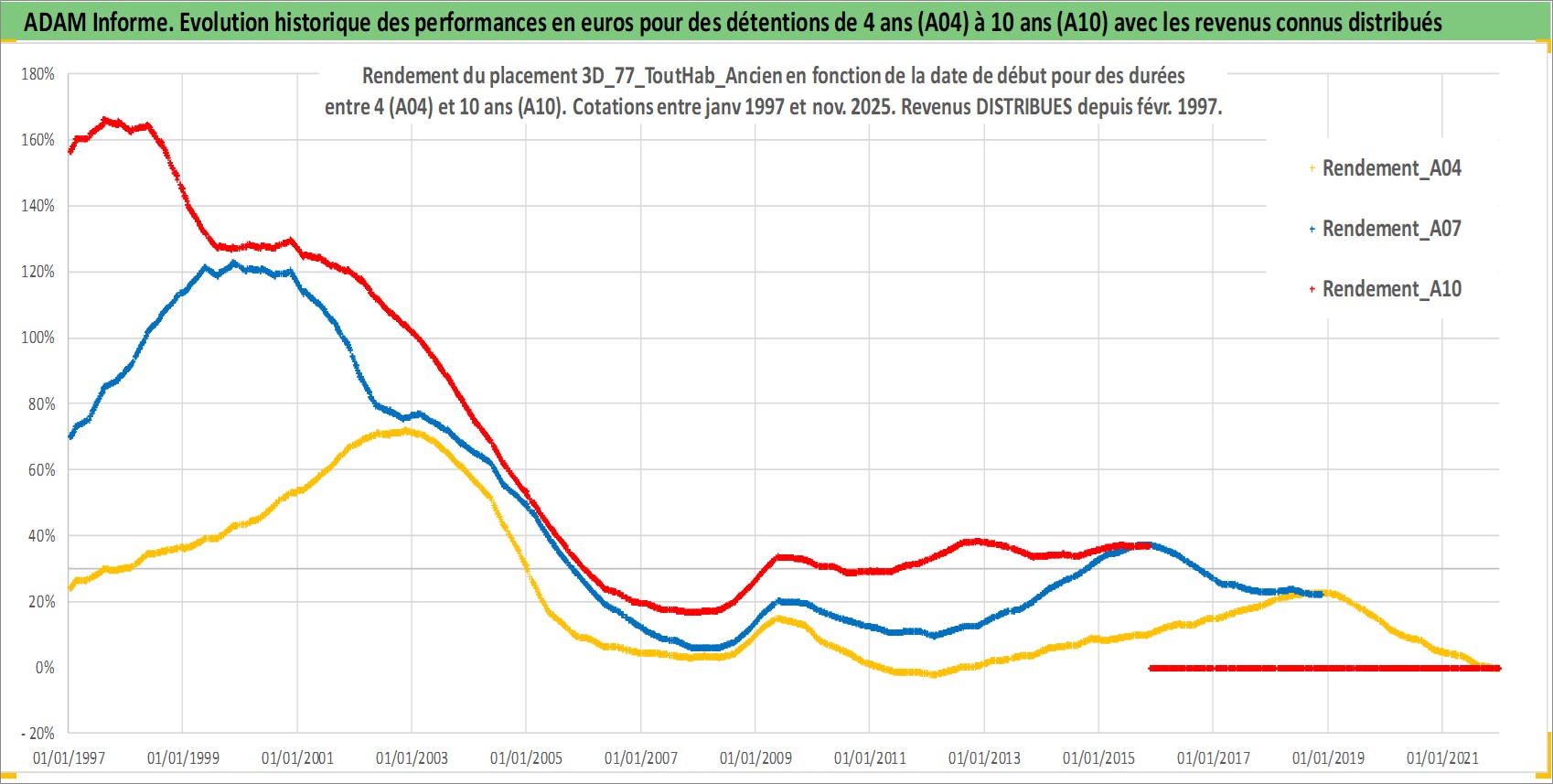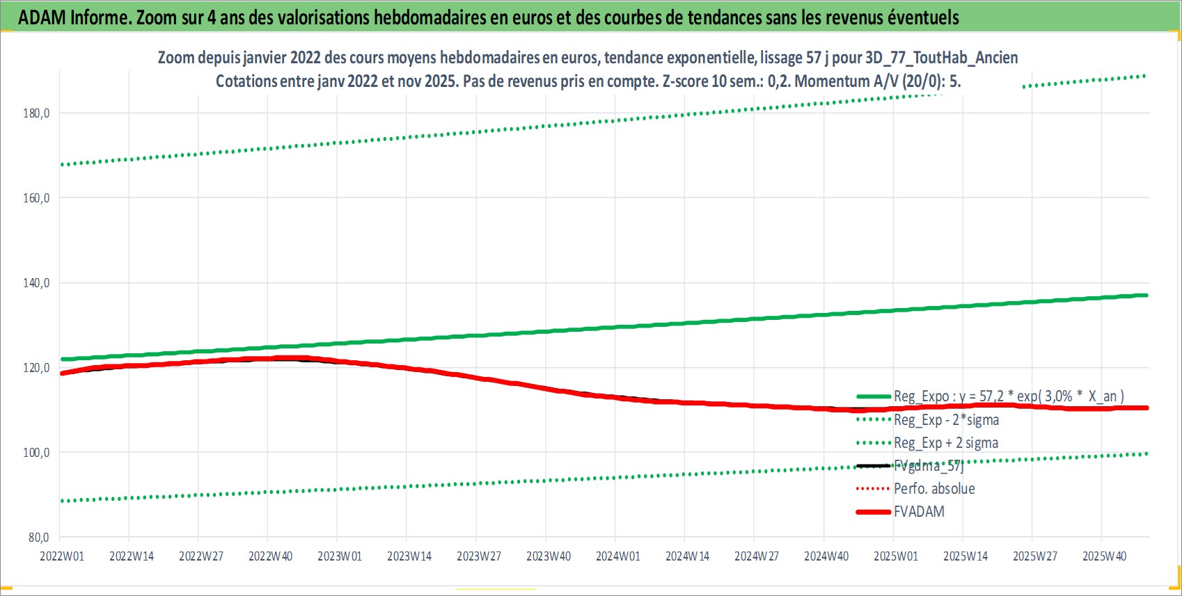 Site dédié aux investisseursPage dédiée sur site financeAnalyse des valorisations hebdomadaires de l'actif 3D_77_ToutHab_Ancien. Cet actif est cote en EUR. Les valorisations couvrent les semaines 1997W01 a 2025W48. Les loyers de cet actif immobilier sont pris egaux a 3,33% annuels de la valeur venale du logement.