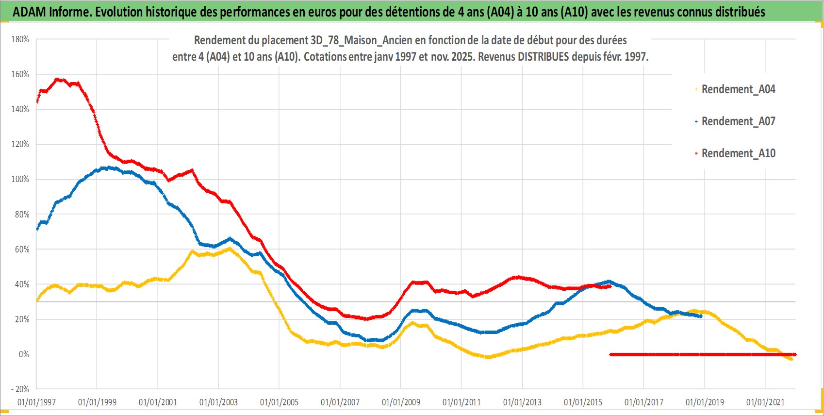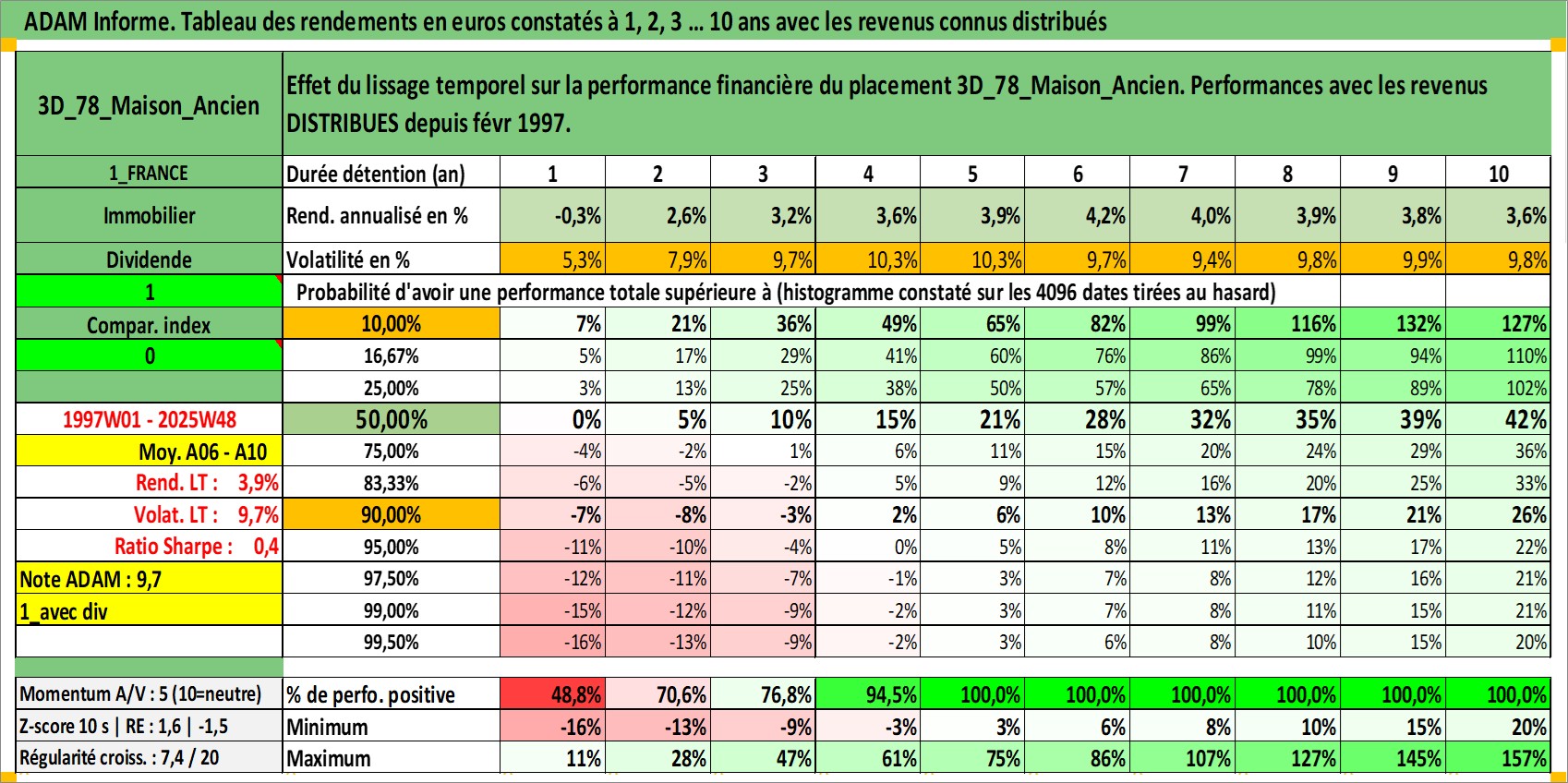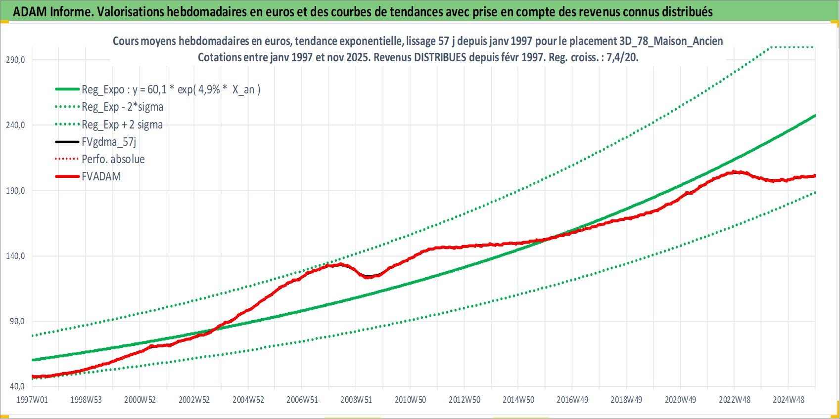 Site dédié aux investisseursPage dédiée sur site financeAnalyse des valorisations hebdomadaires de l'actif 3D_78_Maison_Ancien. Cet actif est cote en EUR. Les valorisations couvrent les semaines 1997W01 a 2025W48. Les loyers de cet actif immobilier sont pris egaux a 3,33% annuels de la valeur venale du logement.