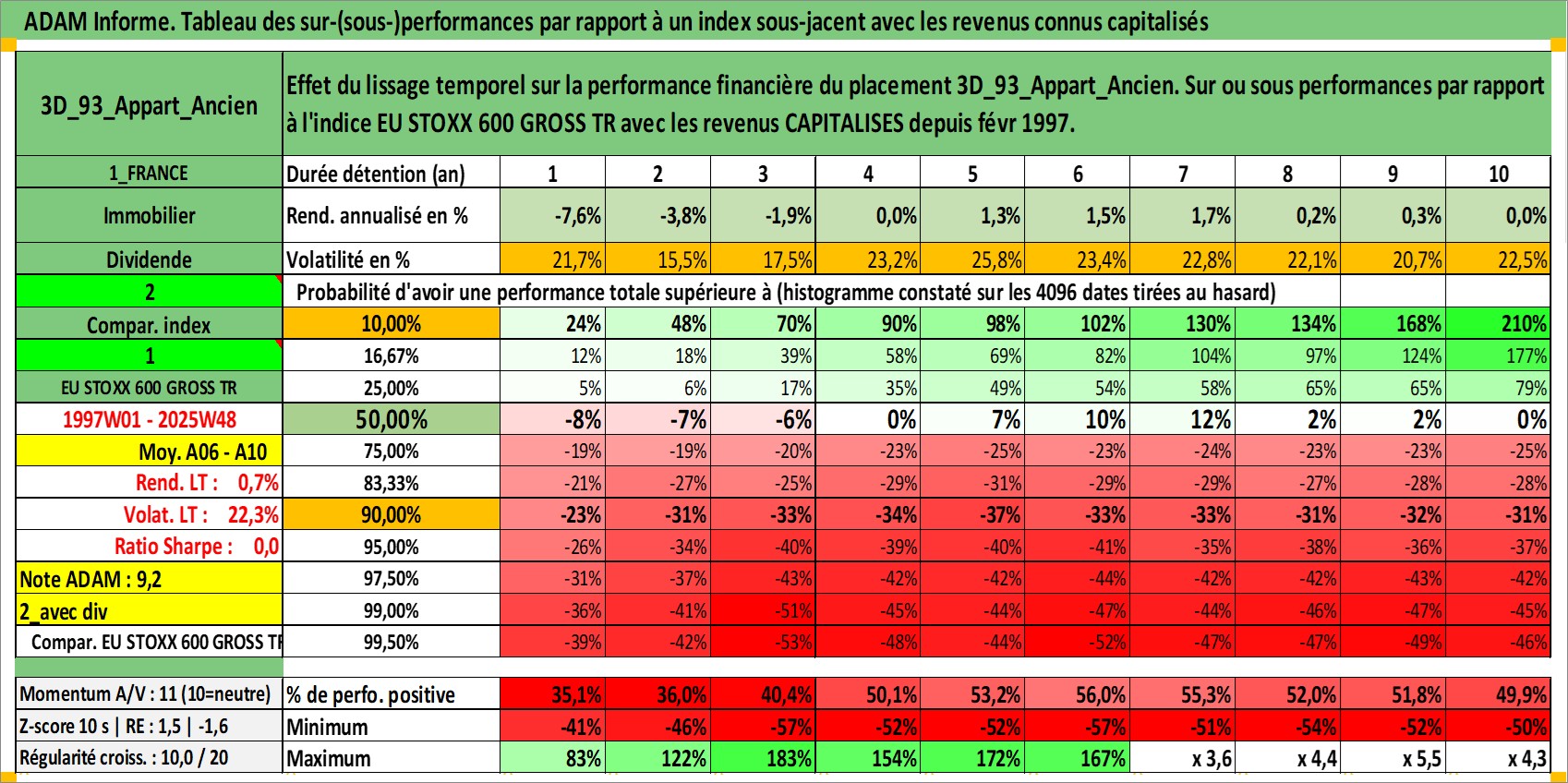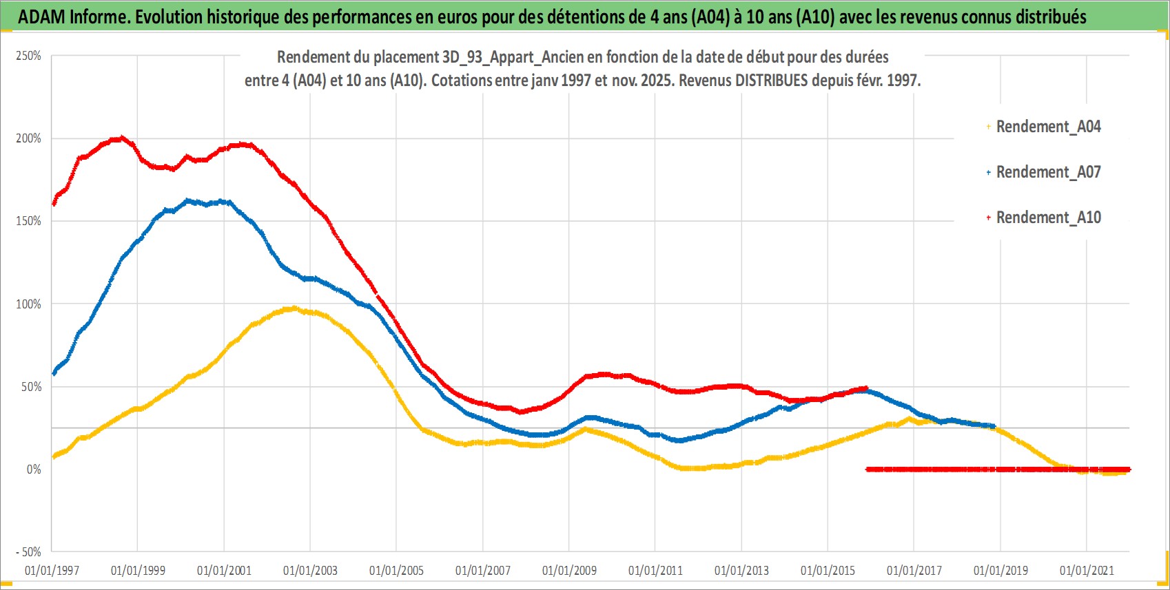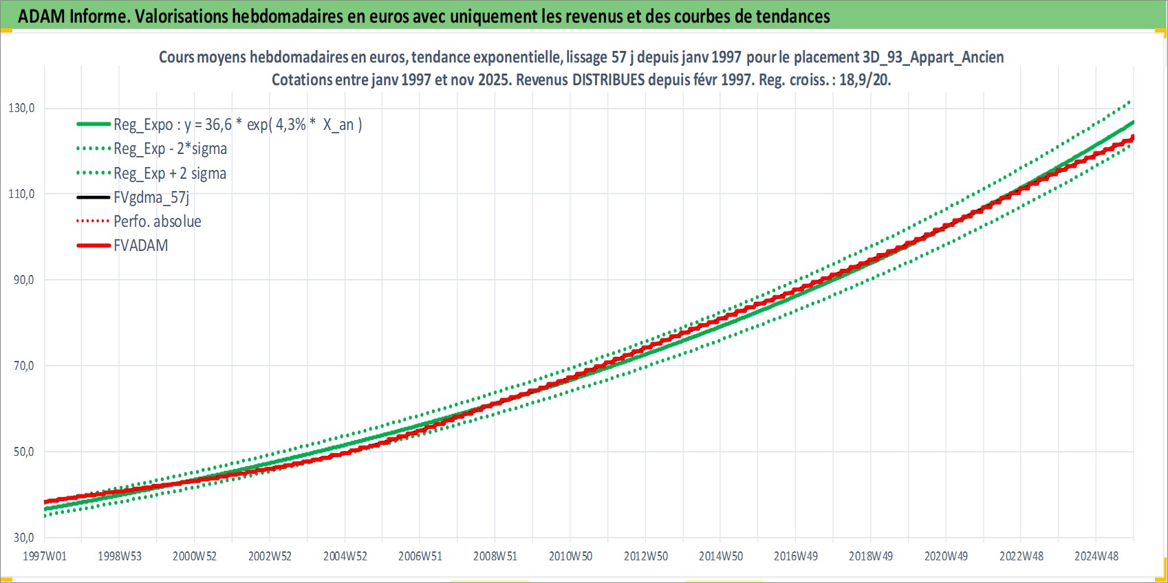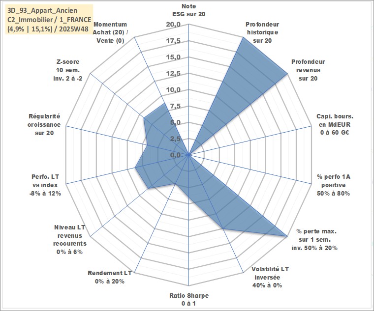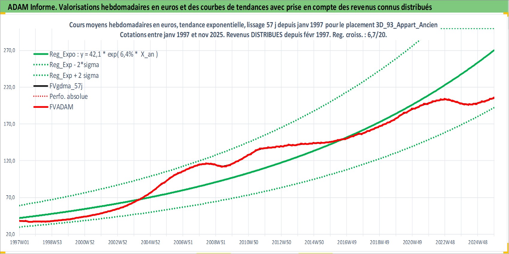 Site dédié aux investisseursPage dédiée sur site financeAnalyse des valorisations hebdomadaires de l'actif 3D_93_Appart_Ancien. Cet actif est cote en EUR. Les valorisations couvrent les semaines 1997W01 a 2025W48. Les loyers de cet actif immobilier sont pris egaux a 3,33% annuels de la valeur venale du logement.