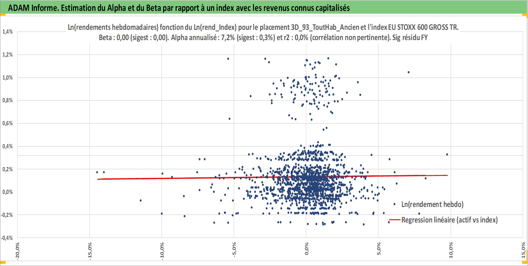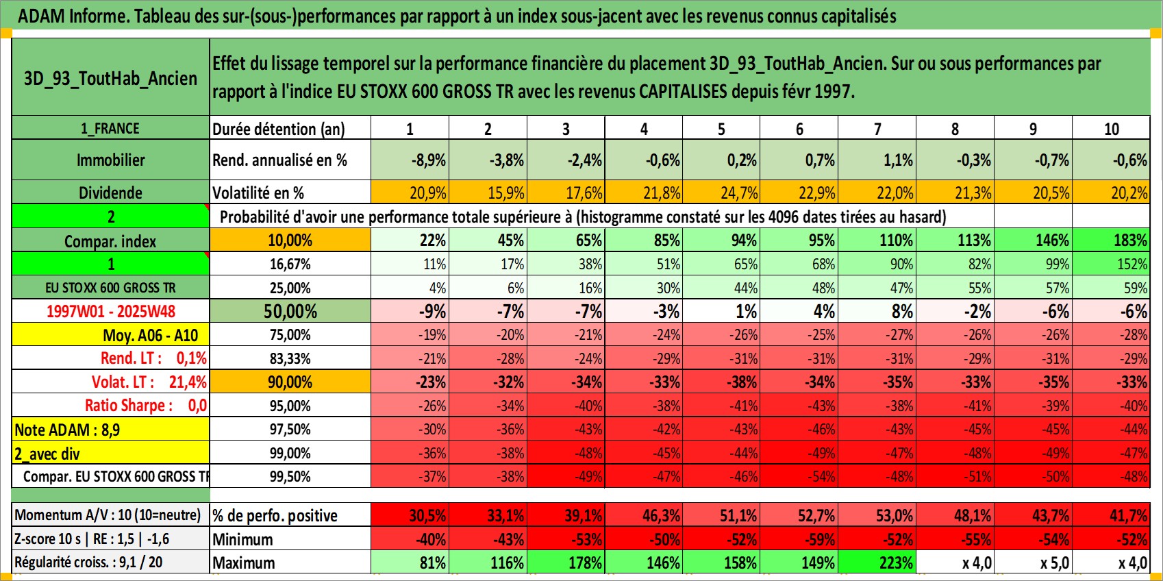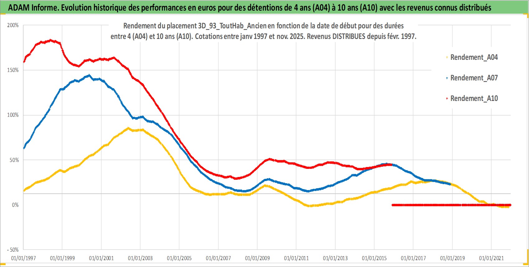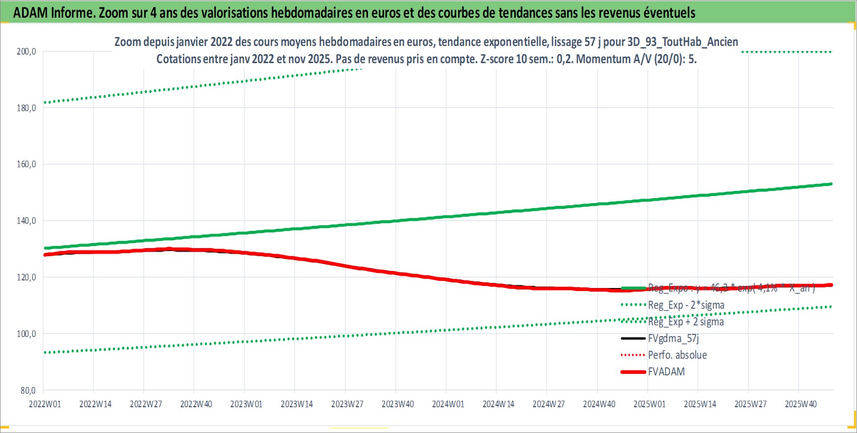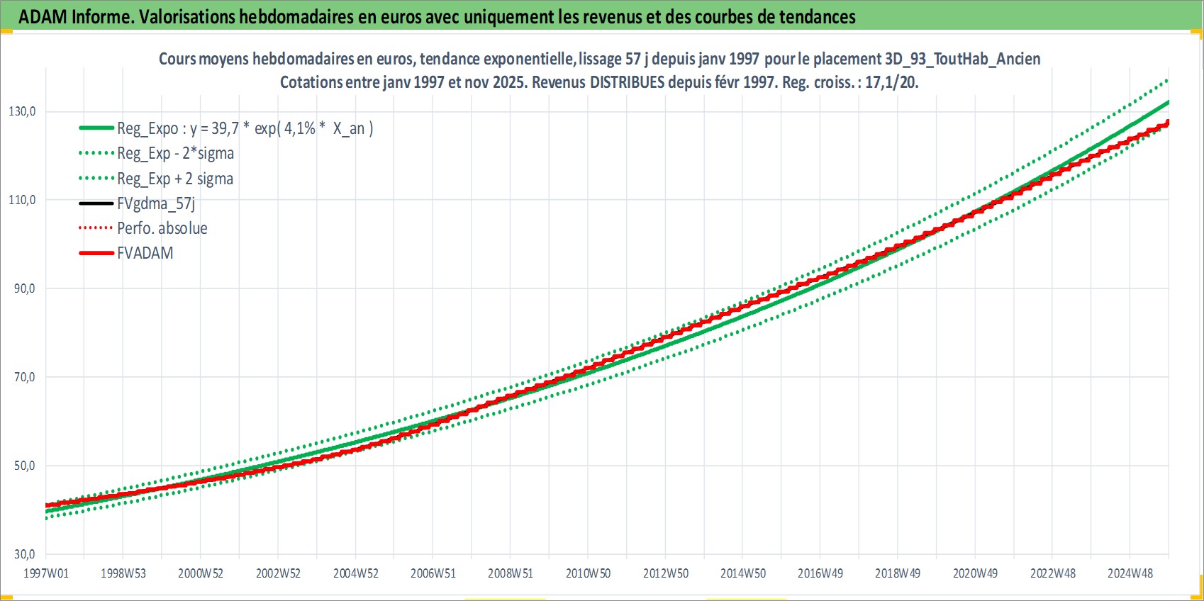 Site dédié aux investisseursPage dédiée sur site financeAnalyse des valorisations hebdomadaires de l'actif 3D_93_ToutHab_Ancien. Cet actif est cote en EUR. Les valorisations couvrent les semaines 1997W01 a 2025W48. Les loyers de cet actif immobilier sont pris egaux a 3,33% annuels de la valeur venale du logement.
