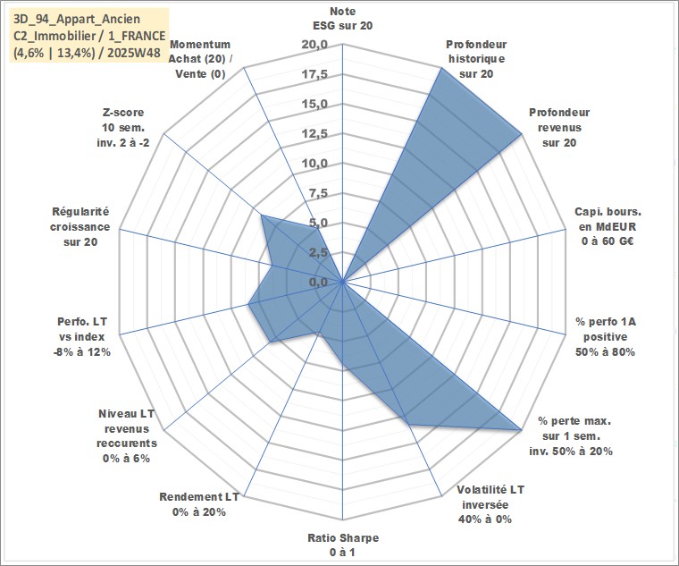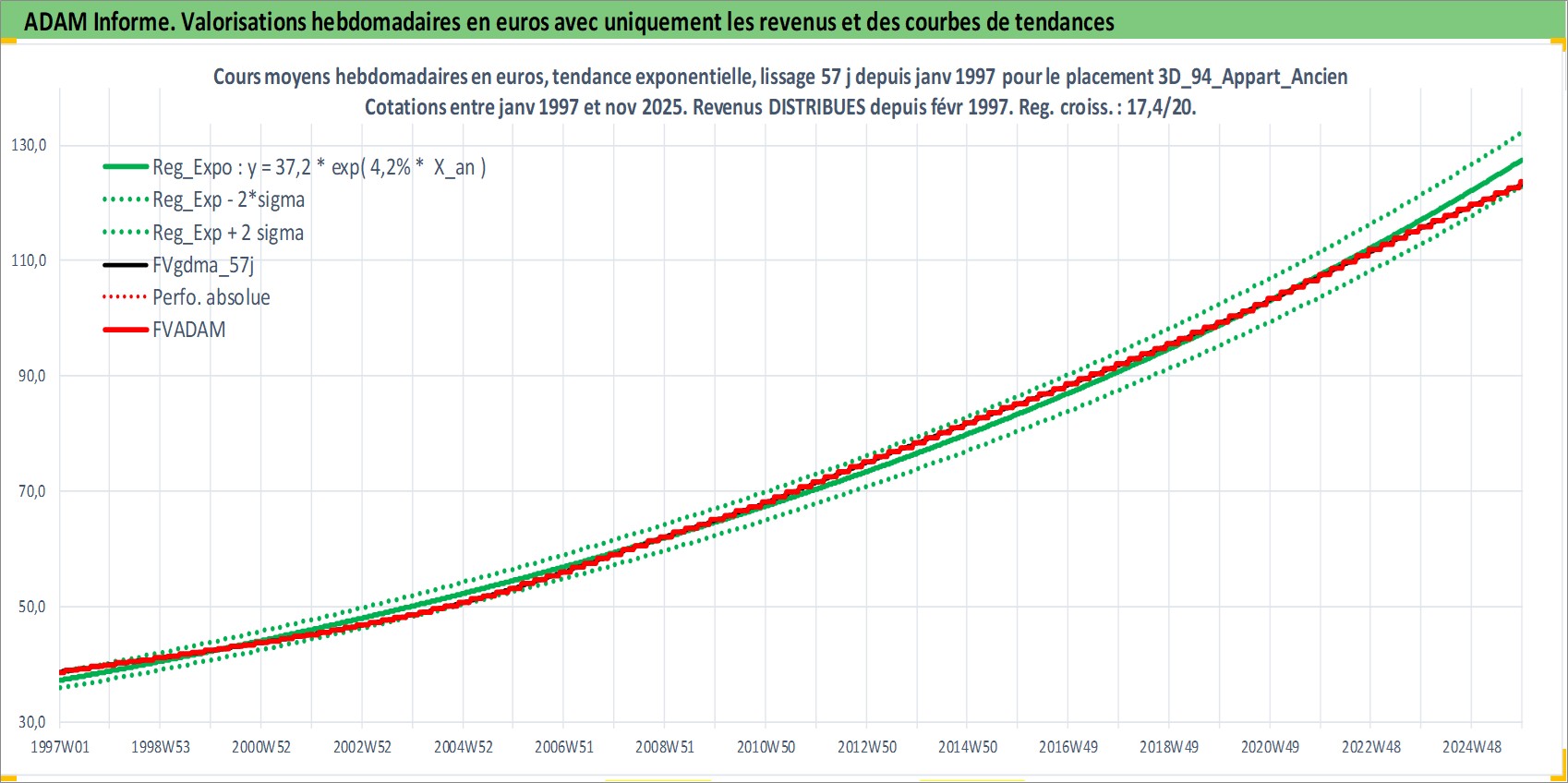 Site dédié aux investisseursPage dédiée sur site financeAnalyse des valorisations hebdomadaires de l'actif 3D_94_Appart_Ancien. Cet actif est cote en EUR. Les valorisations couvrent les semaines 1997W01 a 2025W48. Les loyers de cet actif immobilier sont pris egaux a 3,33% annuels de la valeur venale du logement.
