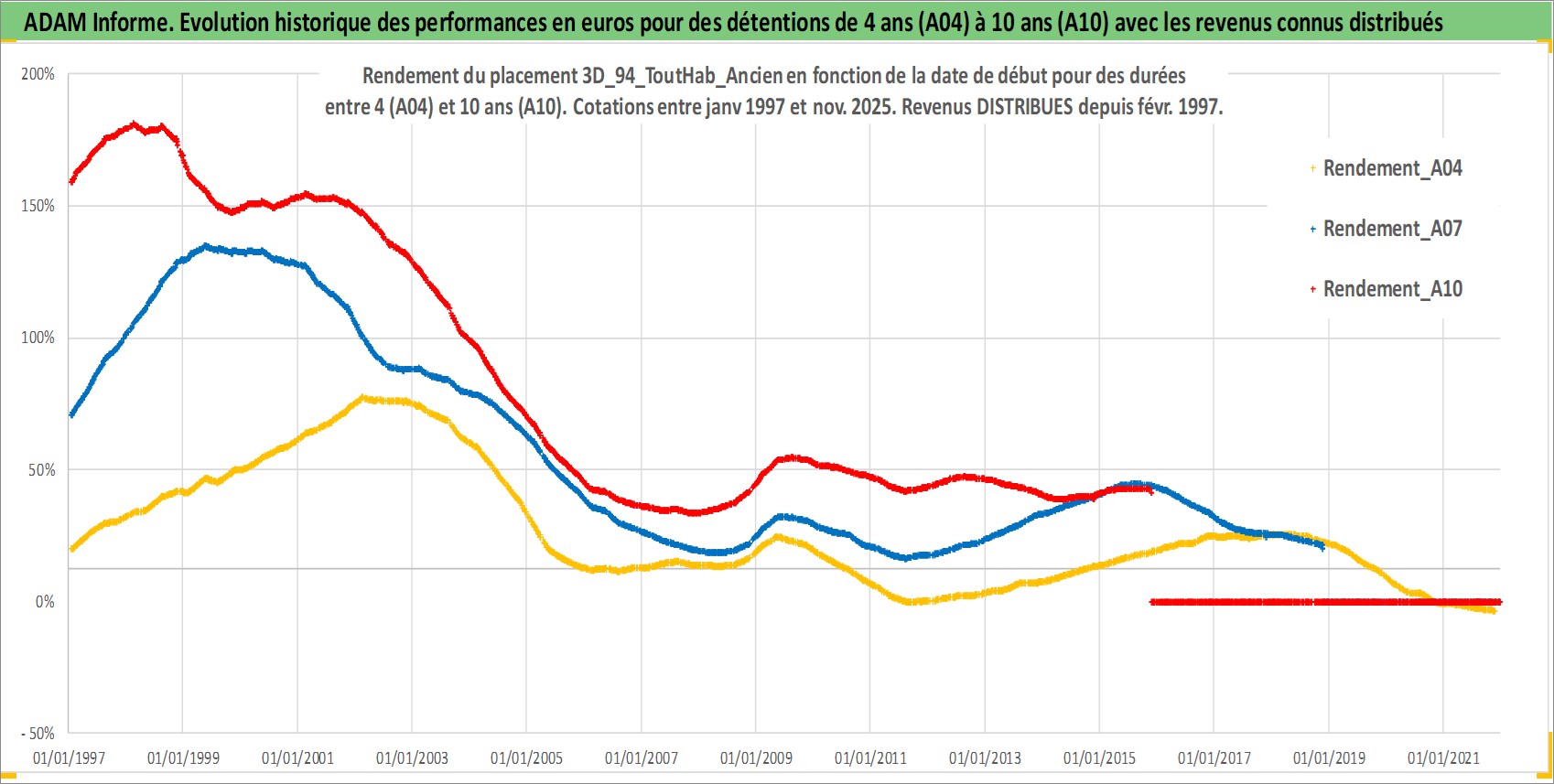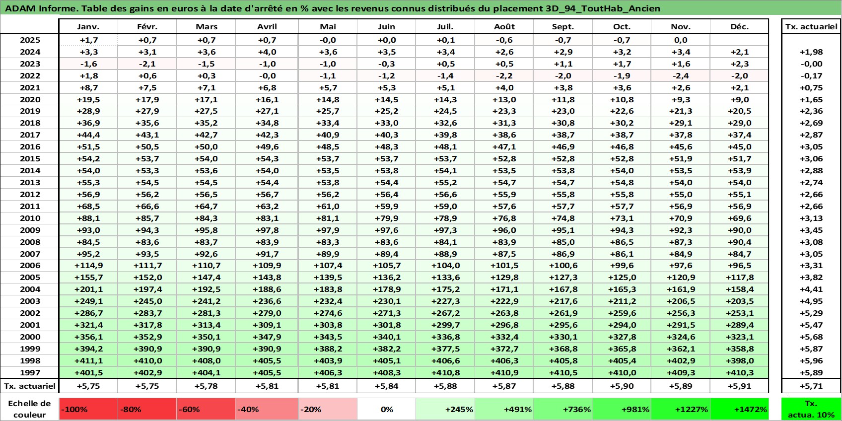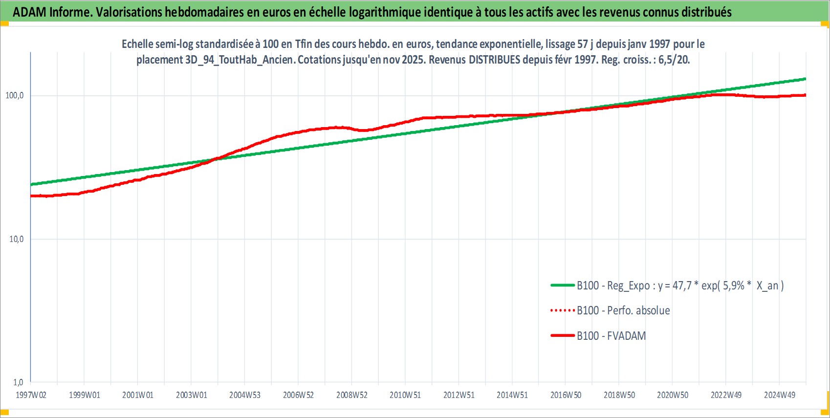 Site dédié aux investisseursPage dédiée sur site financeAnalyse des valorisations hebdomadaires de l'actif 3D_94_ToutHab_Ancien. Cet actif est cote en EUR. Les valorisations couvrent les semaines 1997W01 a 2025W48. Les loyers de cet actif immobilier sont pris egaux a 3,33% annuels de la valeur venale du logement.