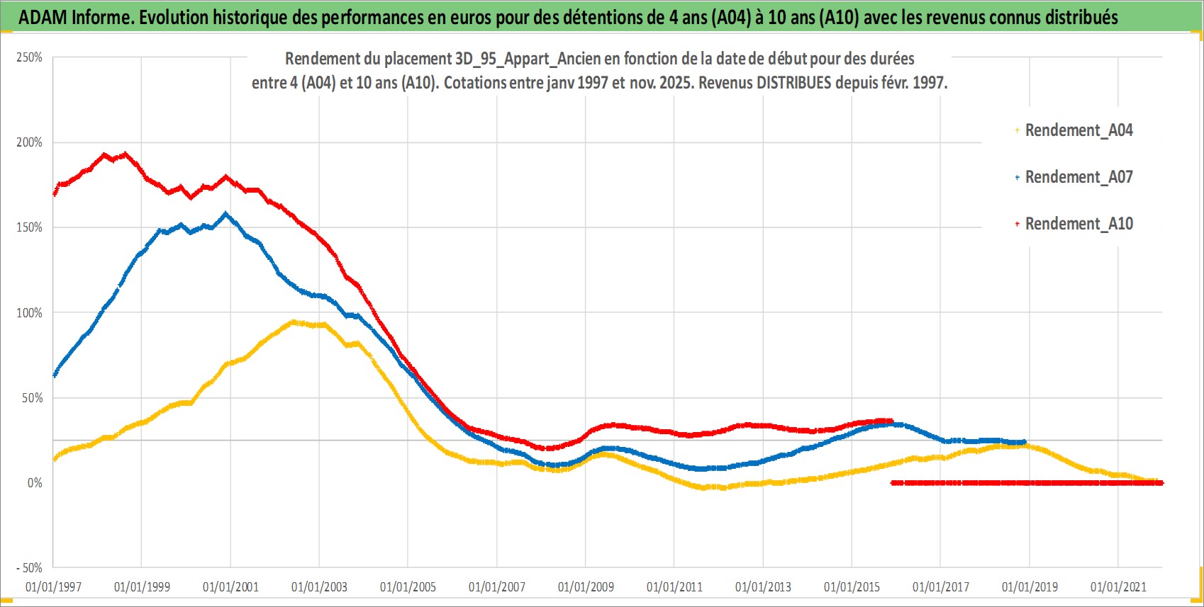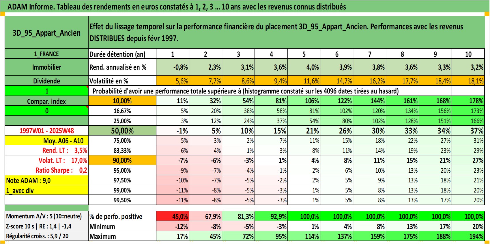 Site dédié aux investisseursPage dédiée sur site financeAnalyse des valorisations hebdomadaires de l'actif 3D_95_Appart_Ancien. Cet actif est cote en EUR. Les valorisations couvrent les semaines 1997W01 a 2025W48. Les loyers de cet actif immobilier sont pris egaux a 3,33% annuels de la valeur venale du logement.