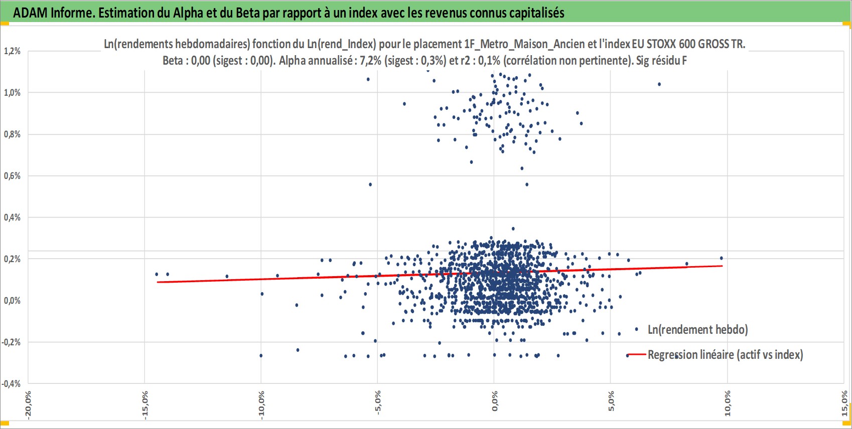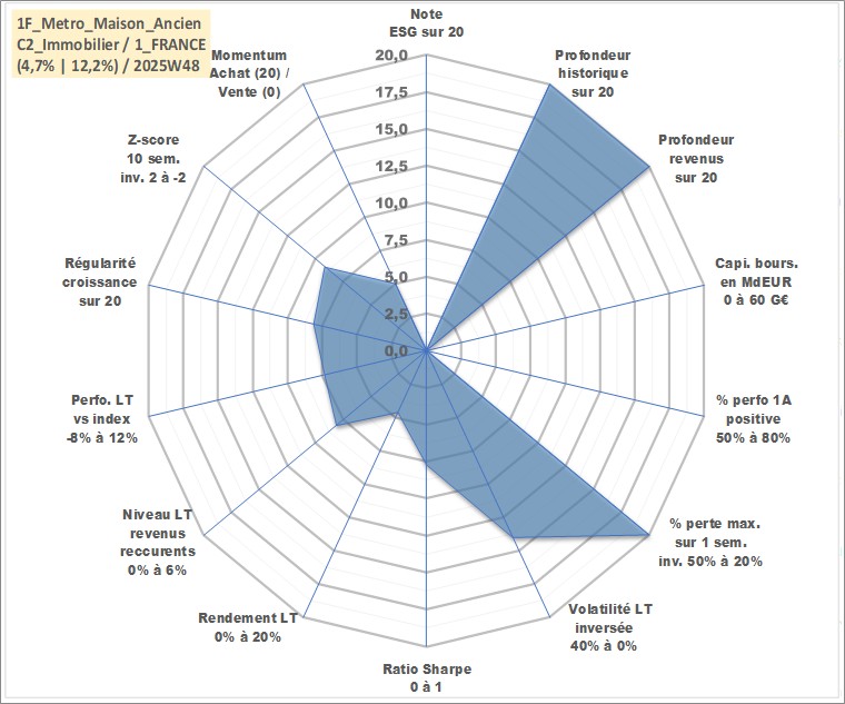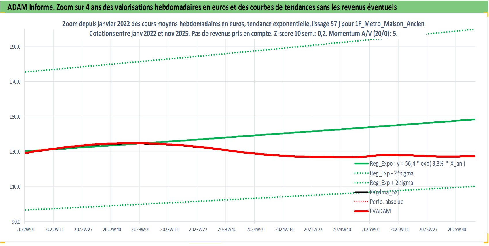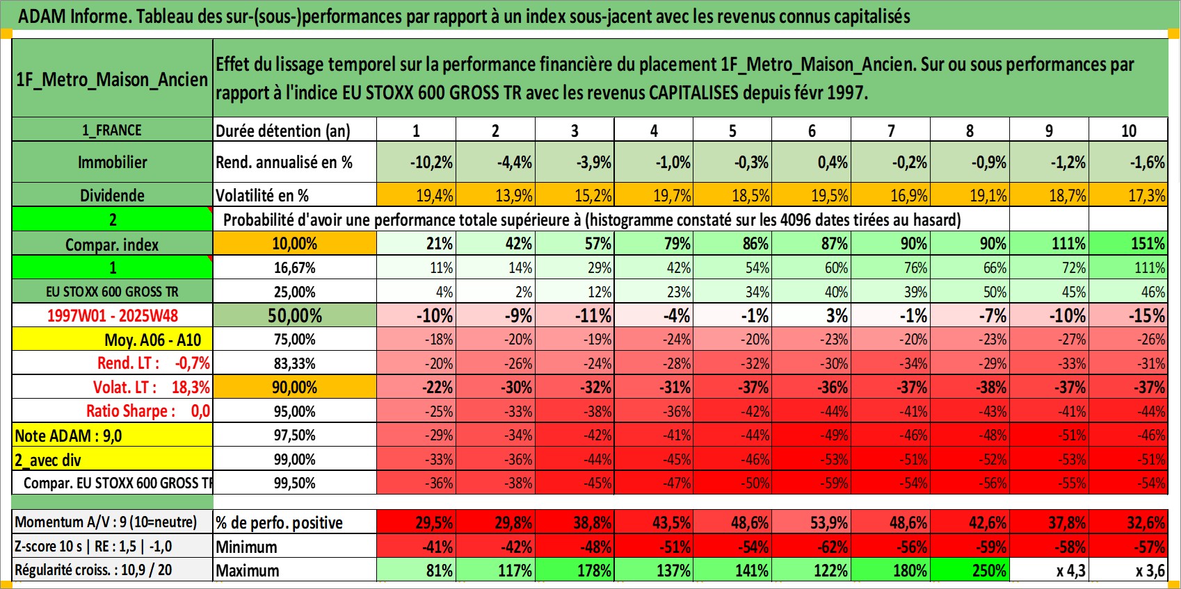 Site dédié aux investisseursPage dédiée sur site financeAnalyse des valorisations hebdomadaires de l'actif 1F_Metro_Maison_Ancien. Cet actif est cote en EUR. Les valorisations couvrent les semaines 1997W01 a 2025W48. Les loyers de cet actif immobilier sont pris egaux a 3,33% annuels de la valeur venale du logement.