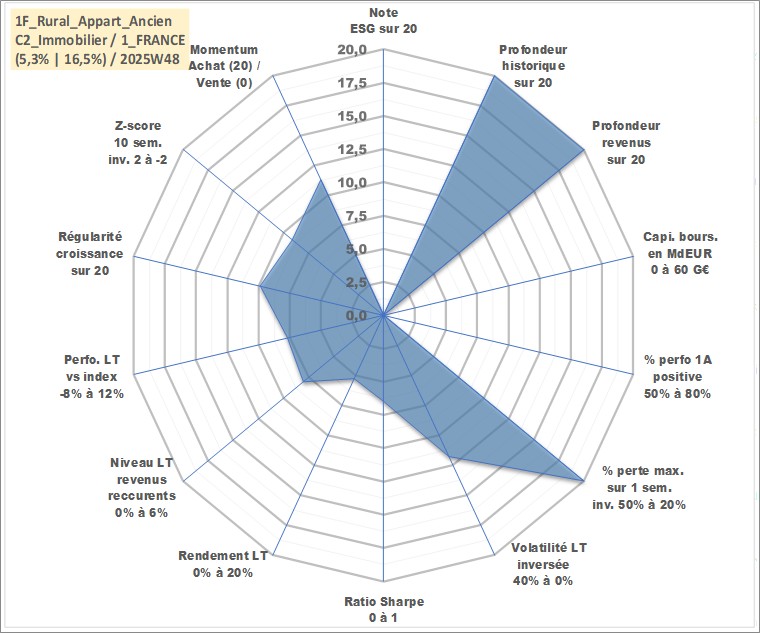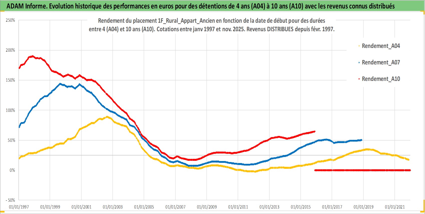 Site dédié aux investisseursPage dédiée sur site financeAnalyse des valorisations hebdomadaires de l'actif 1F_Rural_Appart_Ancien. Cet actif est cote en EUR. Les valorisations couvrent les semaines 1997W01 a 2025W48. Les loyers de cet actif immobilier sont pris egaux a 3,33% annuels de la valeur venale du logement.